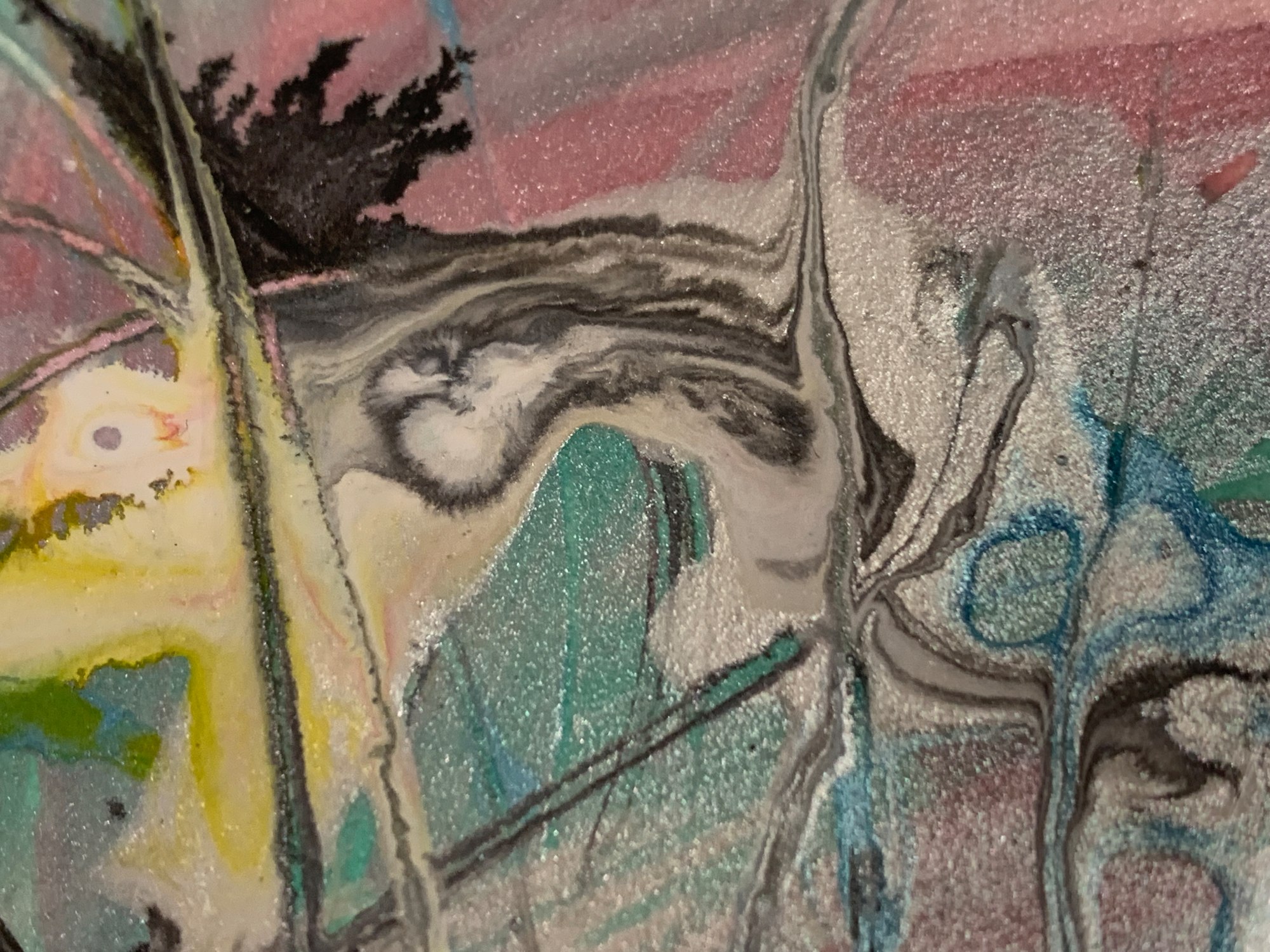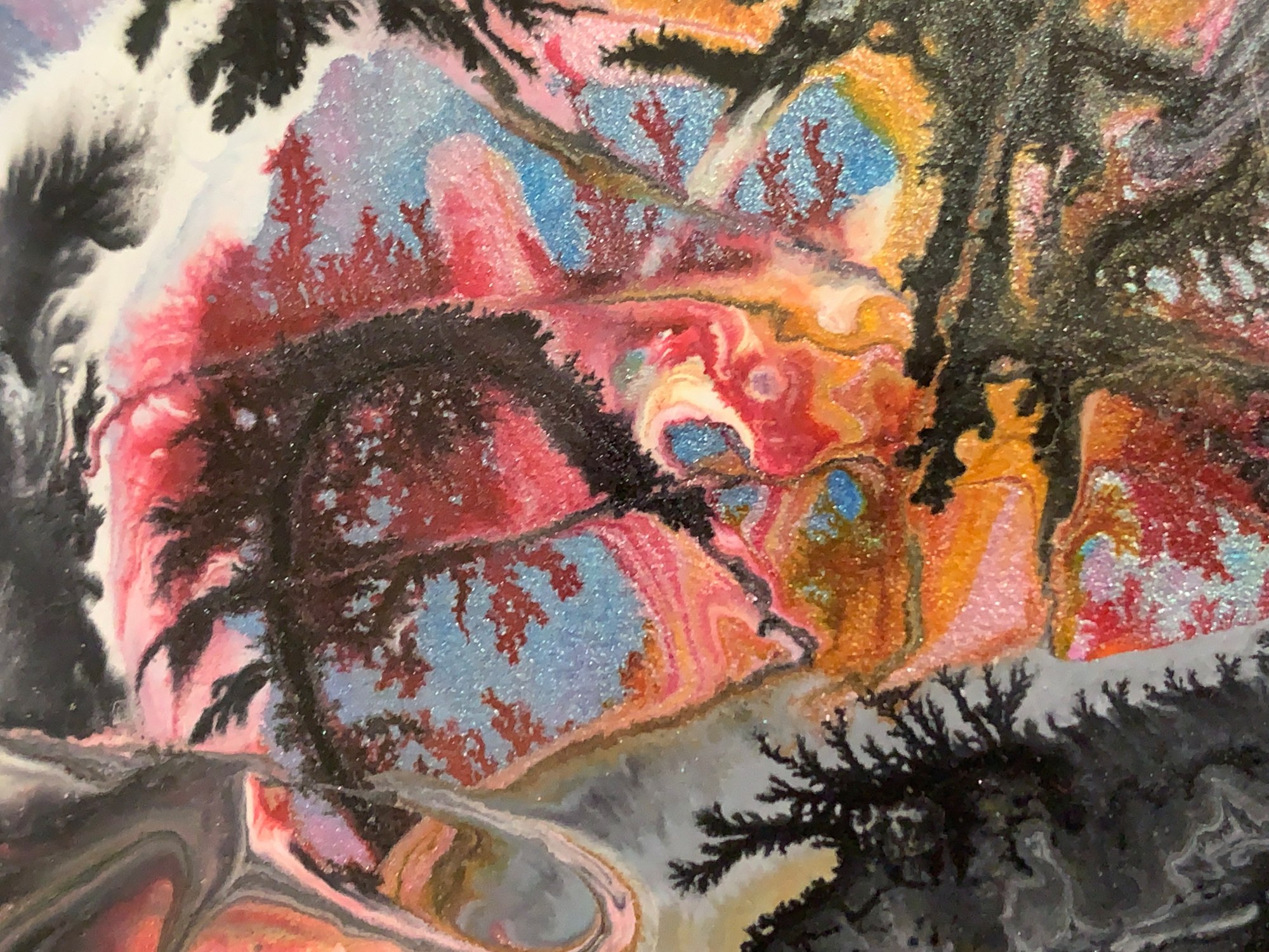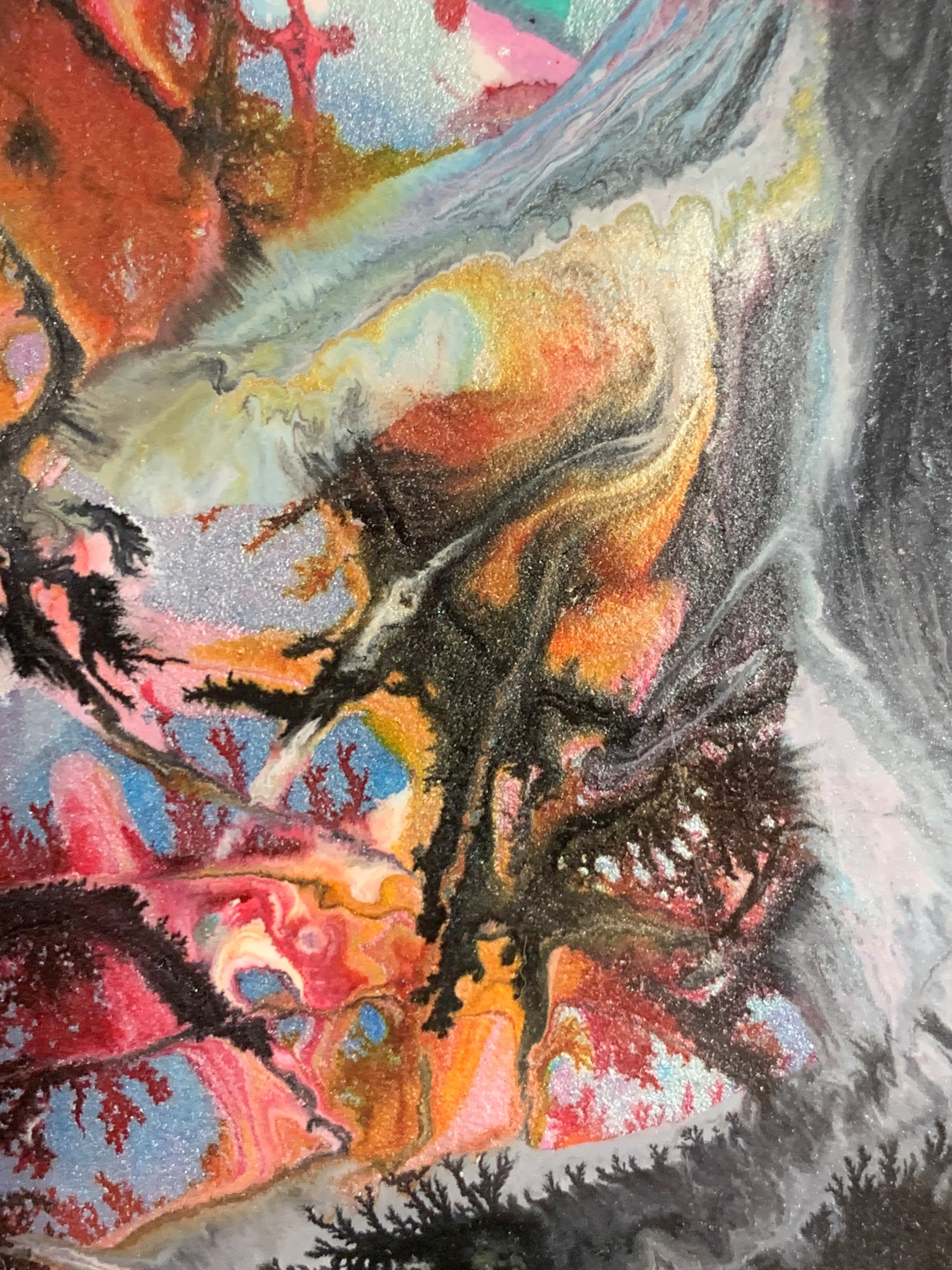 This painting has multiple zones in it, despite it's small size. That is to say there are different things going on in different segments of the painting. This is atypical for an entanglement paining, which tend to be fairly homogenous at a medium scale. There is more of a sense of space between the layers in this painting than most Entanglement paintings as well. It's almost more an alien landscape than a cosmic starscape.