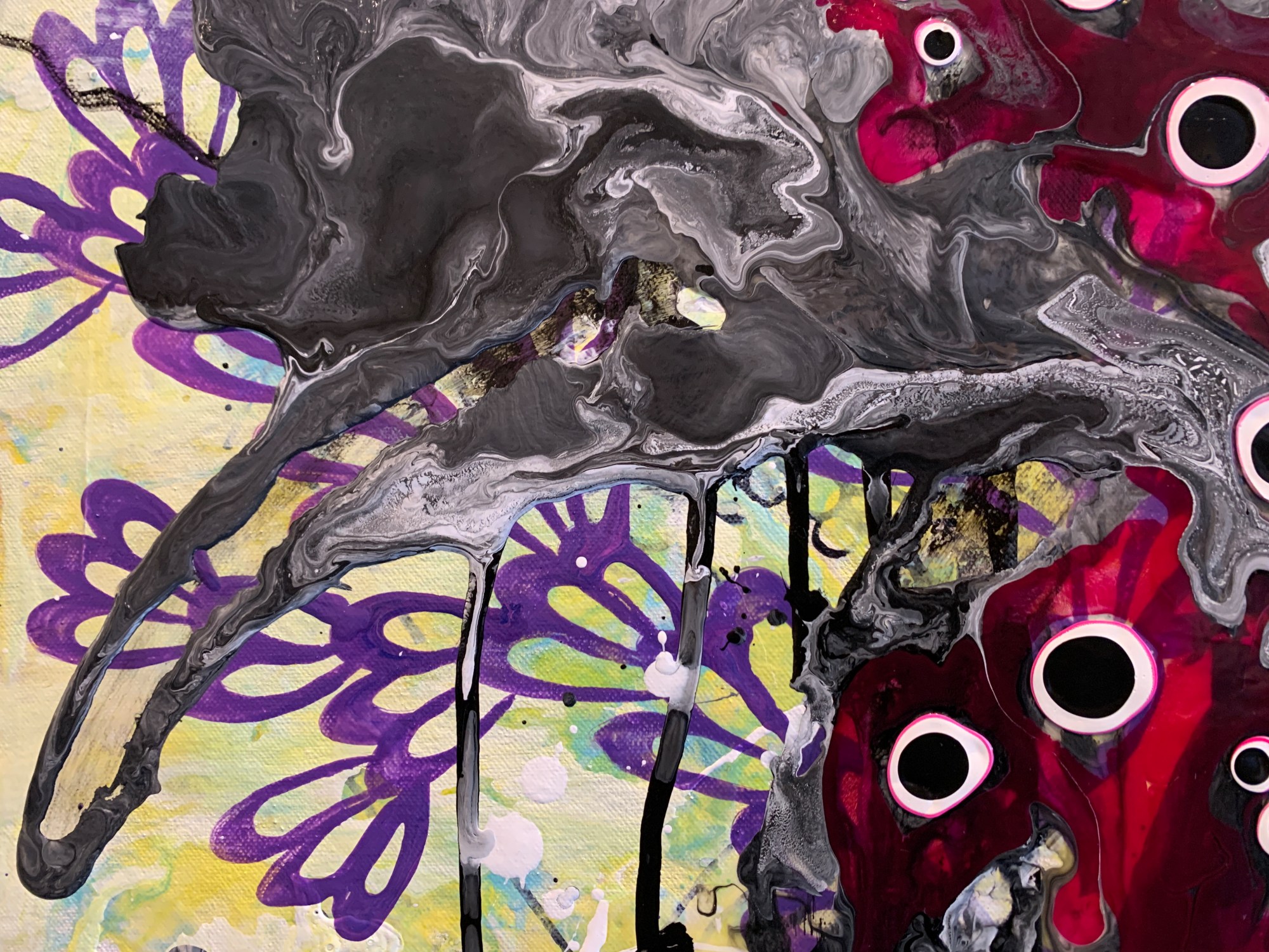 This painting makes excellent use of my layering technique to set ordered and chaotic elements against each other to create a sense of space within the painting. A delicate organic formation composed of carefully brushed purple leaves seems to grow between a brutal black and white foreground of poured and smeared paint and a background of blue to yellow mottled gradient reminiscent of a pastoral landscape. Beneath it all is a scaffolding of automatic doodles and drawn patterns in Sharpie marker and in places the raw canvas is visible.