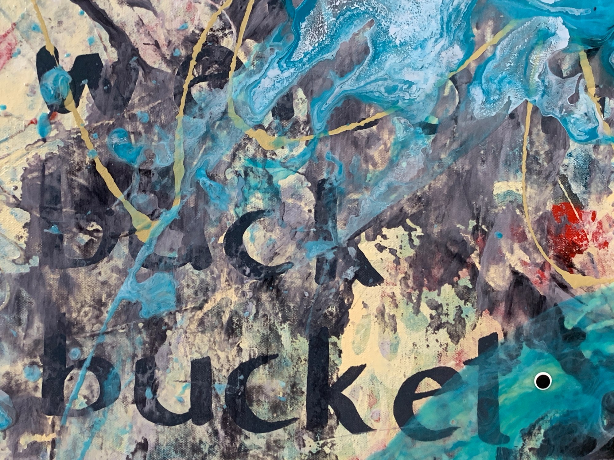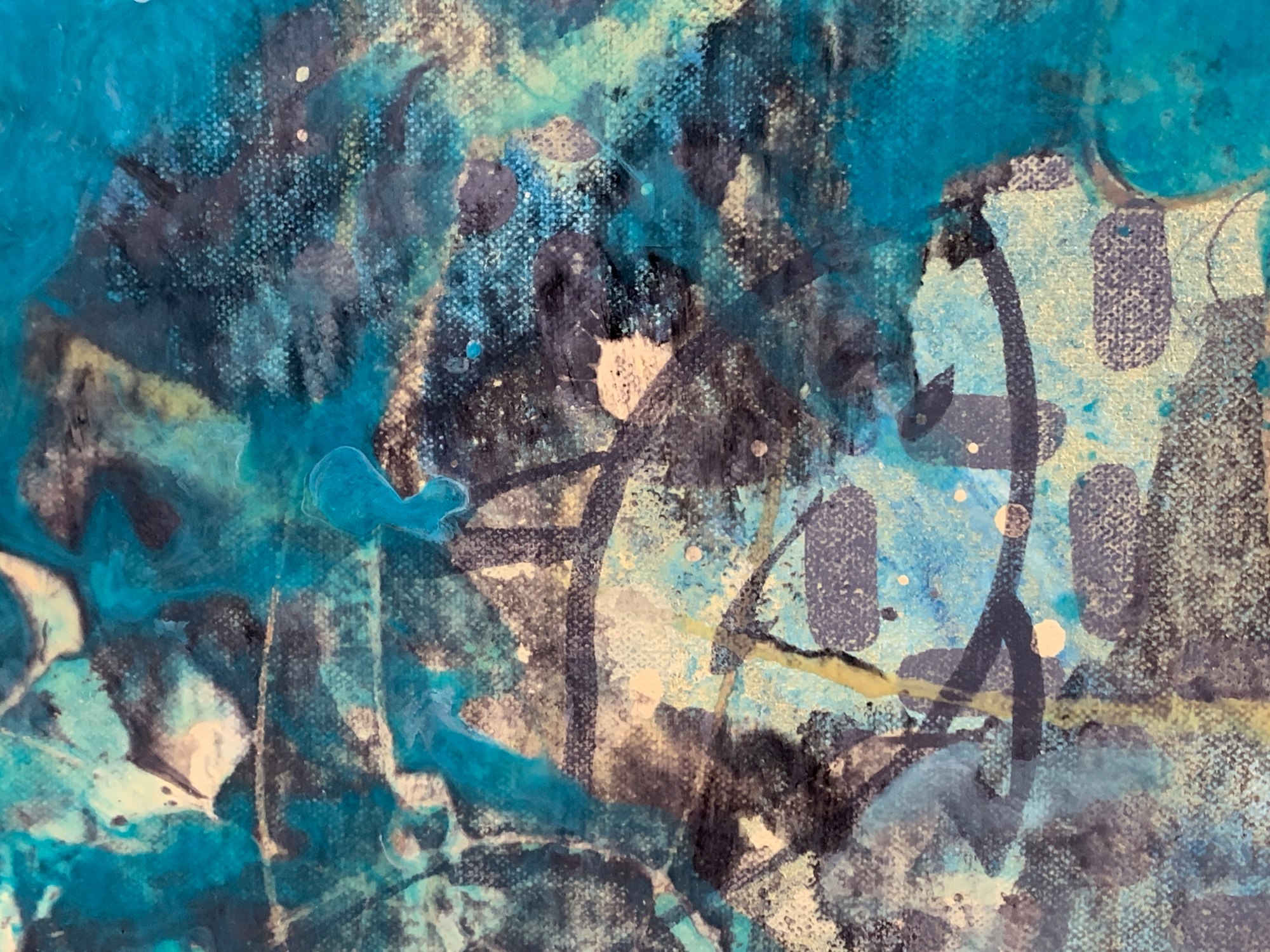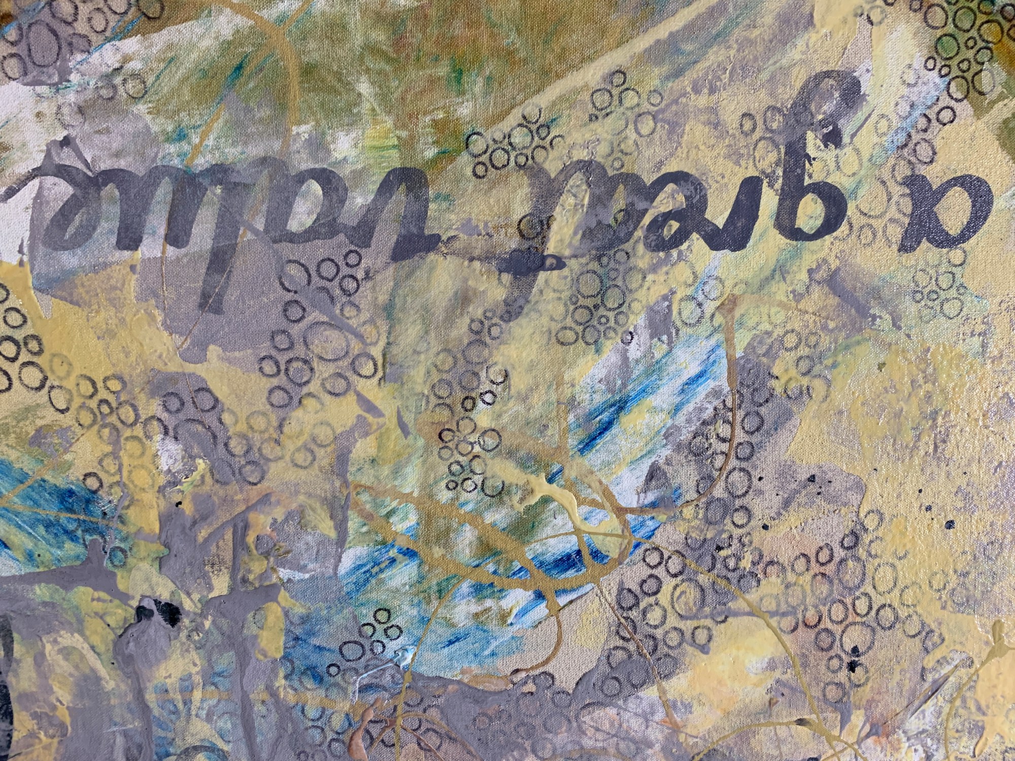 This is a painting that I am signing as 2021 but was really my last painting of 2020. It sat in my studio for quite a while, stretched and leaning against a wall but undocumented and un-signed. (The date of signature is the date I consider a painting complete.) I don't really know why, I'm in love with this painting. It's got so much going on in it, but it holds its center in a sort of peaceful environment. It's like looking down into a pond and across the horizon at the trees and into deep space and deep into the structure of the atom all at once.