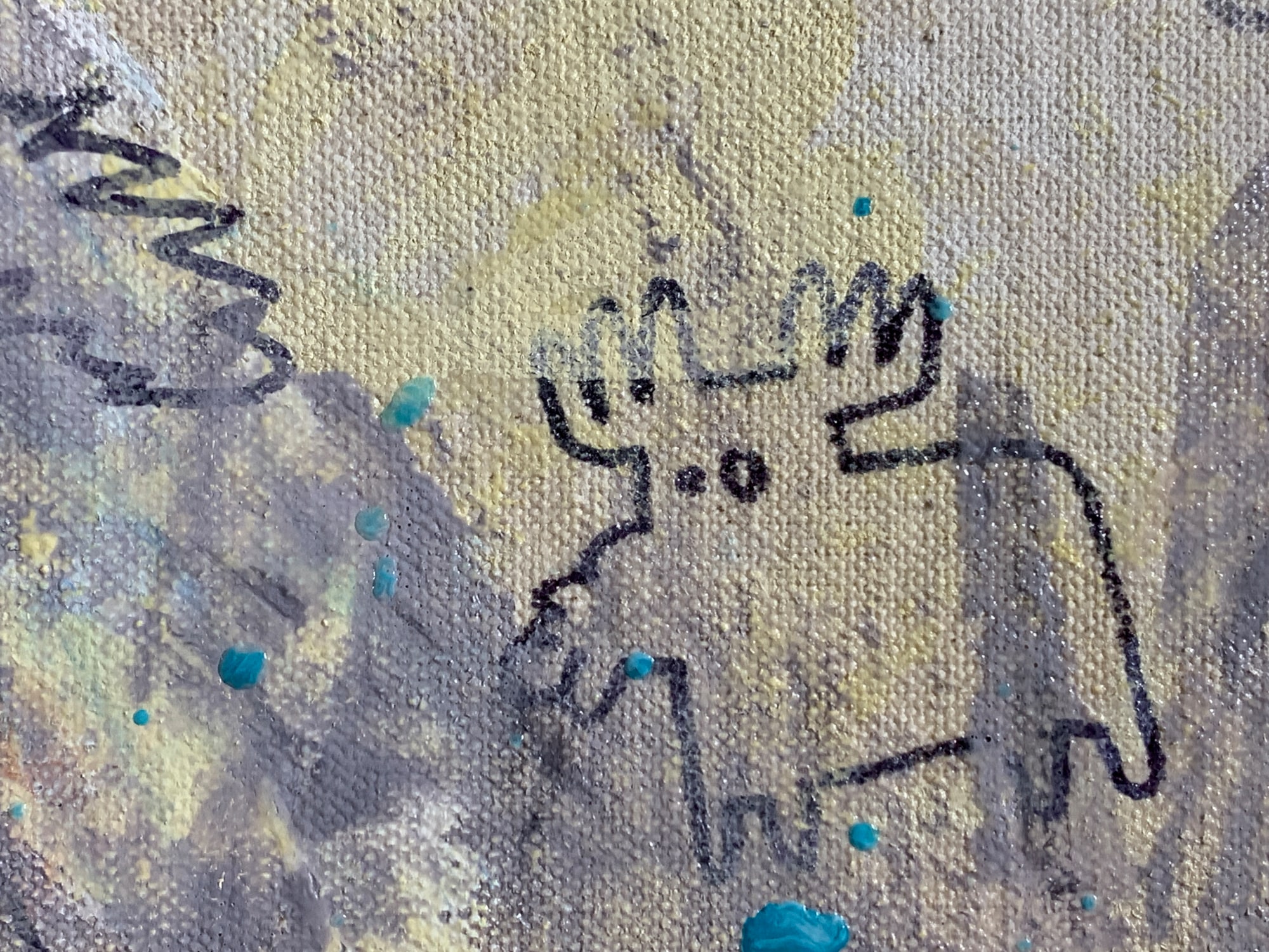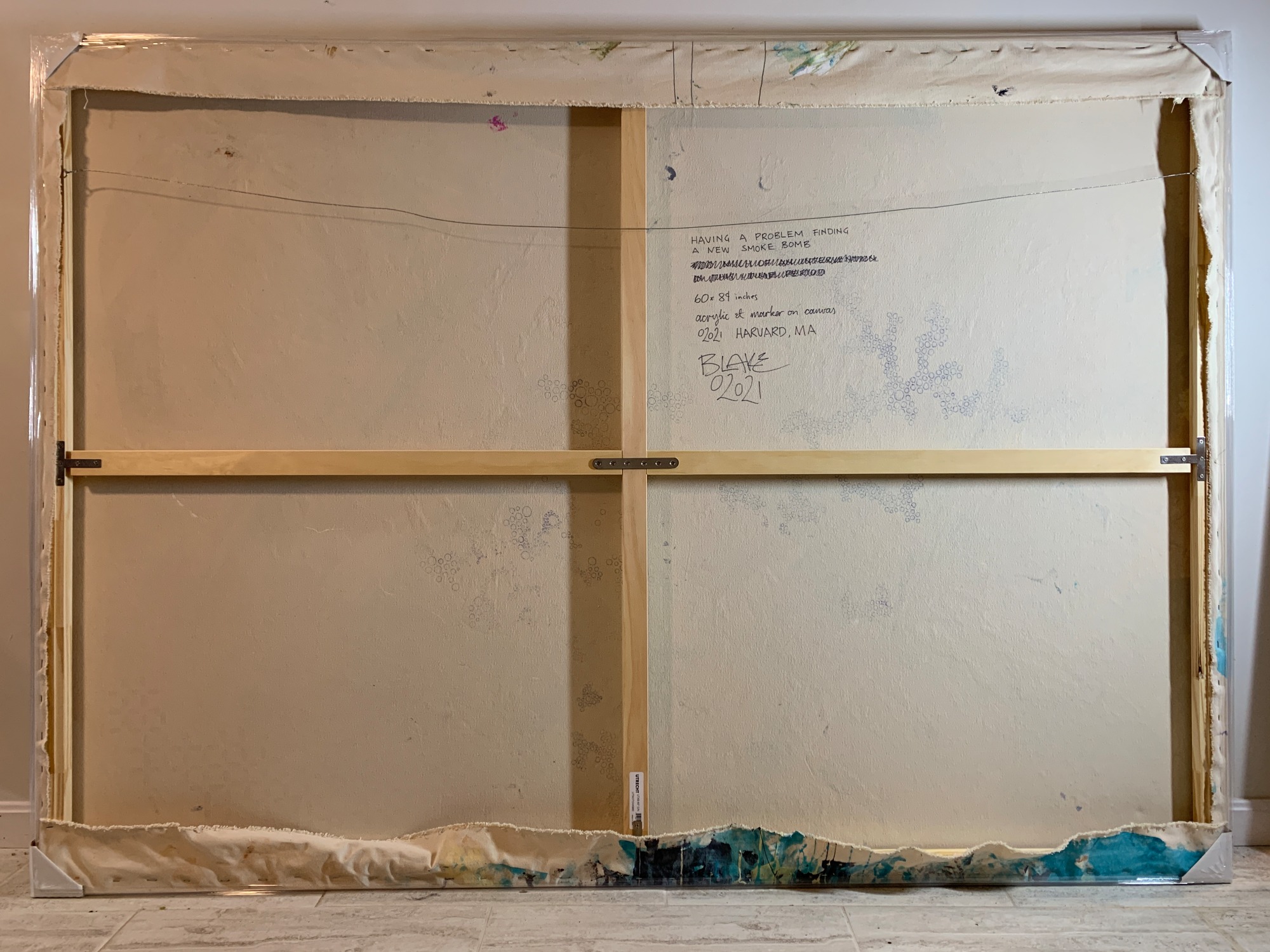 This is acrylic and marker on raw (unprimed) canvas stretched over gallery depth (1.5 inch) stretcher bars. The painting is ready to hang with a wire installed on the back.