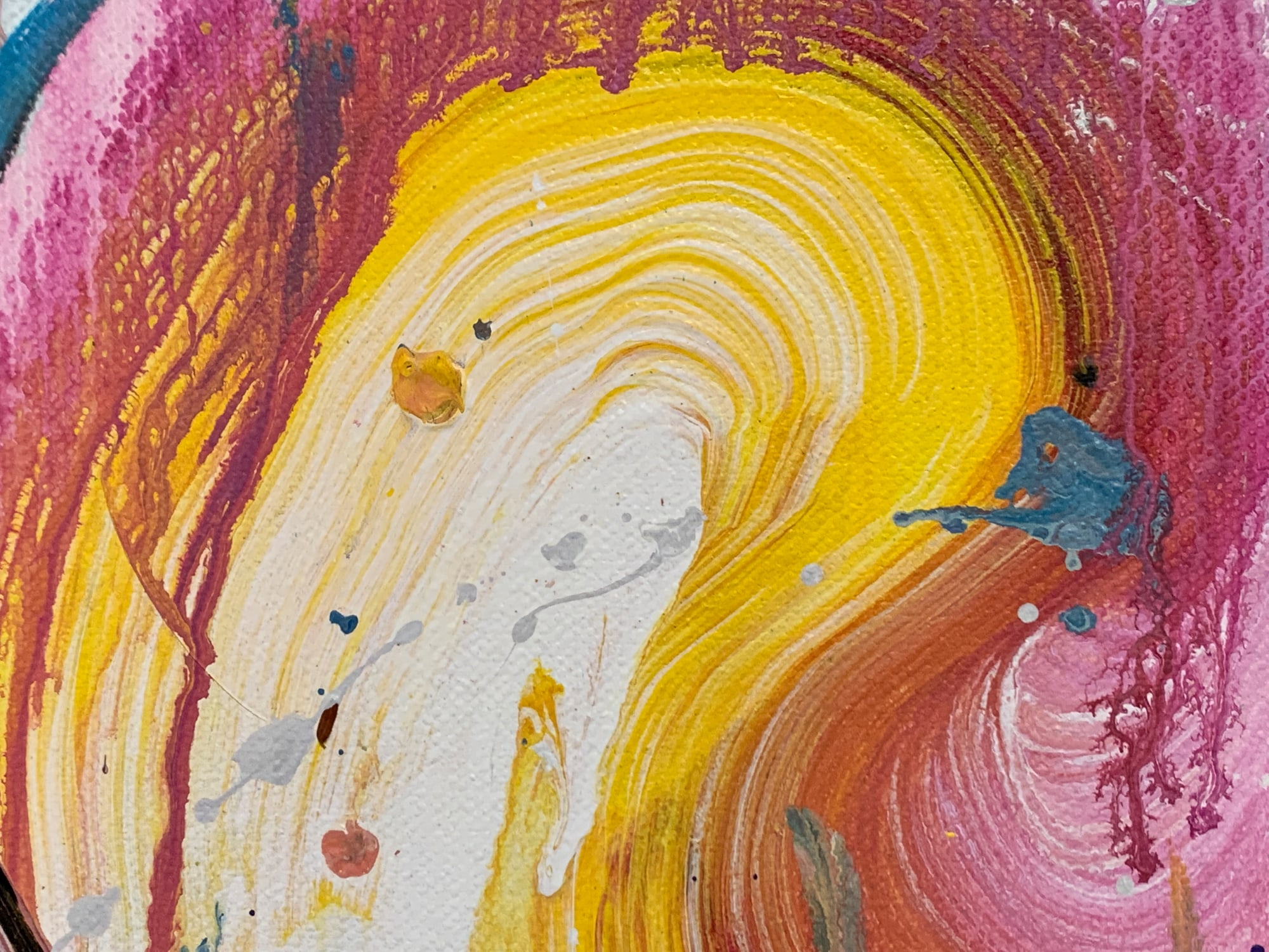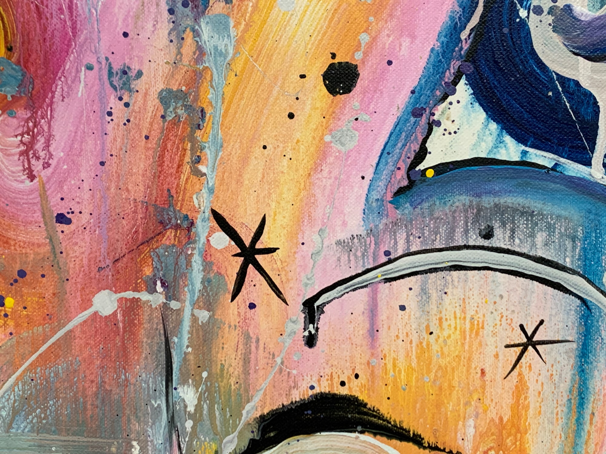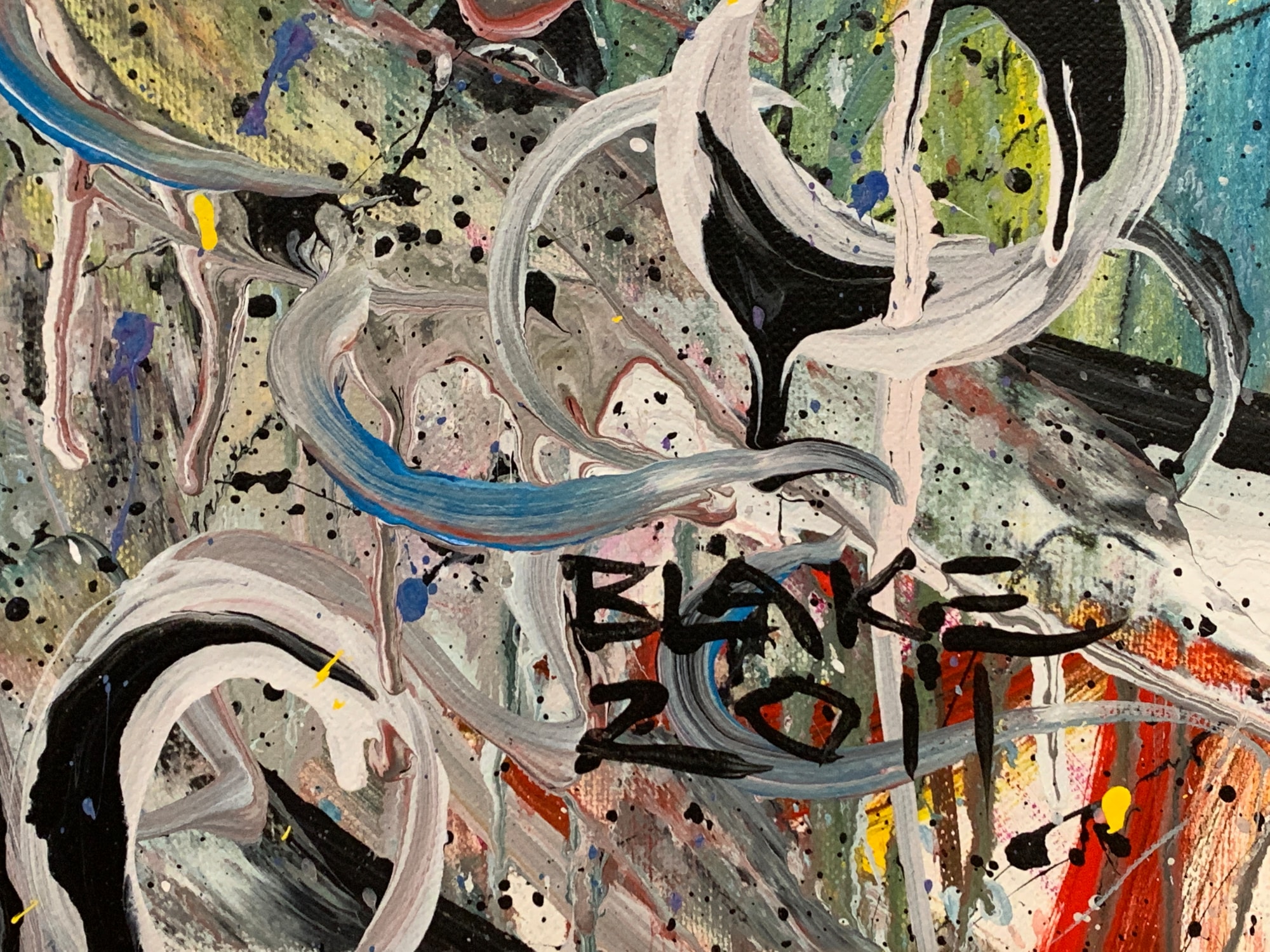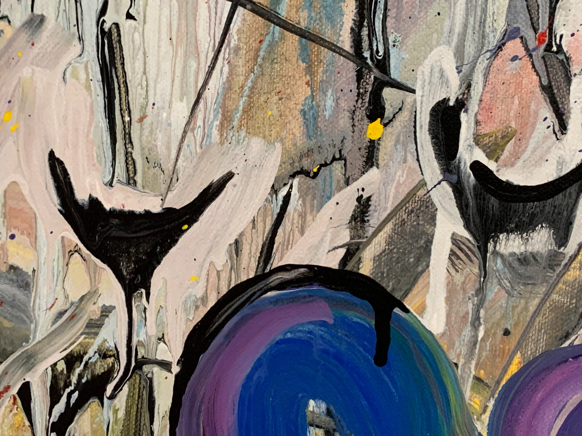 This is a lyrical abstract composition in acrylic on canvas. It features a lot of brushwork and wet-on-wet layering of paints. Doodles in acrylic are incorporated into the all-over composition, creating a sinuous path through the piece and providing resting places for the eye along the way.