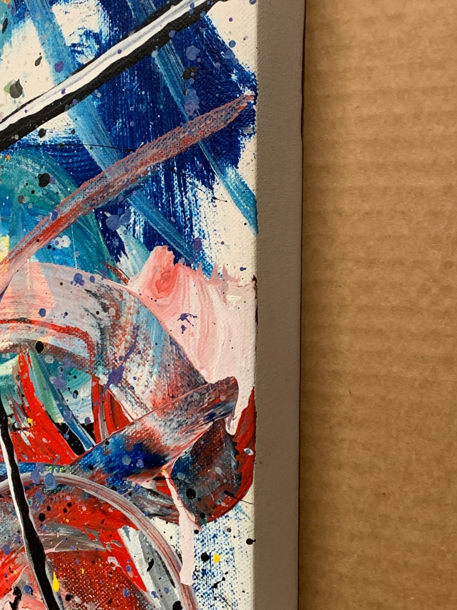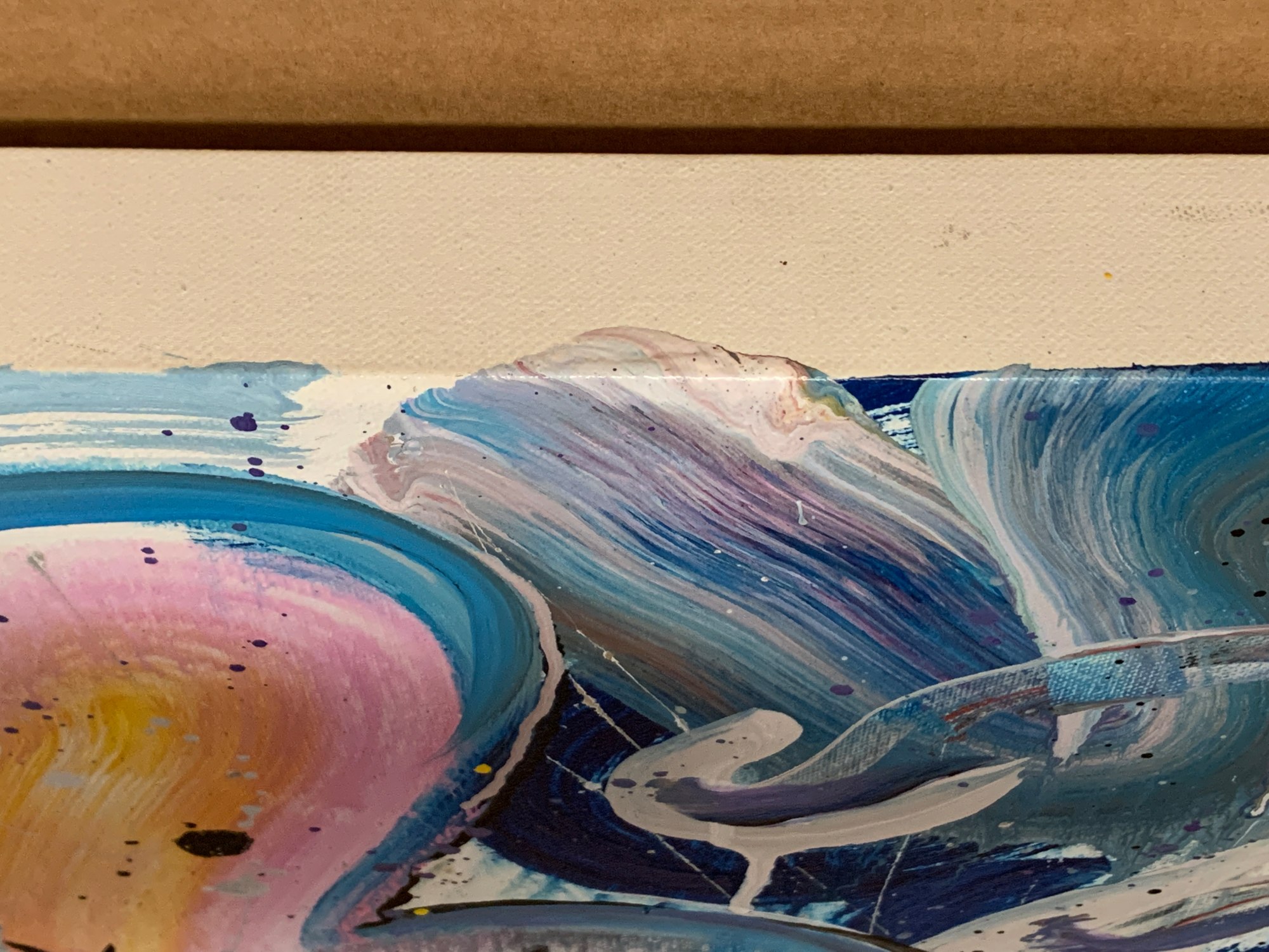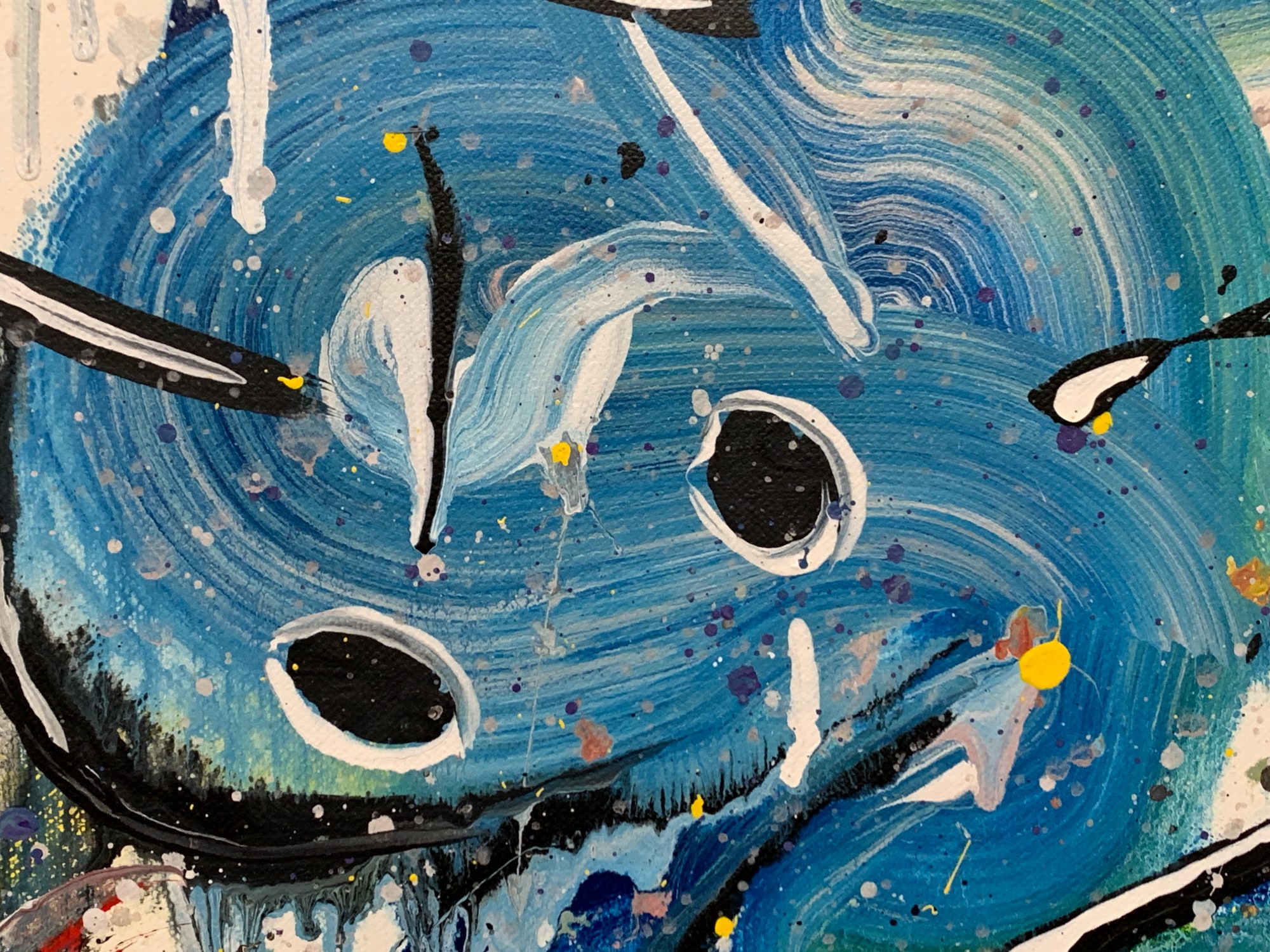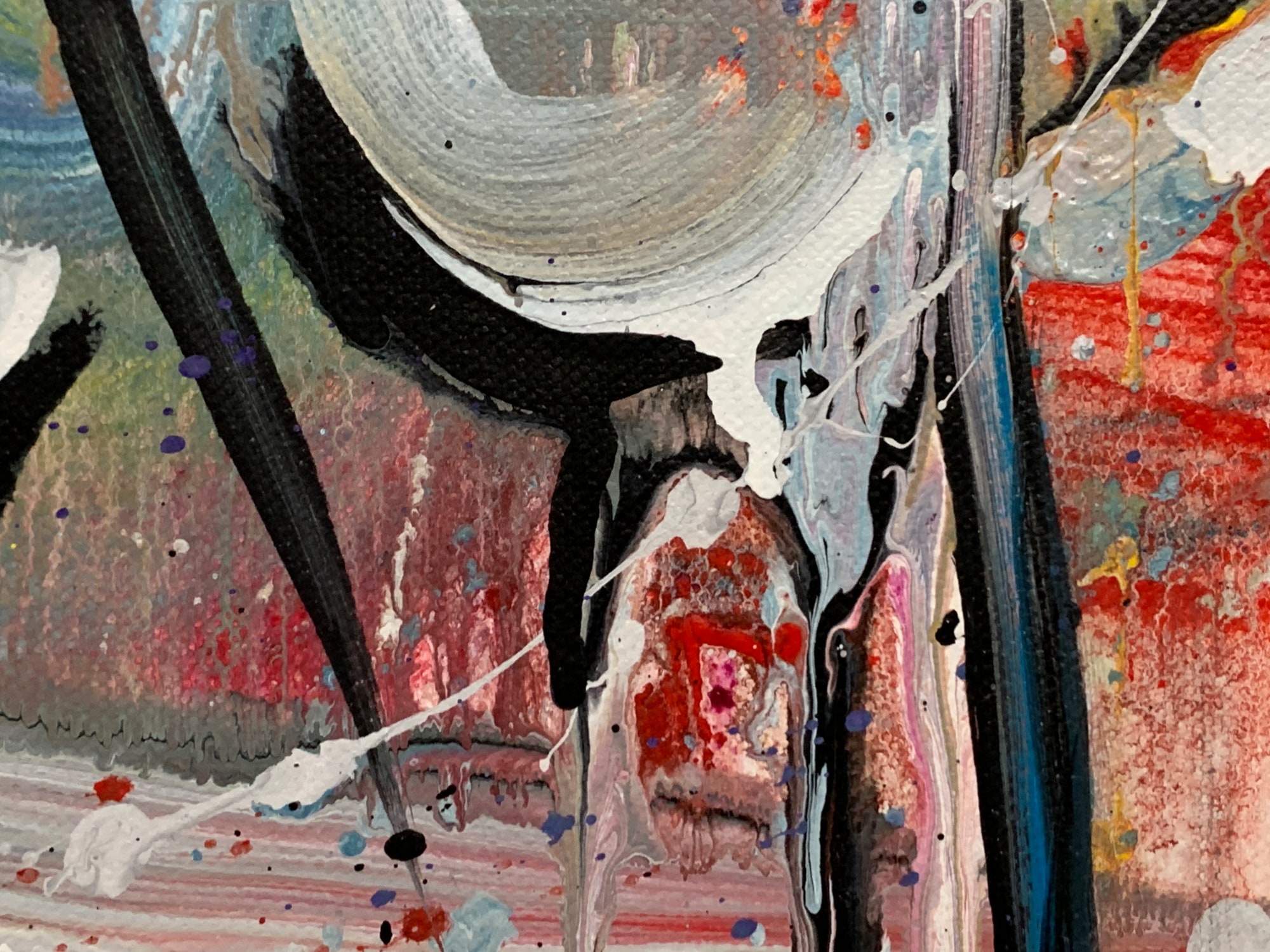 This is a lyrical abstract composition in acrylic on canvas. It features a lot of brushwork and wet-on-wet layering of paints. Doodles in acrylic are incorporated into the all-over composition, creating a sinuous path through the piece and providing resting places for the eye along the way.