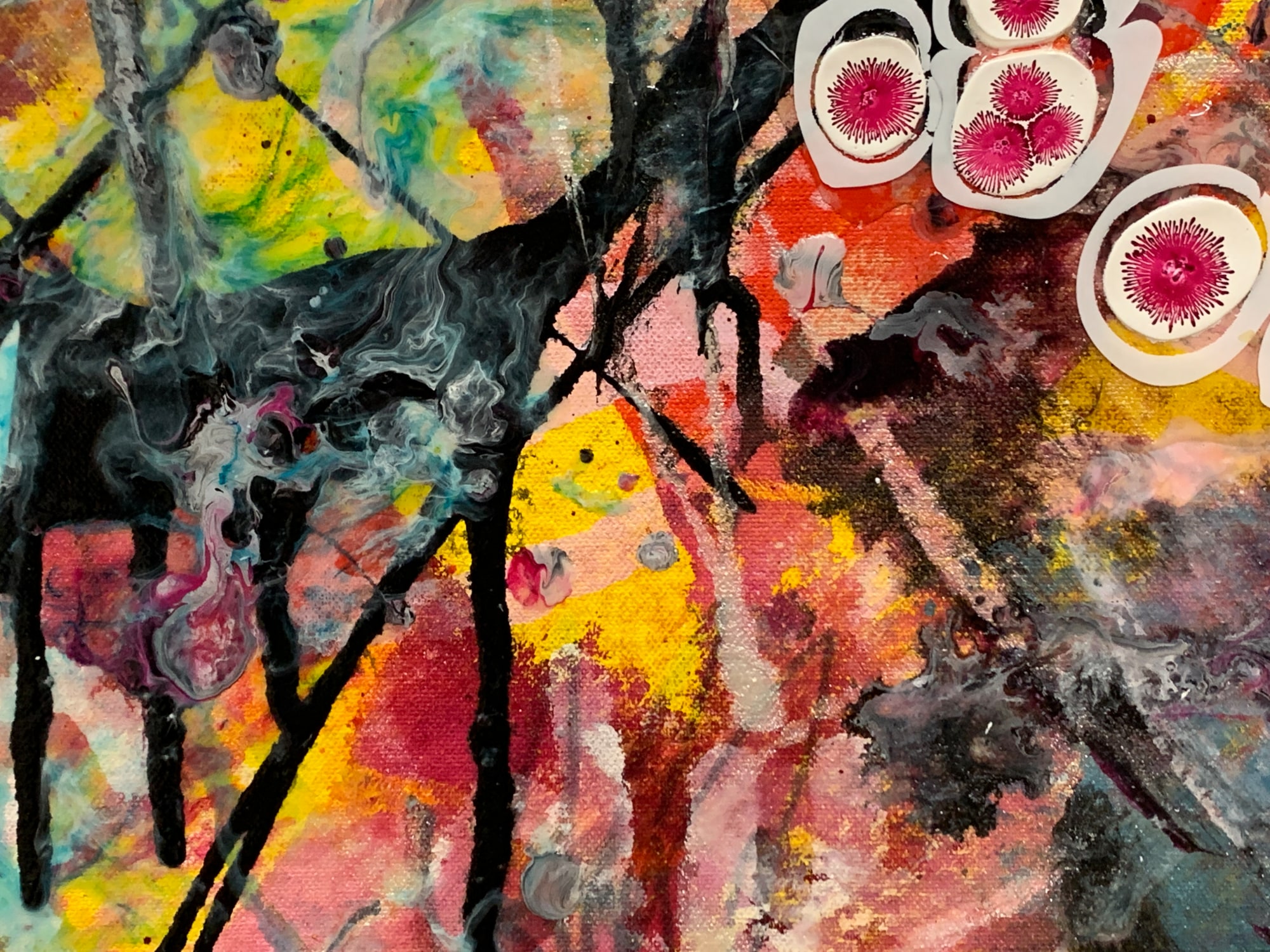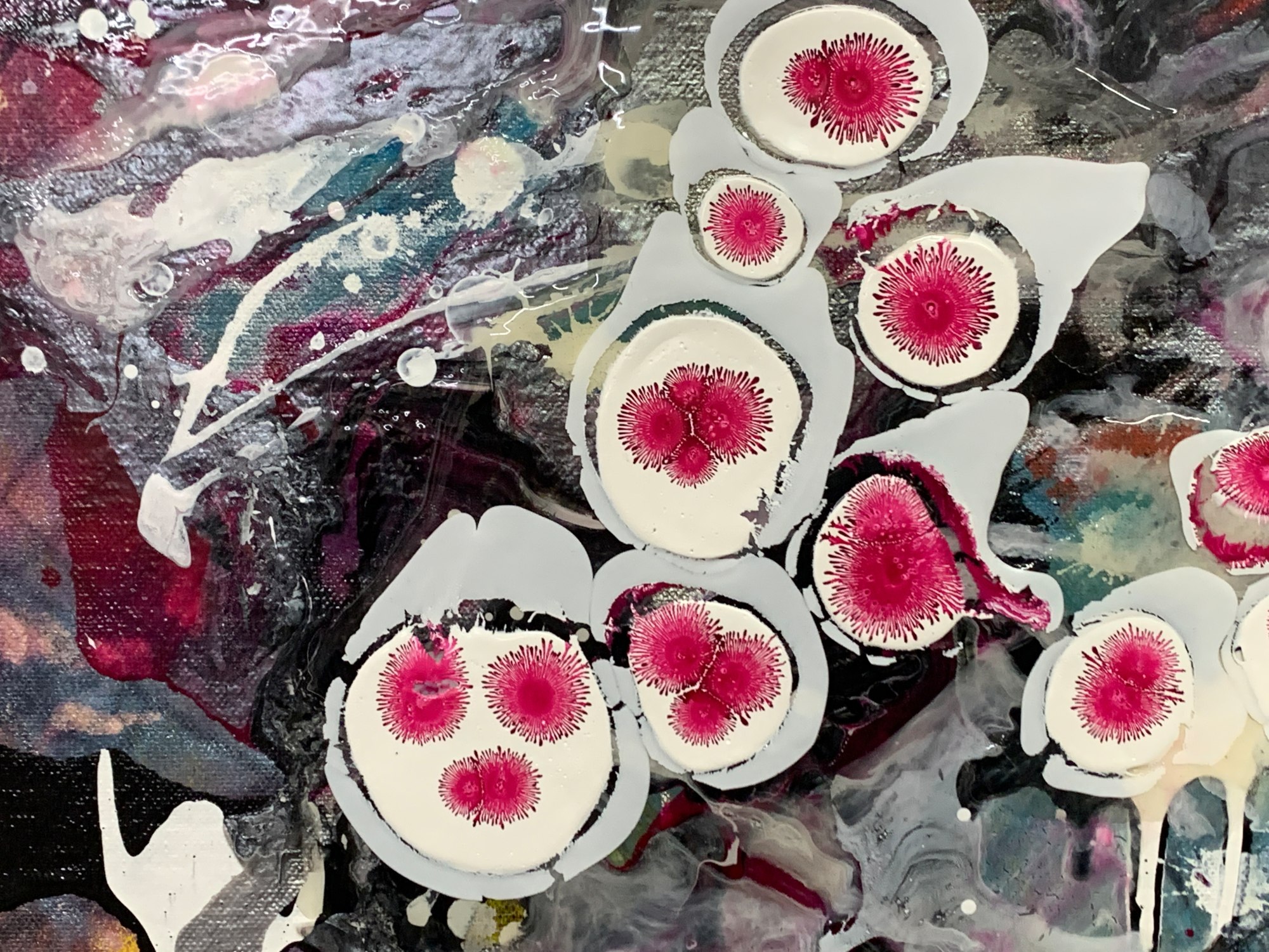 The final couple of layers are done in poured paint. I mix high flow acrylic, which has a very low viscosity, into acrylic pouring medium, which starts out like a milky white syrup but dries crystal clear and glossy. I only partially mix the colors in and then I pour the mixture directly onto the canvas so that the colors come out in thin drawn out lines and swirls. I push the mixture around with a rubber wedge, opening holes and drawing it out. Then I dripped titanium white fluid acrylic into the wet medium and applied very small amounts of magenta high flow acrylic in the centers of the circles formed by the white paint. The white spreads into the medium and the magenta pushes out into little flower shapes in the white.