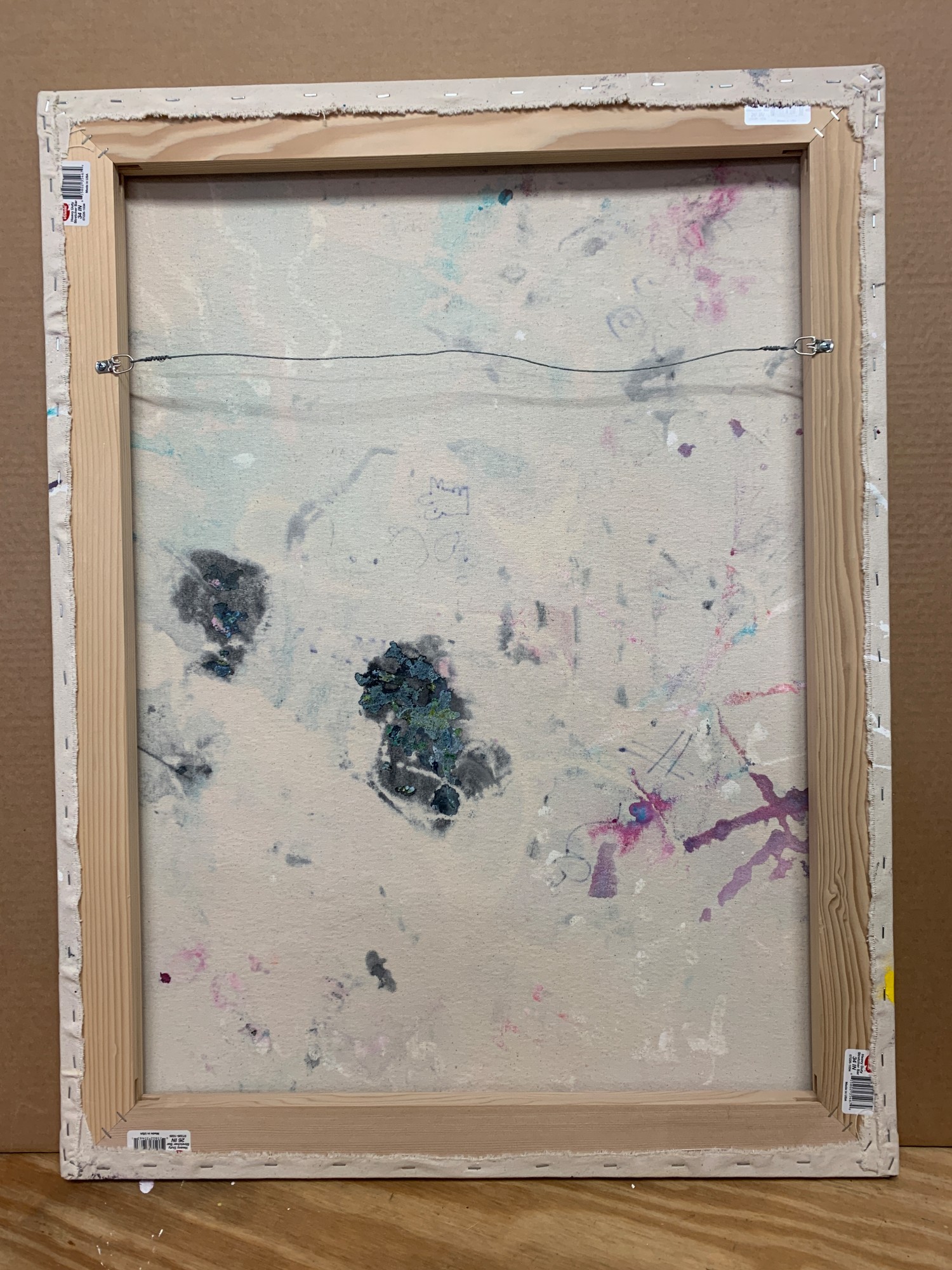 After letting the painting dry for a couple of days, I stretched around a 34 x 26 in set of premium gallery depth stretcher bars. If you look at the secondary images you can see that the composition continues around the sides of the painting, which is an effect I quite like. It is equipped with a hanging wire on the back and is ready to be displayed as it is; it does not require a frame.