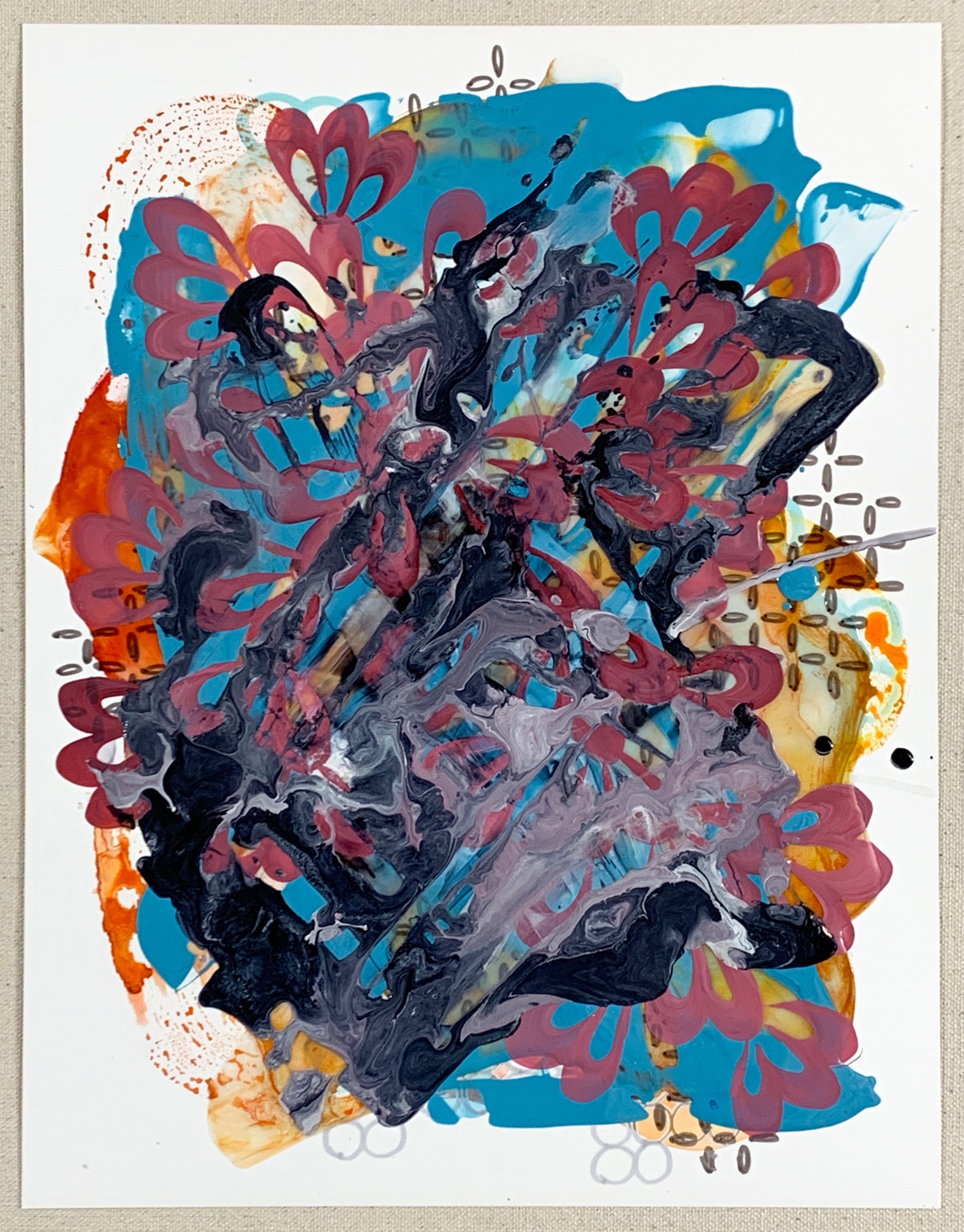 These pieces are pretty little tangles of possible space. I'm continuing my series of doing a number of small paintings all at the same time. I had been going large in my work for almost all of 2020 and the first part of 2021, so I wanted to see what would happen if I pulled it back to a smaller format. There is something a little more refined here, perhaps a little more careful, but still spontaneous and free.