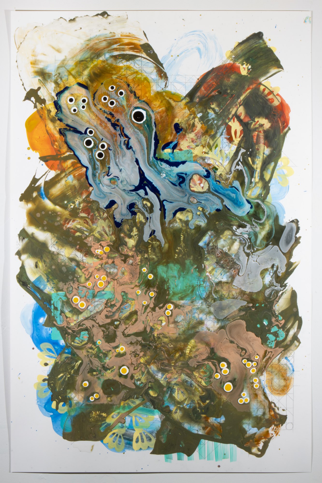 This is a painting about the ways different systems can co-exist and interact both constructively and destructively. The background is composed of a grid drawn in pencil using a ruler to produce evenly spaced straight lines. Circles are drawn within the squares of the grids such that they overlap in places, and some pencil shading is done to highlight some overlapping. The background work is delicate, precise in some places, and a bit messy in others. It is topped by watercolor washes, delicate in their own way, but airier and blocking out large areas in single gestural strokes. Brushwork in acrylic tops the watercolor, and above all is poured acrylic media with various acrylic paints mixed in different ways. The poured paint is almost rude, going where it will, barely controlled. It cracks in places where the underlying watercolor pigment dries it out from the bottom. Things happen without control.