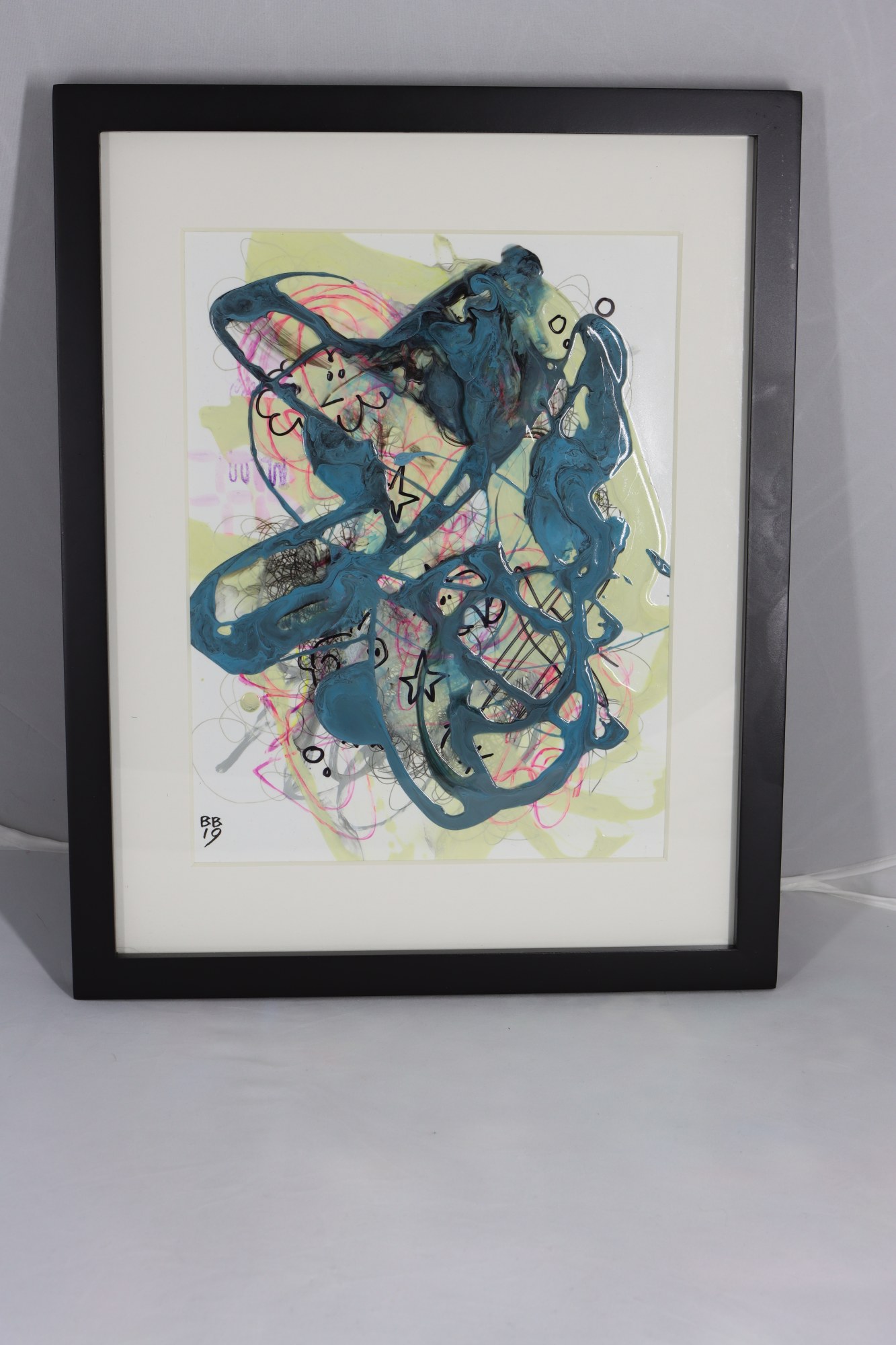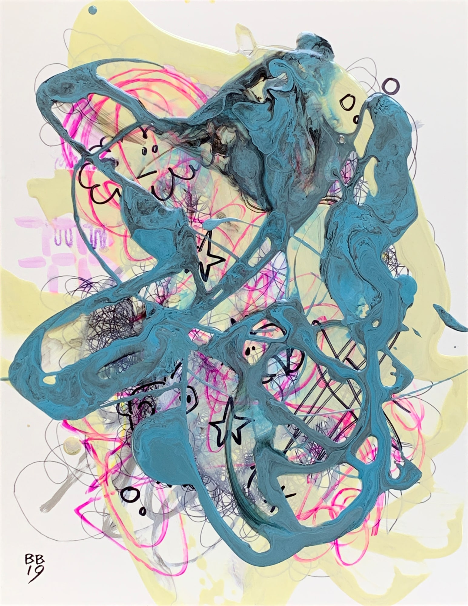 ballpoint pen, marker, stamp ink, and acrylic on textured polypropylene