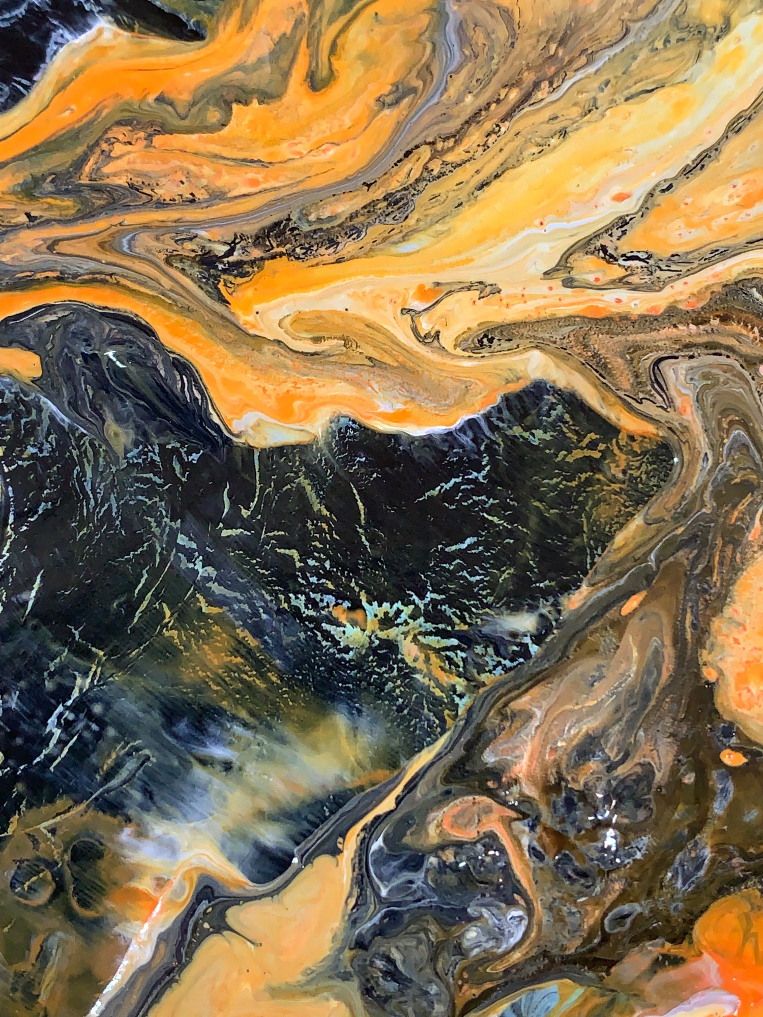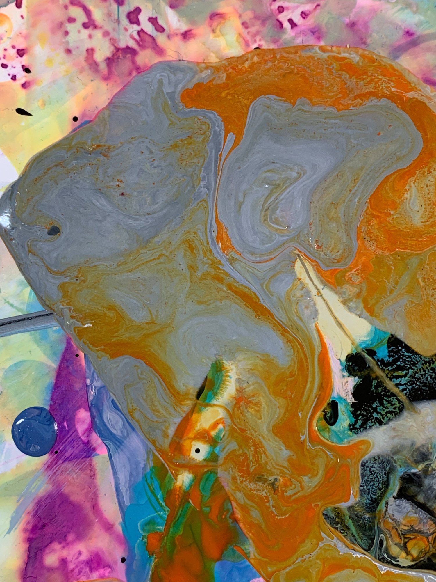 The openings in the poured paint layer in this painting, especially down at the bottom where there is that real nice streak of black above a wide field of blues and oranges, are like tears in the fabric that blinds us to that more basic level of reality. It's a refuge, but it's still dangerous. It's exciting, it's new, but it somehow feels like home.