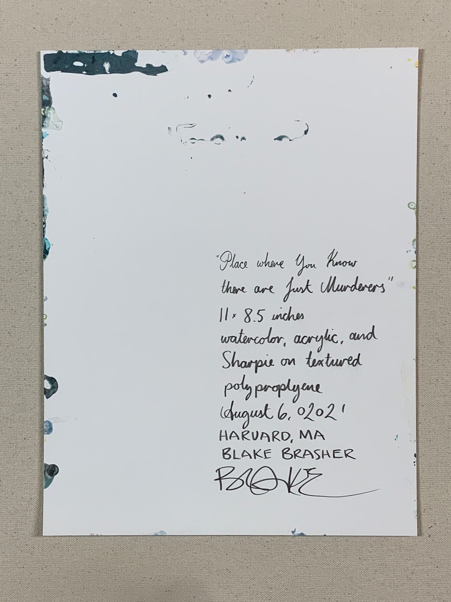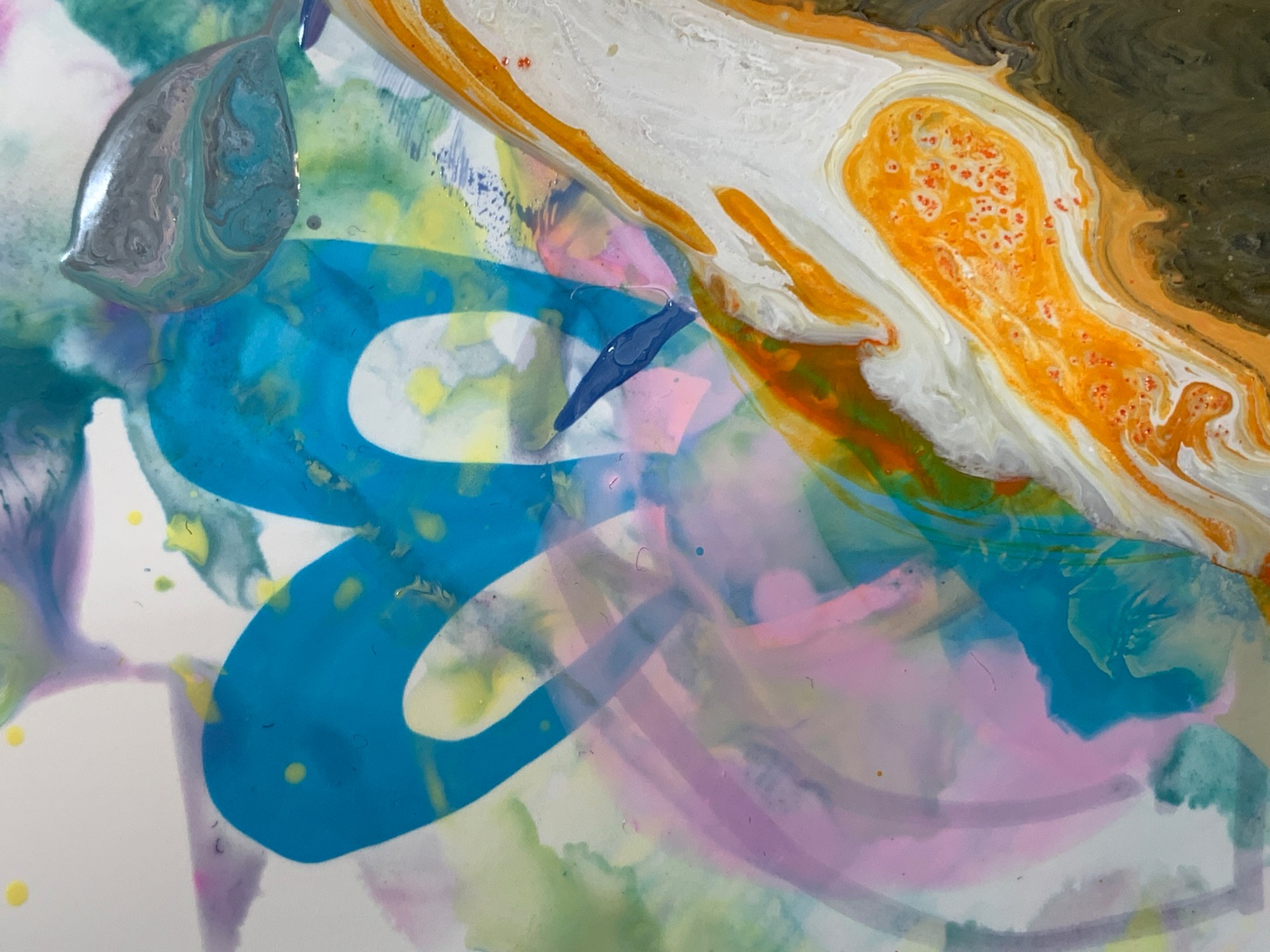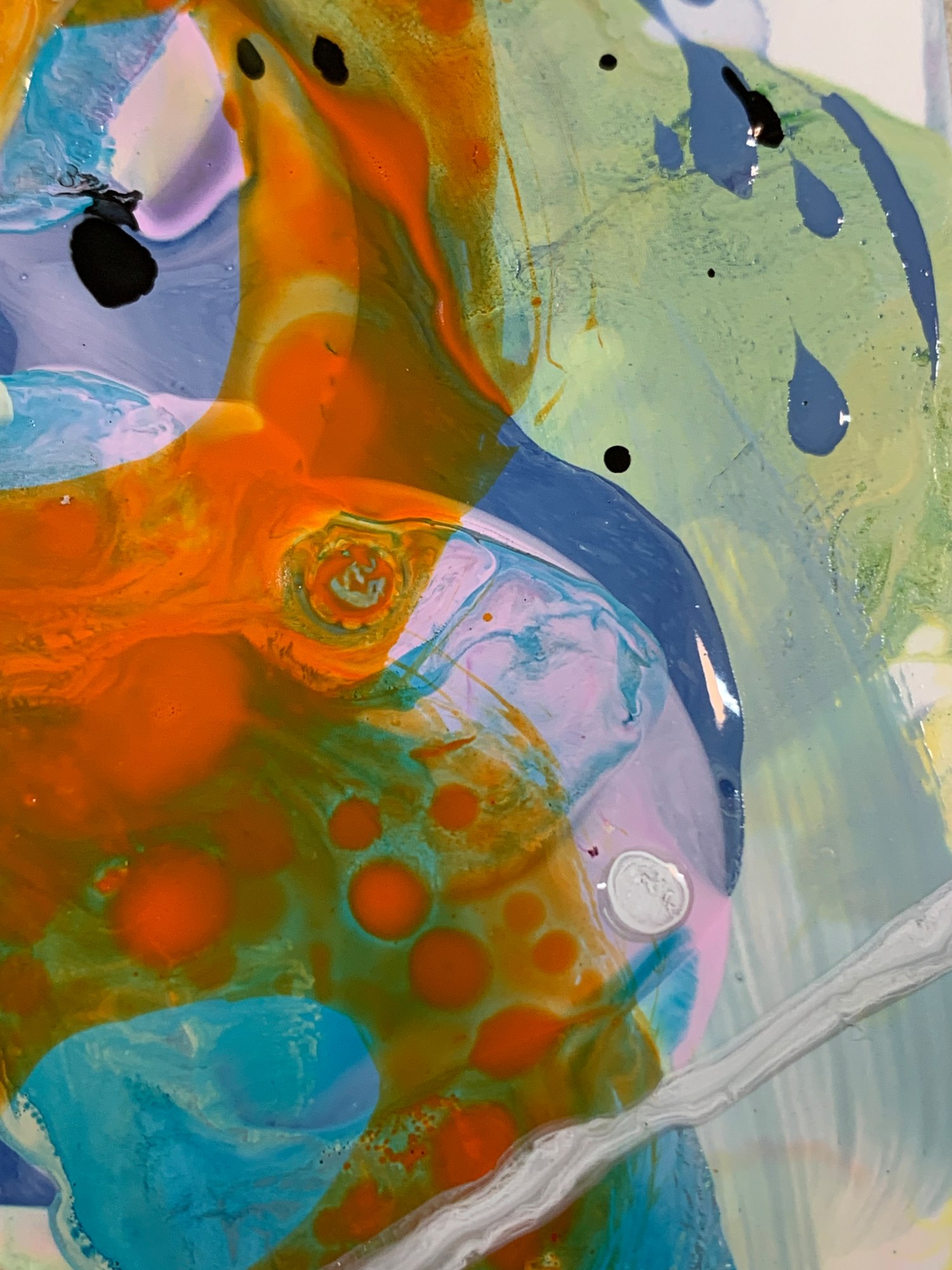 This is a little mixed media painting on textured polypropylene paper (aka Yupo). I'm experimenting with different edge treatments, thinking about what changes when the the composition is allowed to go past the edges. There is a bit of a cheat, though, in that the poured layer still pulls towards the center. I couldn't quite do it; it didn't feel right.