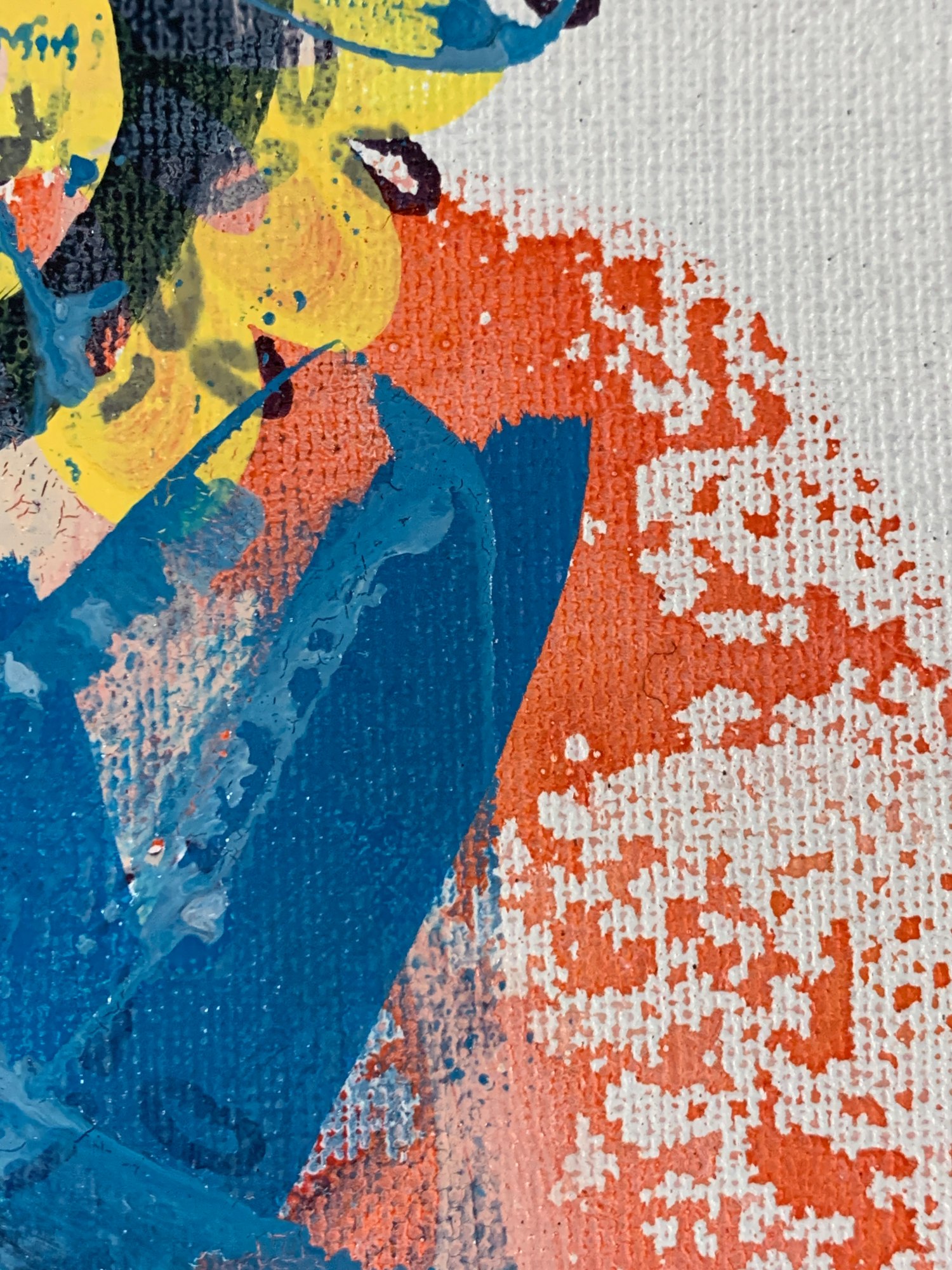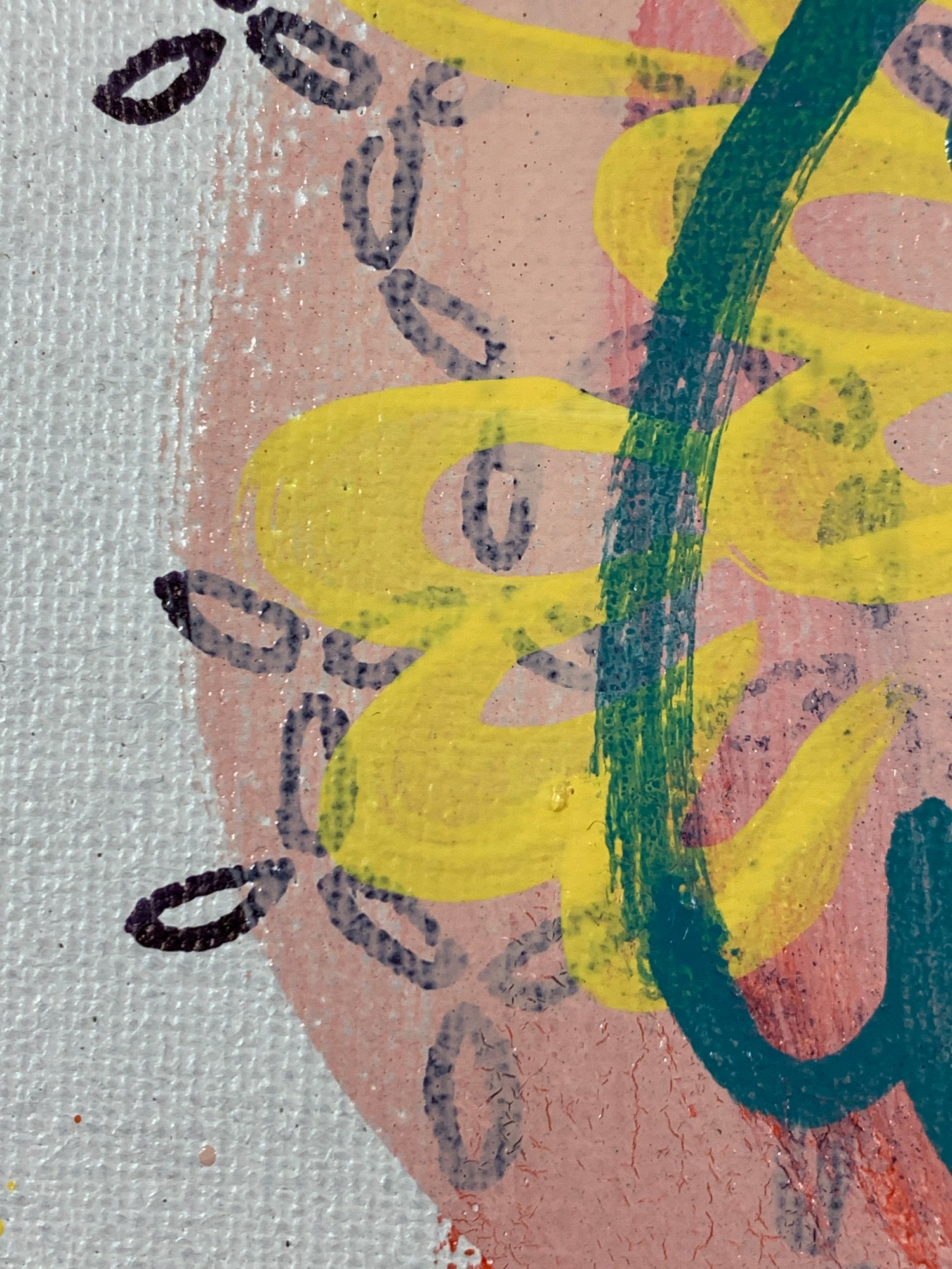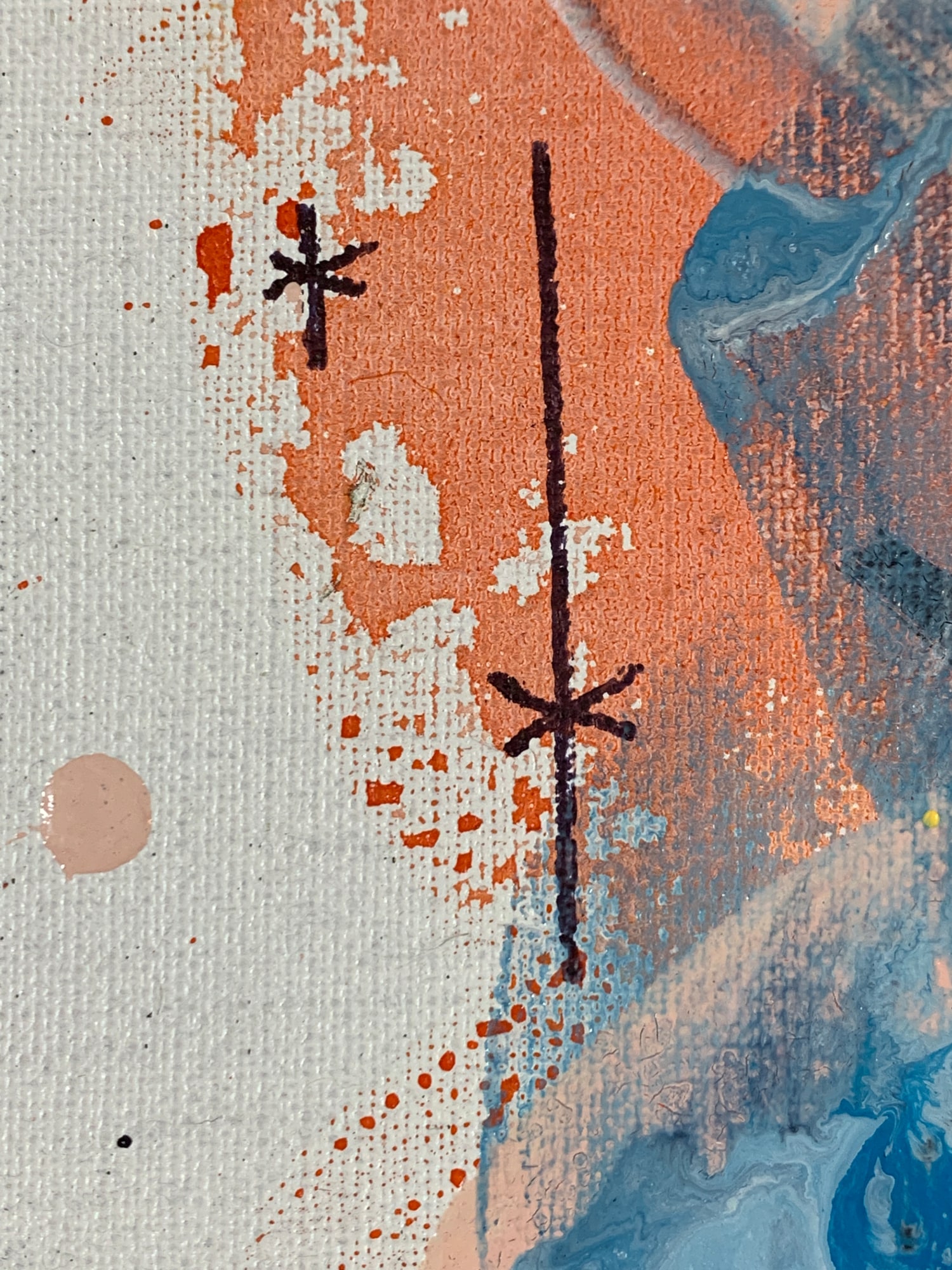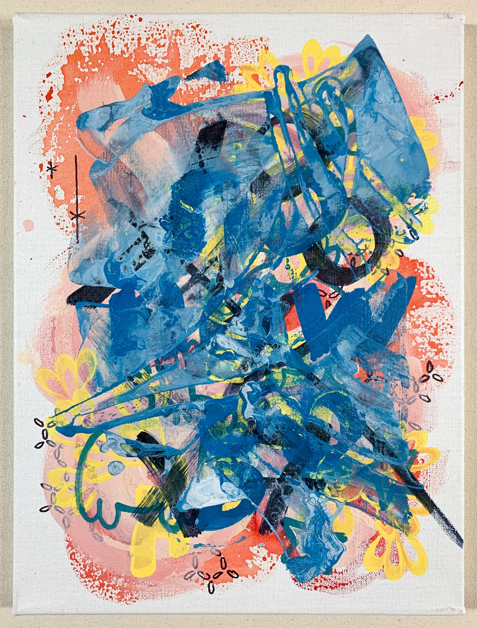 Good energy in this one. I do like the Miro-stars (upper left). It's a bit discombobulated in the middle, but not necessarily in a bad way. You can see Marm's butt in the lower left. I kind of love the swooping pink brush stroke going up towards the upper left corner under the blue poured paint but on top of the melon-red watercolor background. Like a ghost escaping a party.