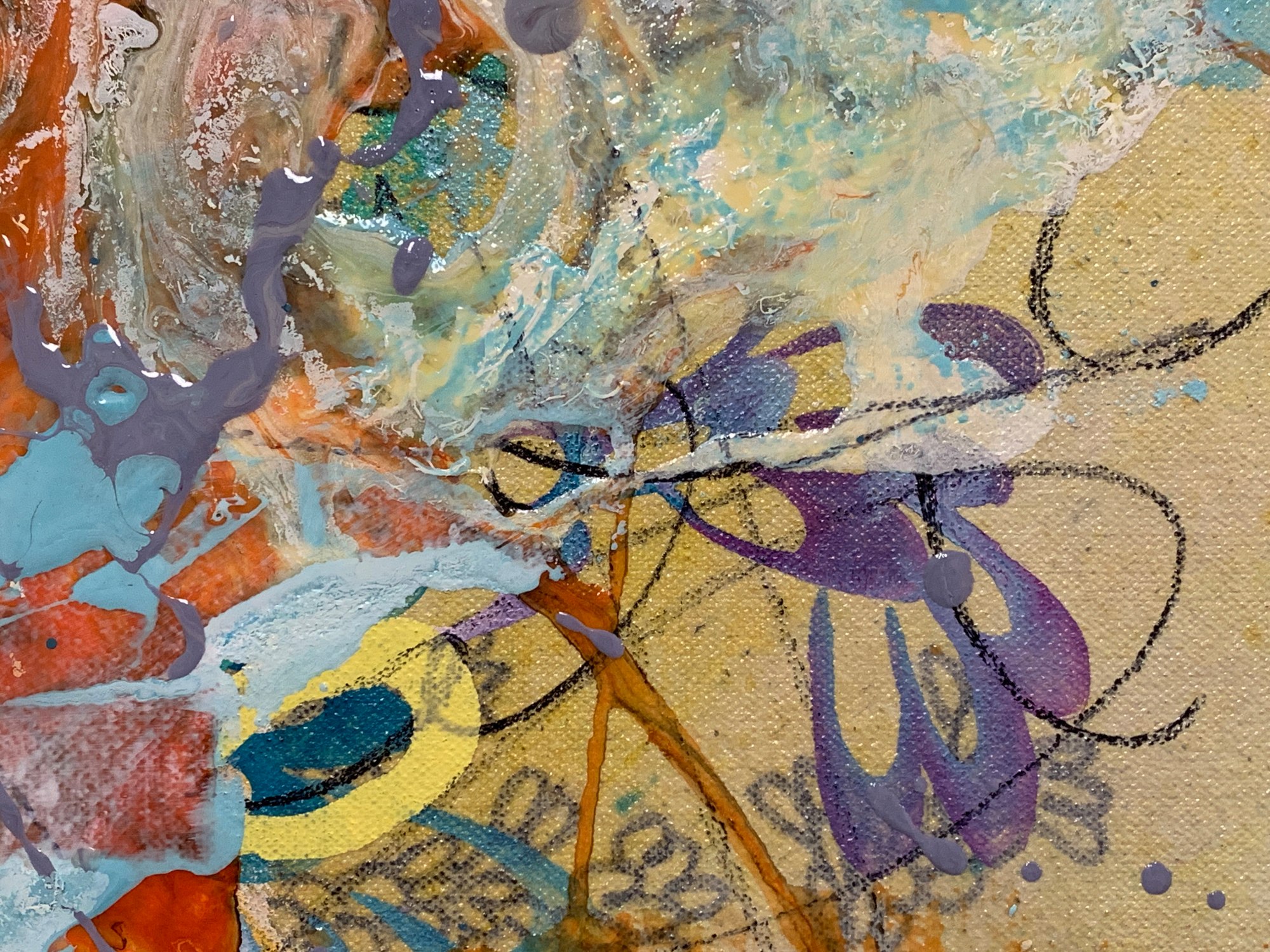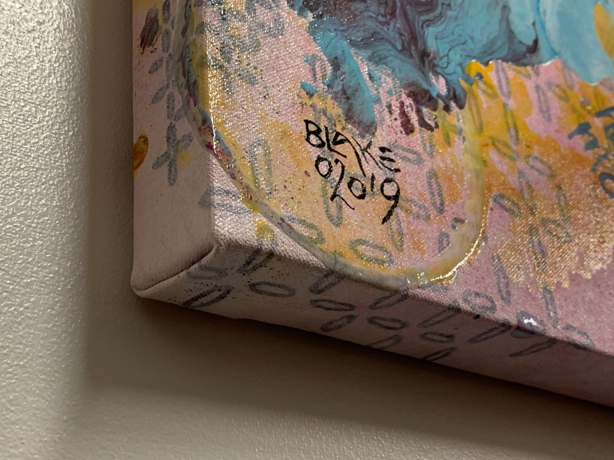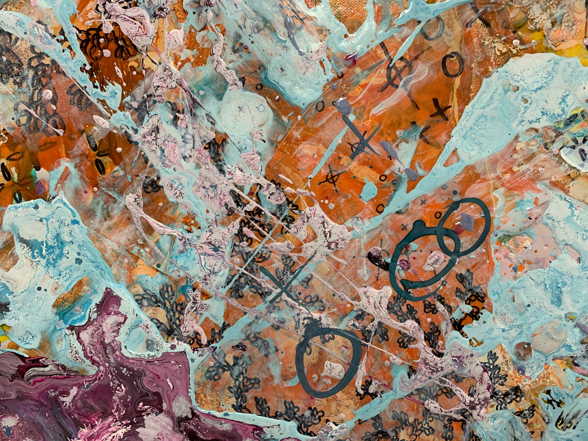acrylic, marker, spray dye, and collage on canvas
