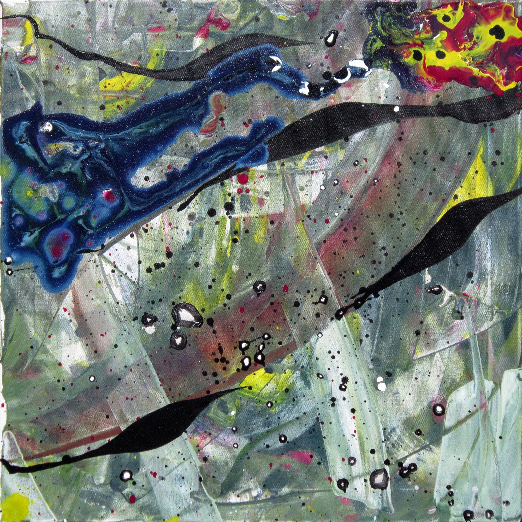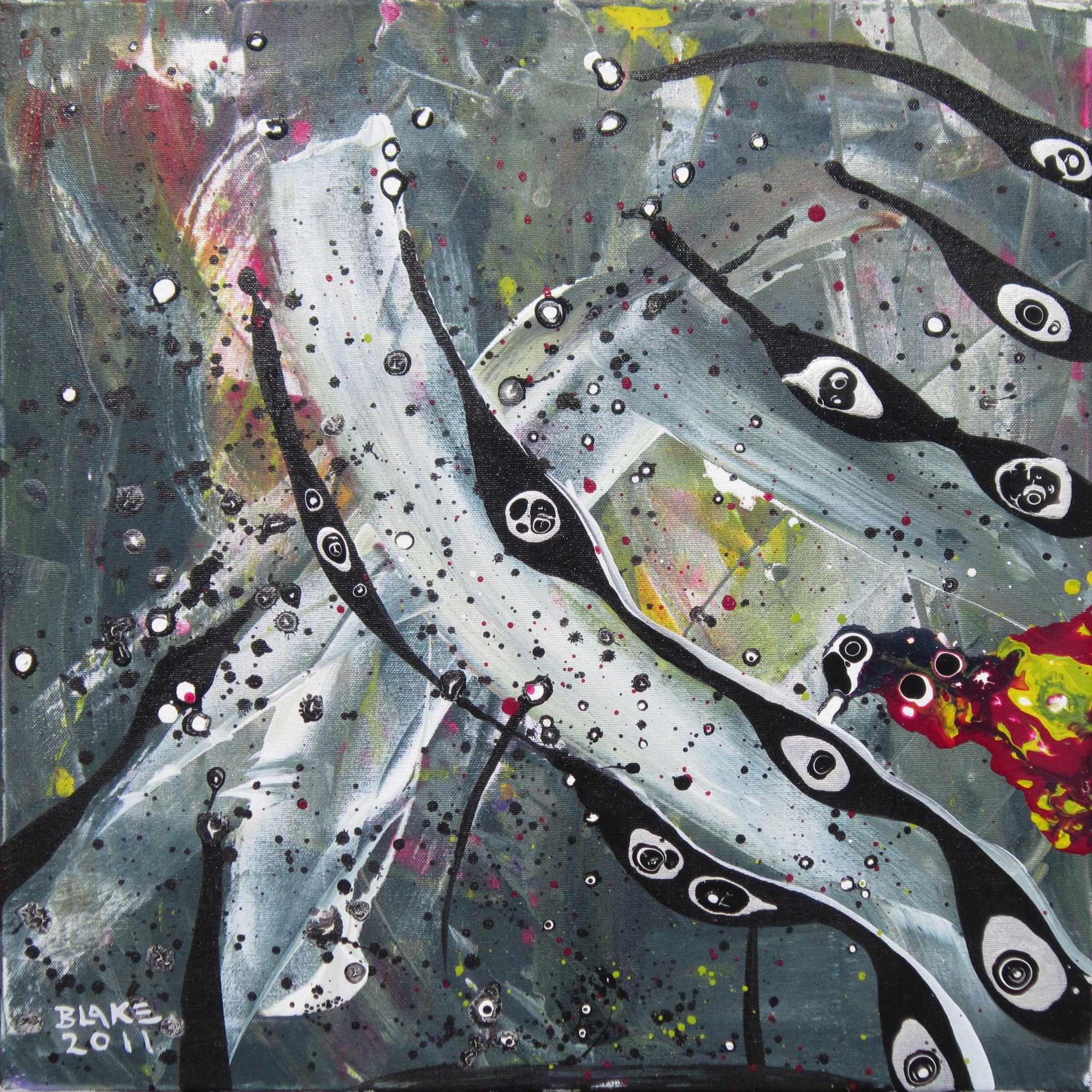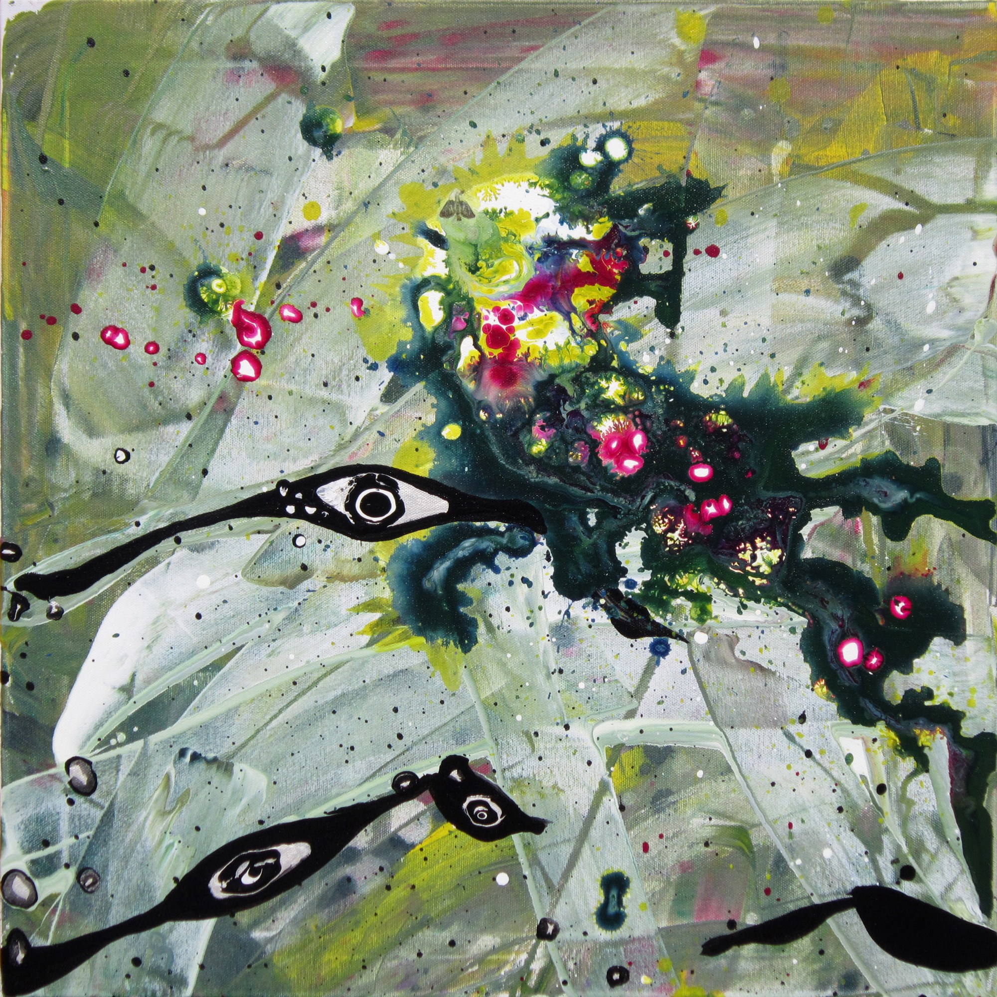 This is a painting from my first residency at Arthouse Gărâna in Gărâna, Romania in 2011. It is a triptych consisting of three 50 x 50cm canvases arranged in a vertical orientation. The image has a weightless quality to it, as if the environment is sub-aquatic or perhaps interstellar. There are clear brush strokes in the background of the piece in neutral earthy greens, browns, and greys, and the foreground is mostly composed of black lines that bulge along their lengths. Some of these bulges are filled in with concentric layerings of white and black paint. In between and sometimes on top of these are pools of poured paint in dark, saturated hues, like bits of seaweed drifting in the current or ion-clouds from supernovae drifting through space.