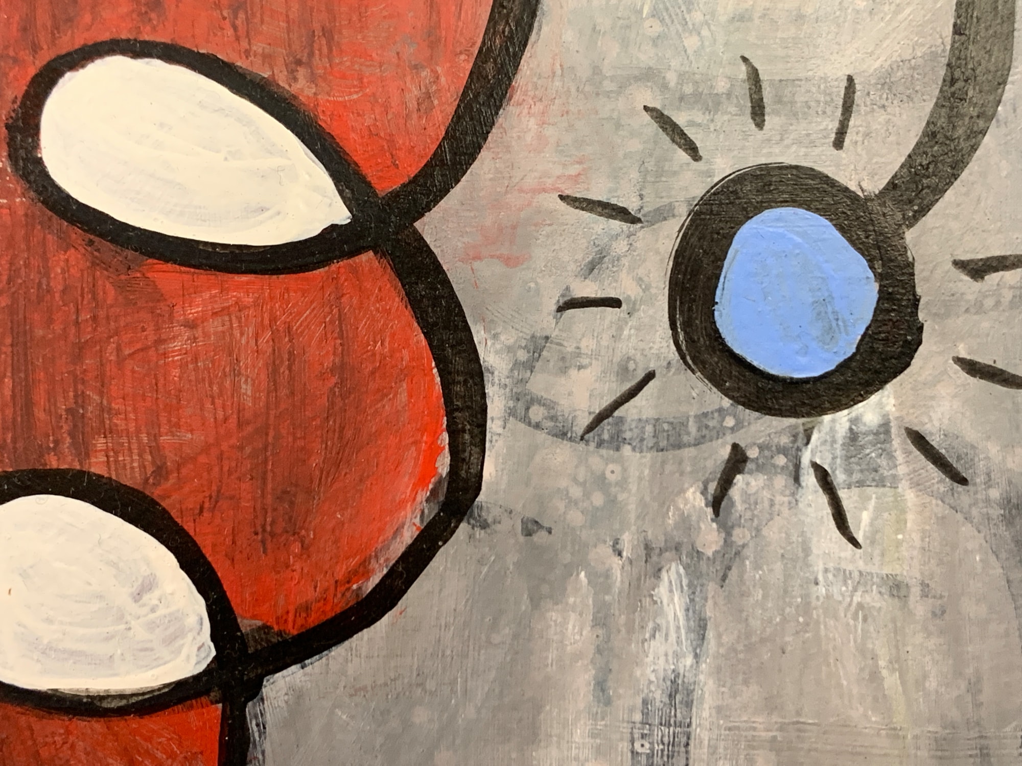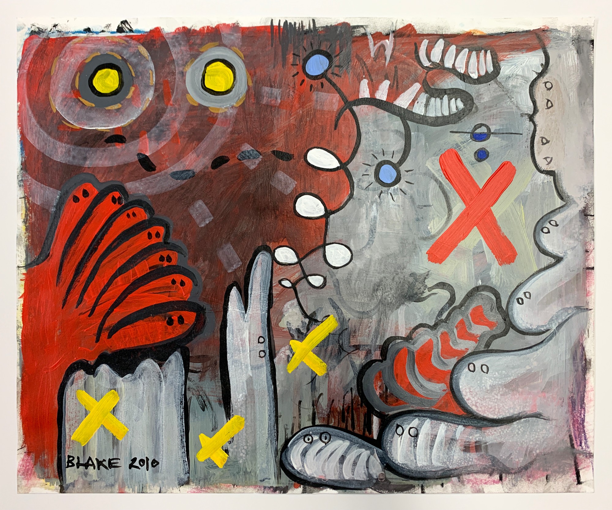 This is a painting I made while living in a coop in Cambridge, MA where I was renting an additional bedroom as a studio. I was just getting started taking abstract painting seriously. In this painting I'm playing around with some ideas about landscape, maps, and cartoon illustration. There is some MirĂ³ influence in here, and some blobby monsters I playfully refer to as "dirt people."