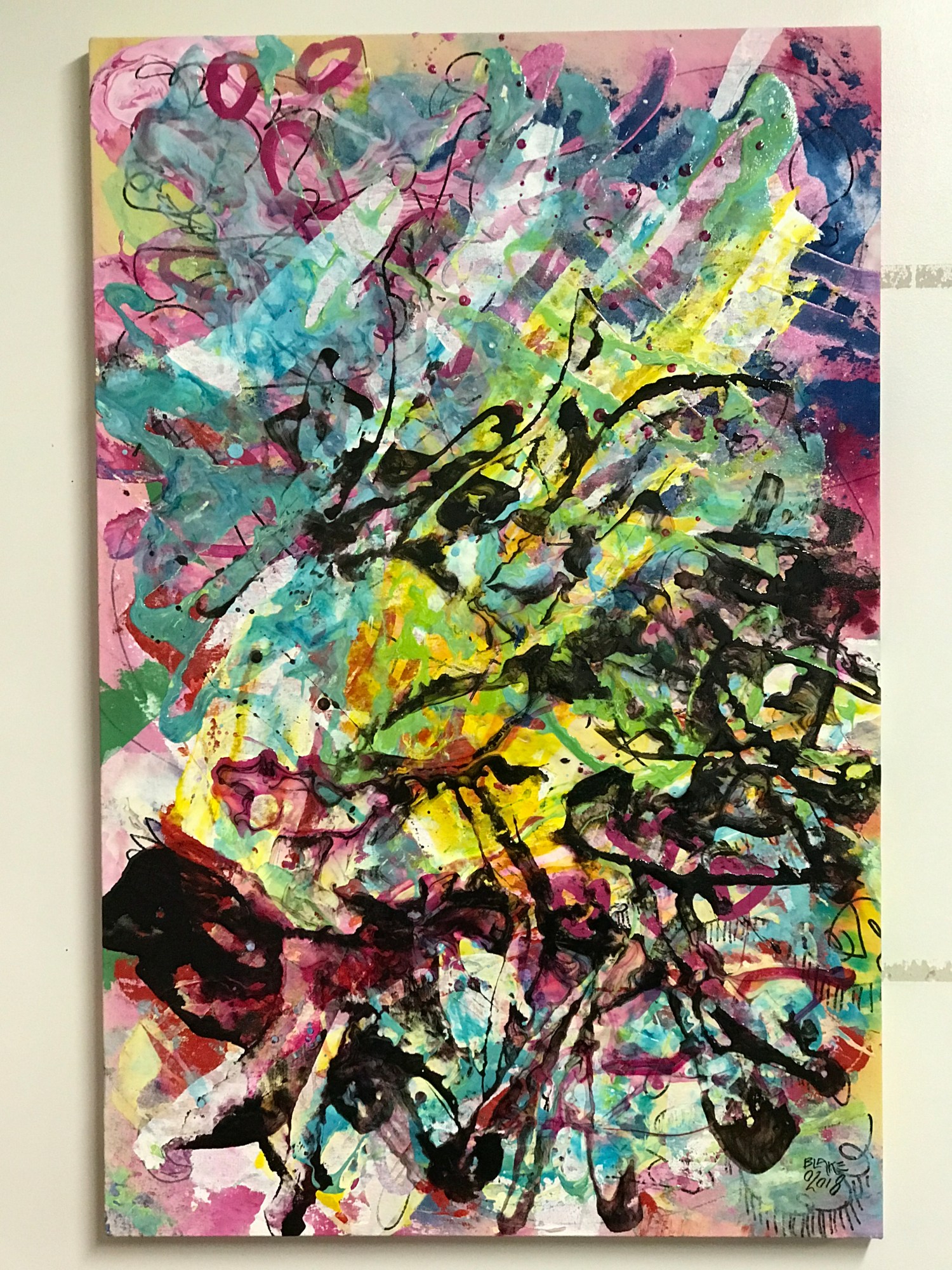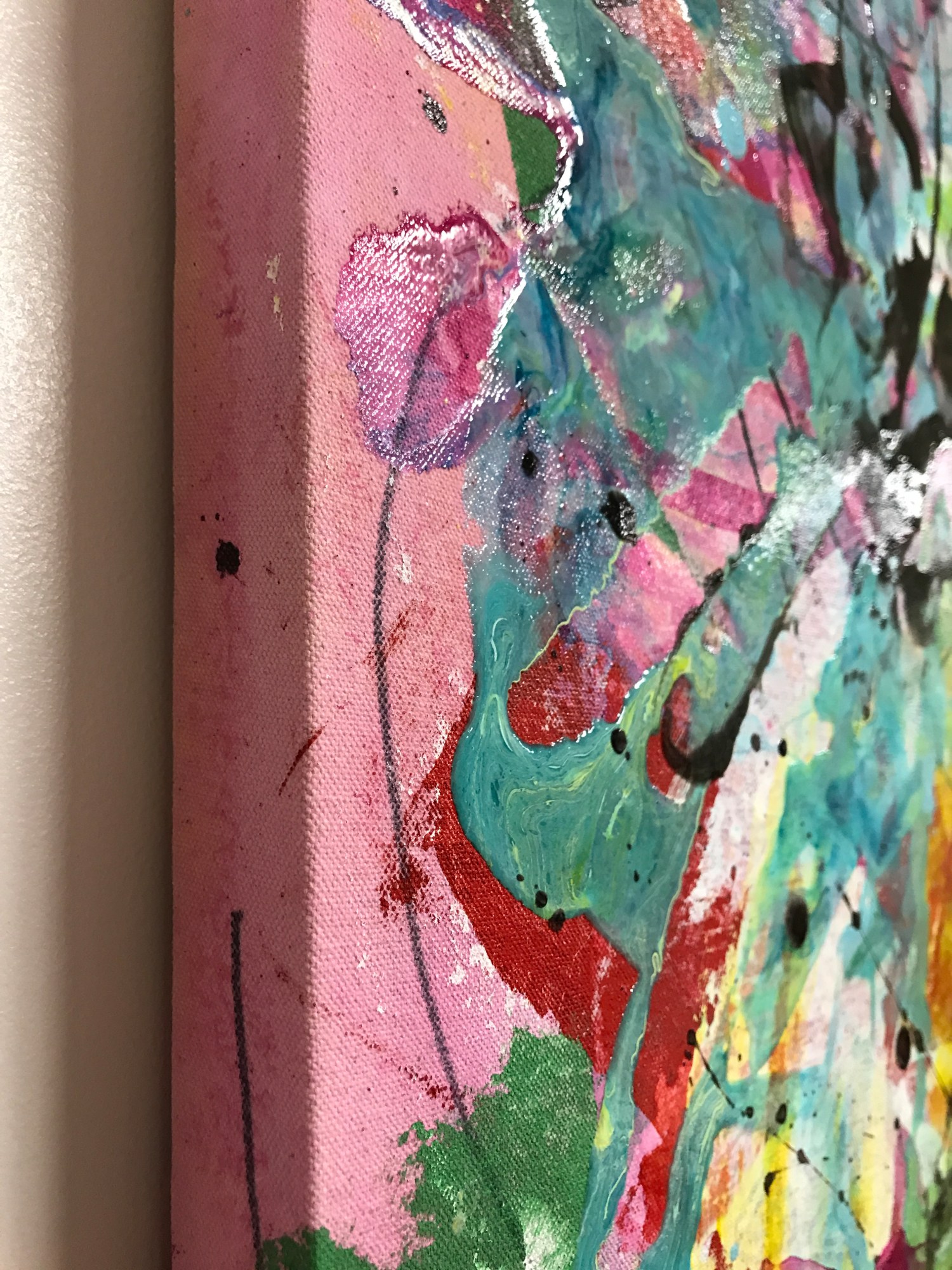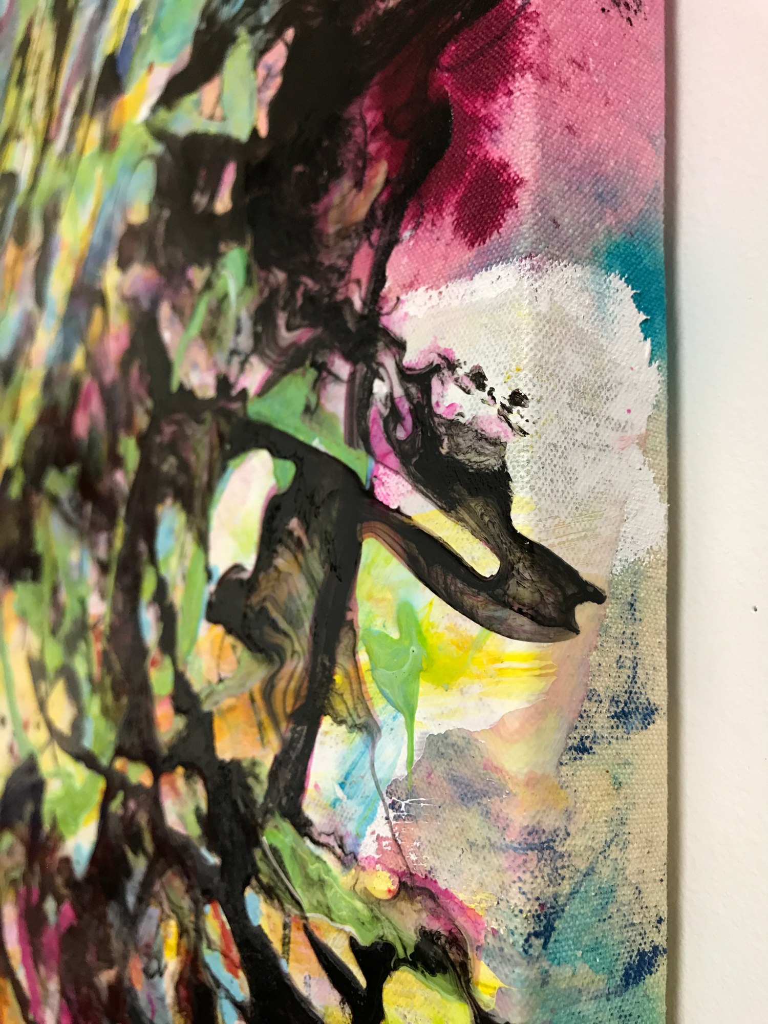This is a wild, colorful abstract composition with a lot of gestural movement in it. It's composed of layers of poured paint, smeared paint, and some marker doodles over stained raw canvas.