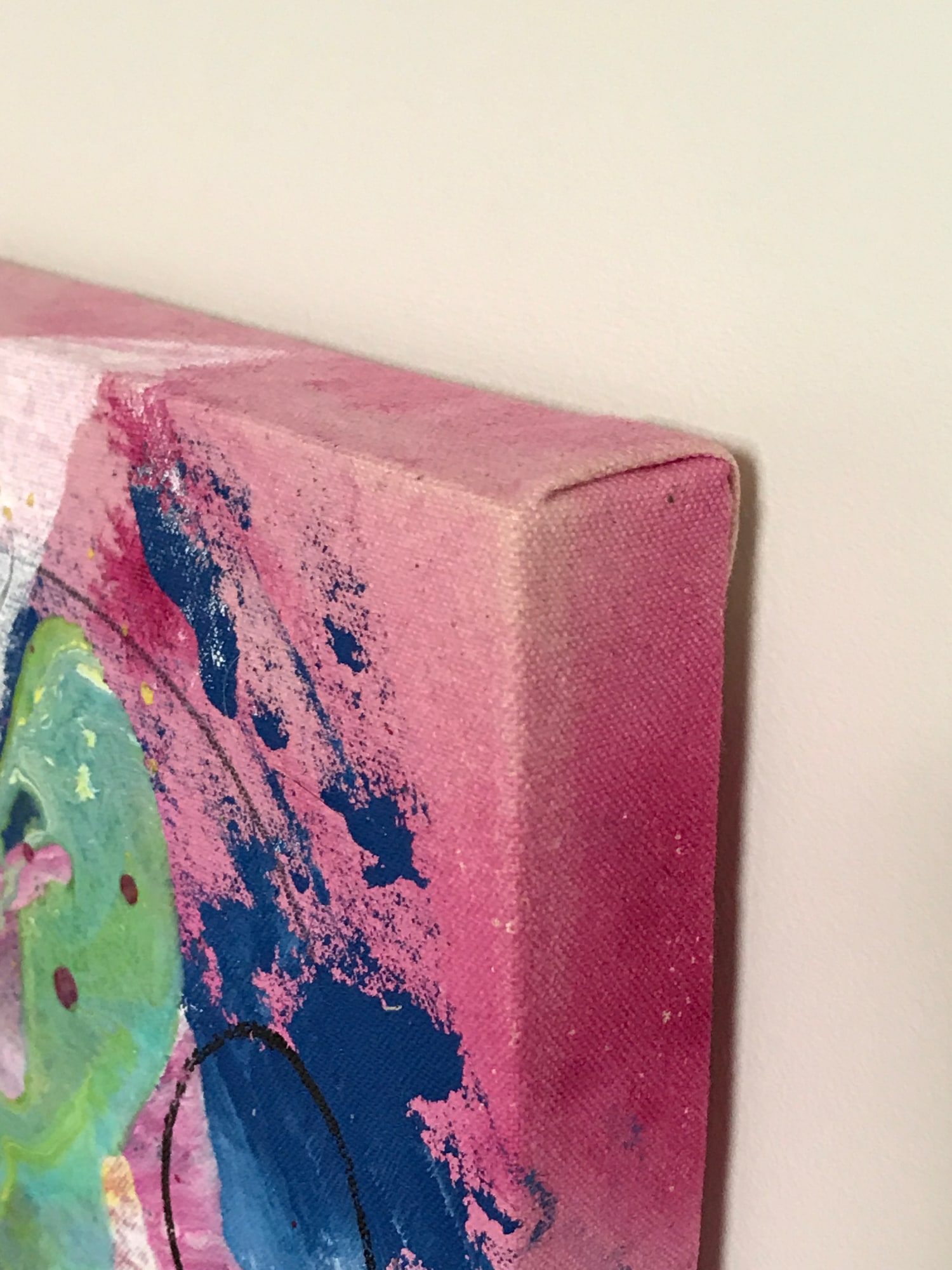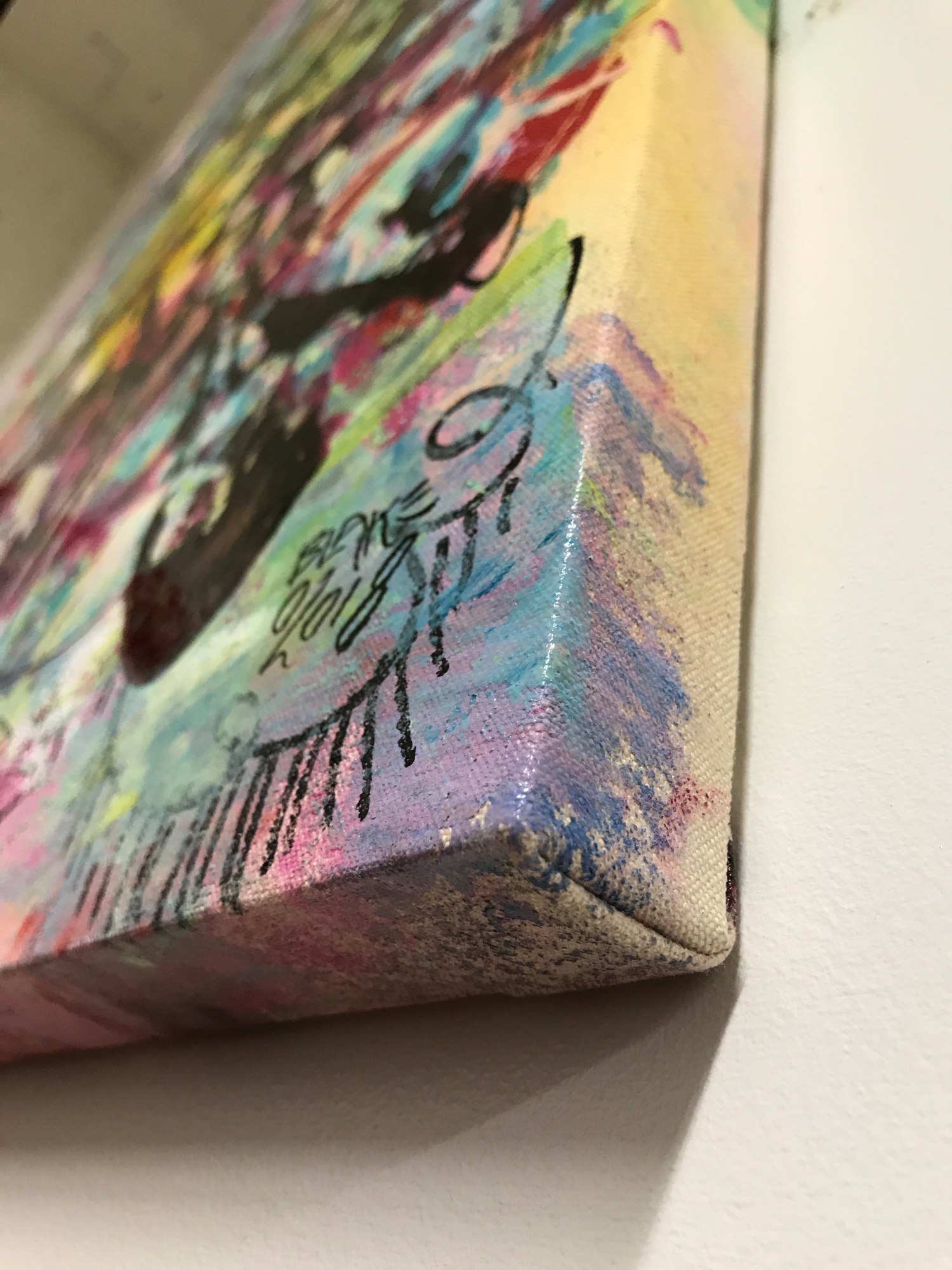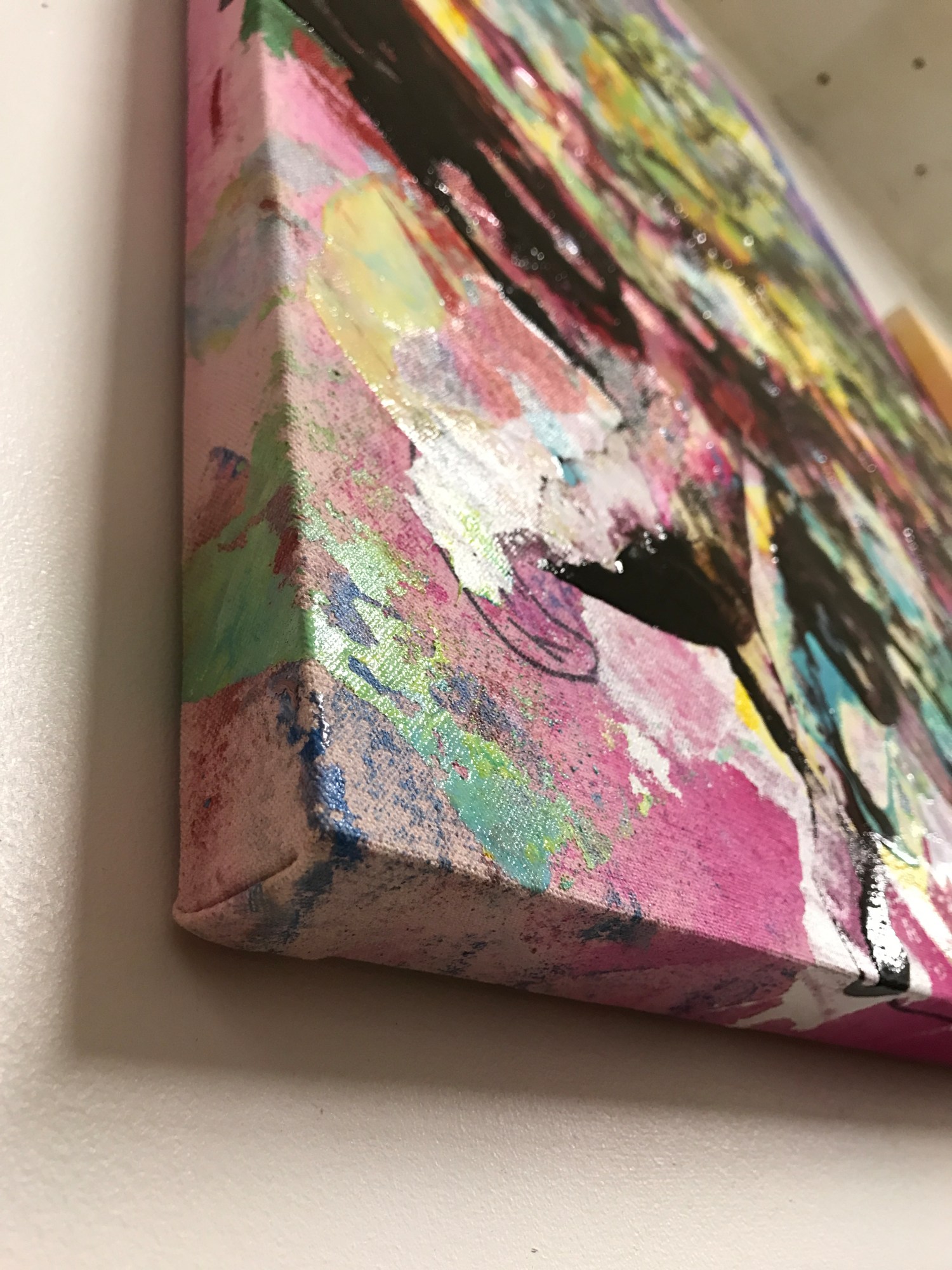 This is a wild, colorful abstract composition with a lot of gestural movement in it. It's composed of layers of poured paint, smeared paint, and some marker doodles over stained raw canvas.