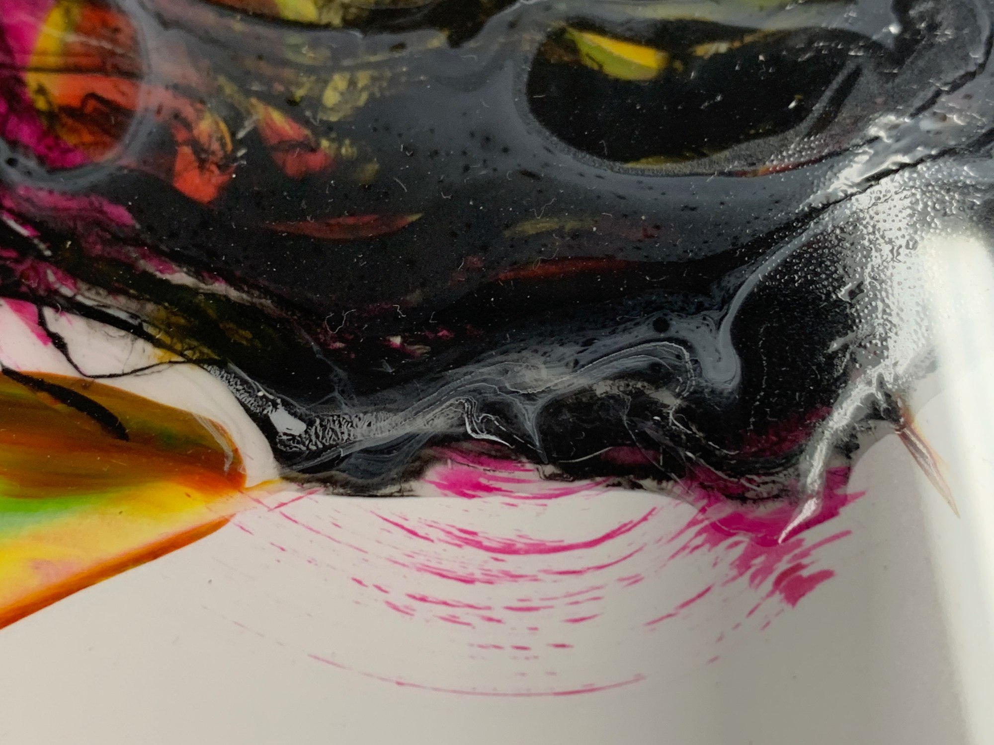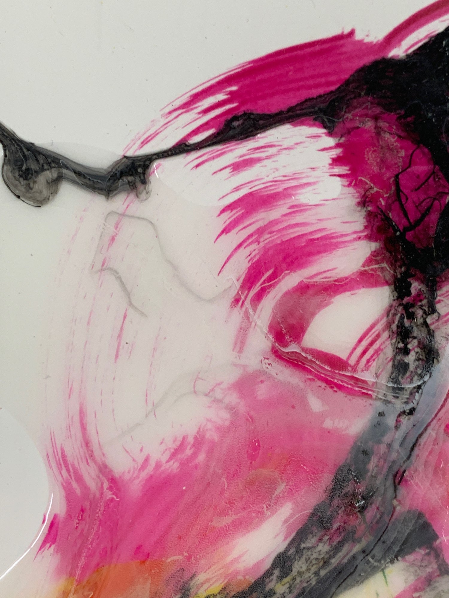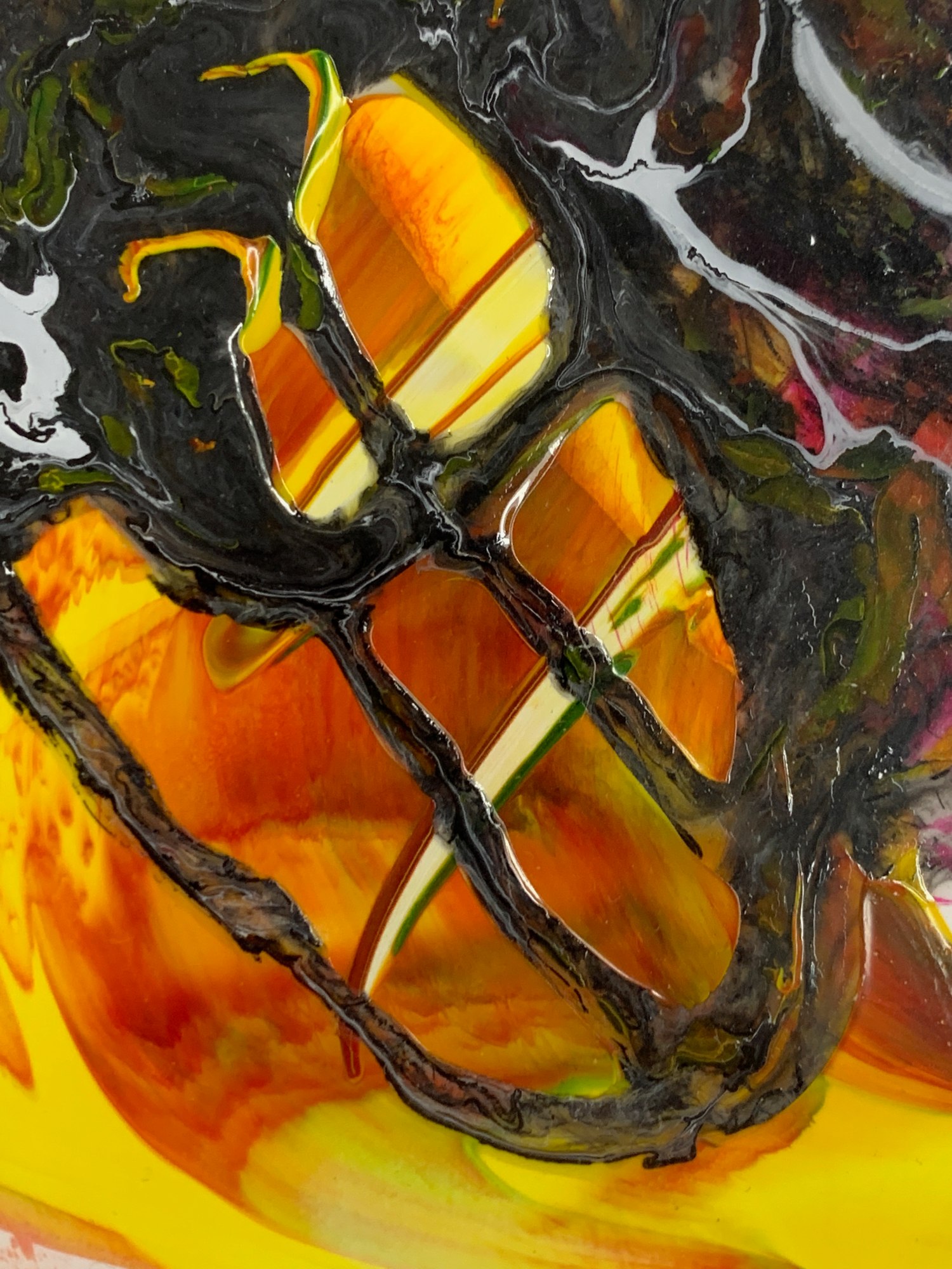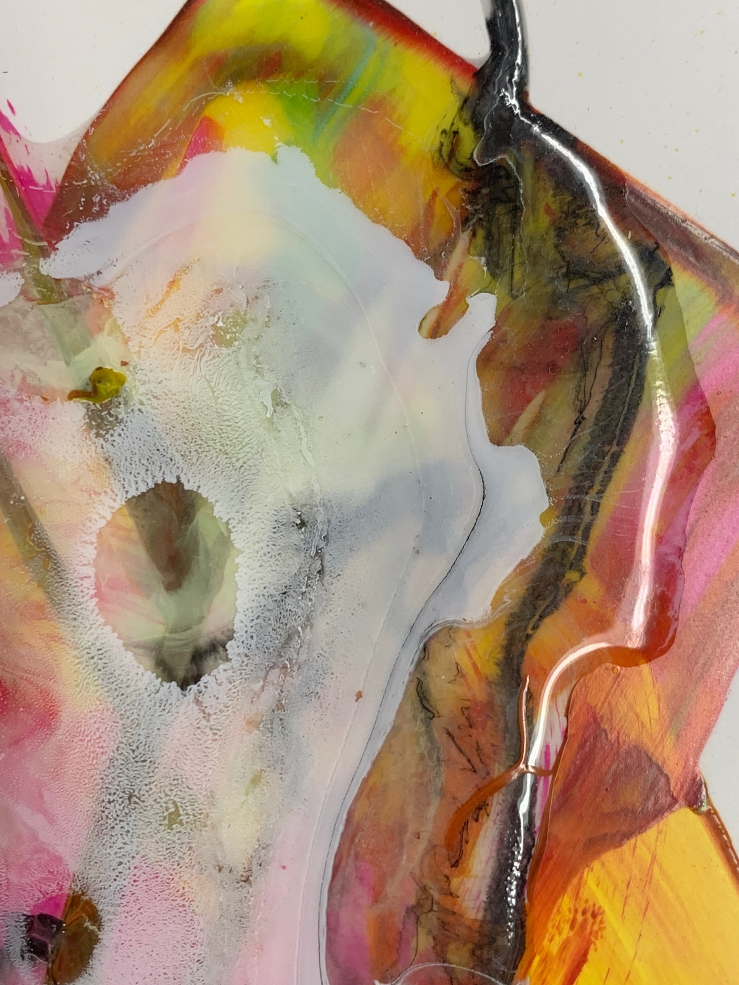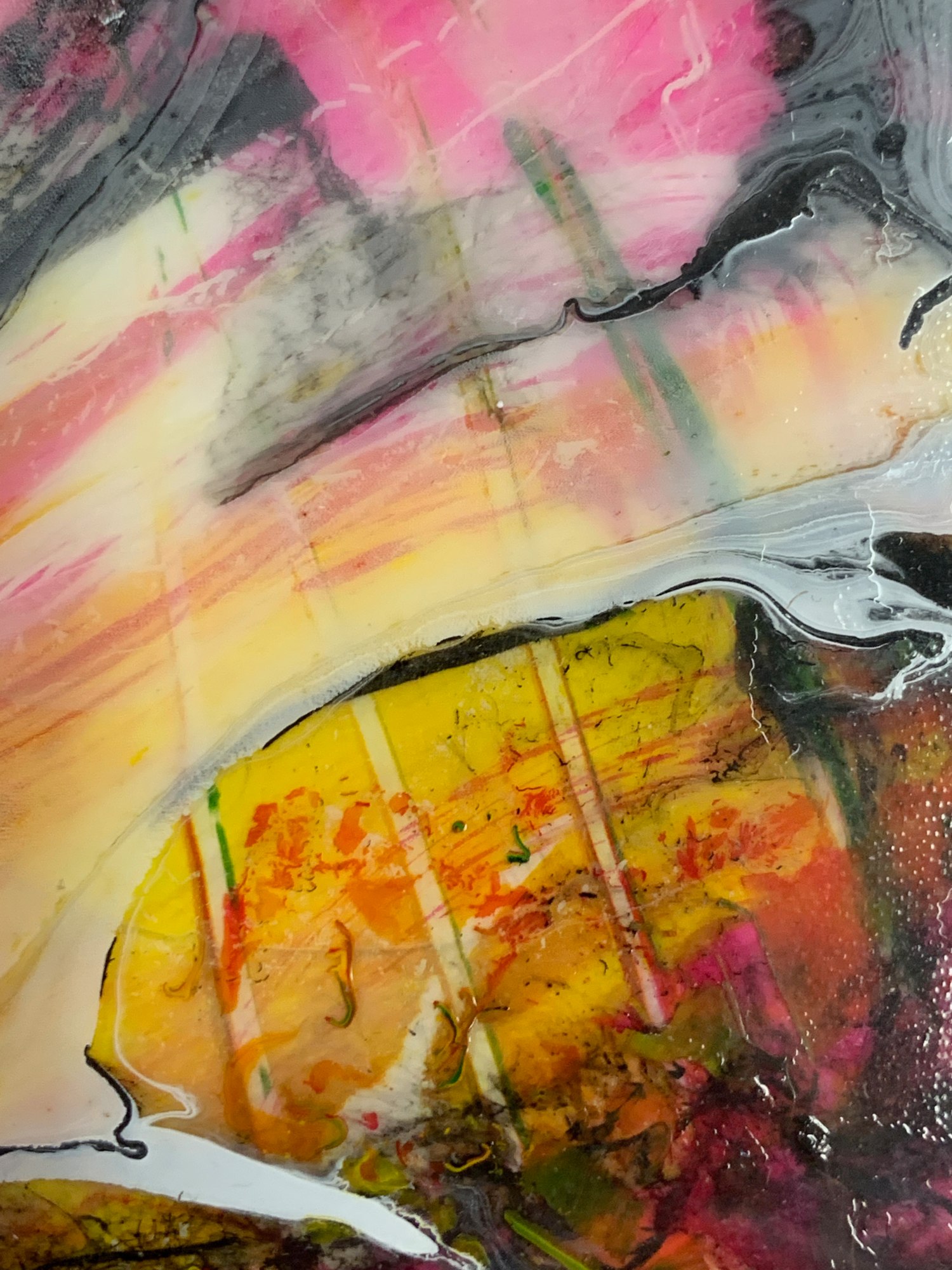 This is a smoky little abstract painting done mostly in poured acrylic paint on textured polypropylene. There is a nice interplay between the delicate wispy tendrils in the hazy whites and the bold contrast between the bright reds, yellows, and blacks.