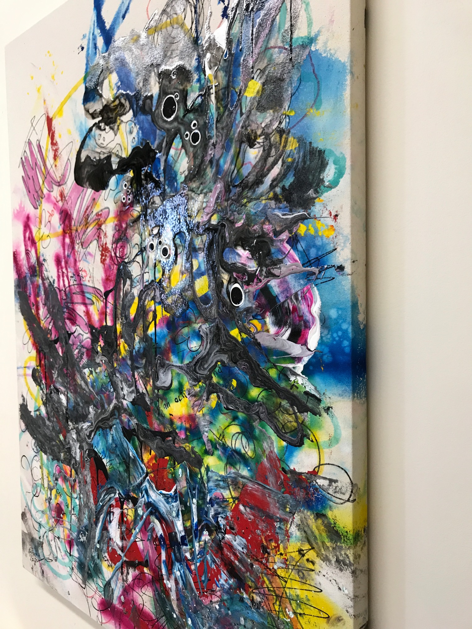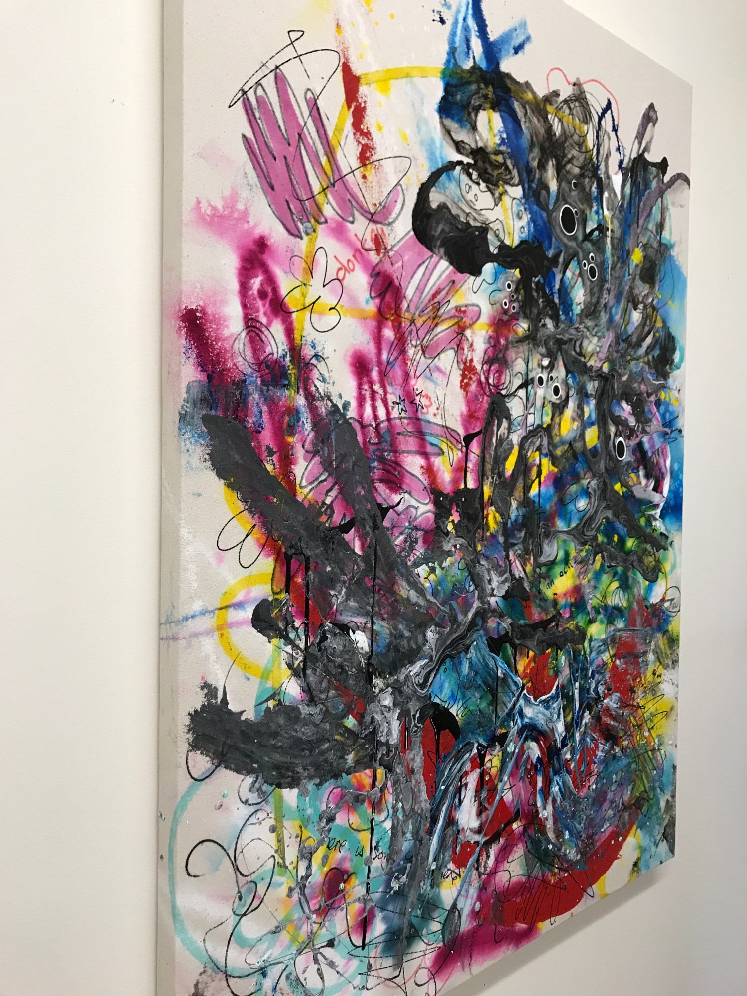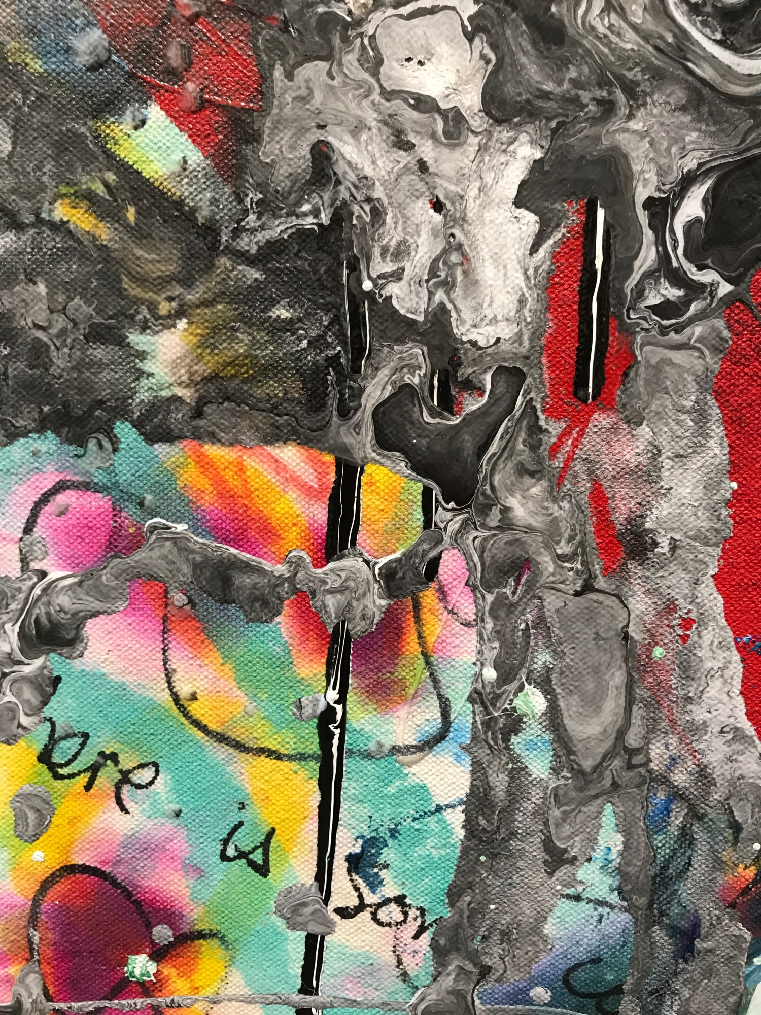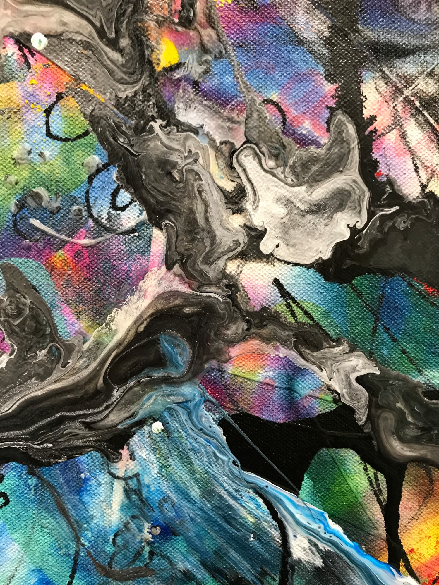 The next several layers are made up of doodles in different paint markers, opaque heavy body acrylic applied with a silicone wedge tool, poured acrylic media with pigment mixed in, and fluid acrylic dripped into wet media.