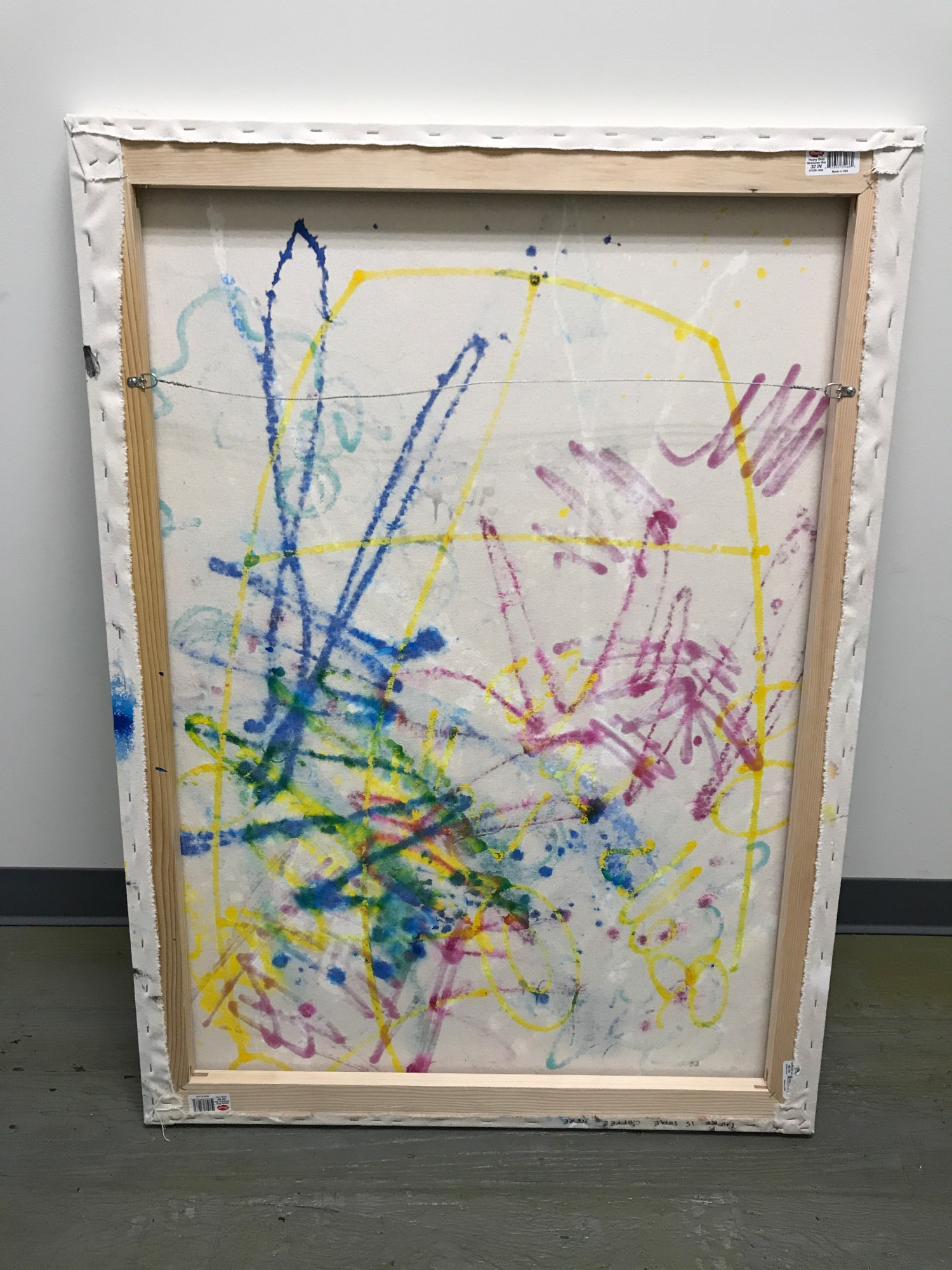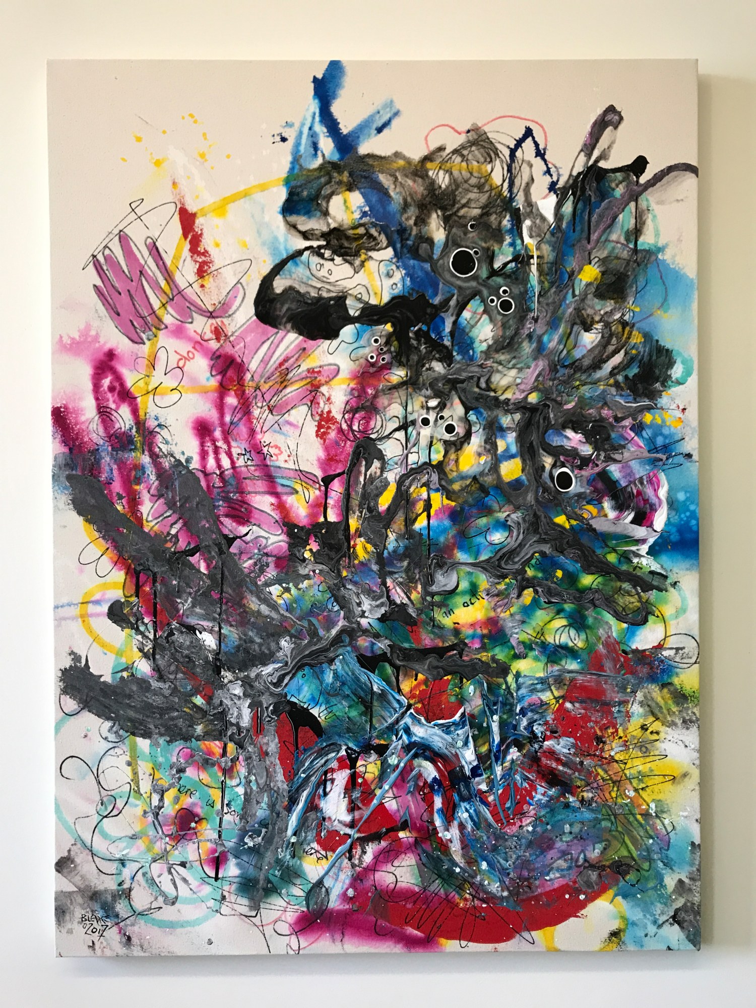 For this layered composition I started out doodling on raw, loose canvas with a Sharpie brand oil based paint marker and Krink brand enamel based paint markers. After letting those dry for a bit, I sprayed the canvas with water selectively, soaking parts and leaving other parts nearly dry. I applied high flow acrylic paint to the wet canvas, which soaked it up creating a dyed effect with nice gradients.