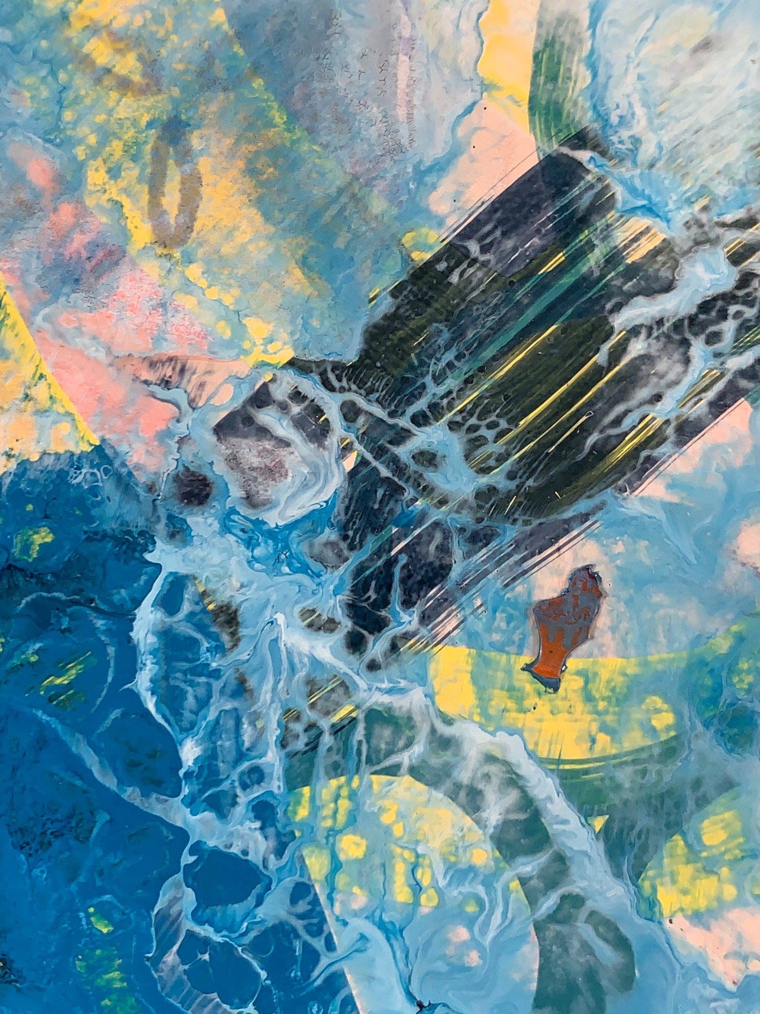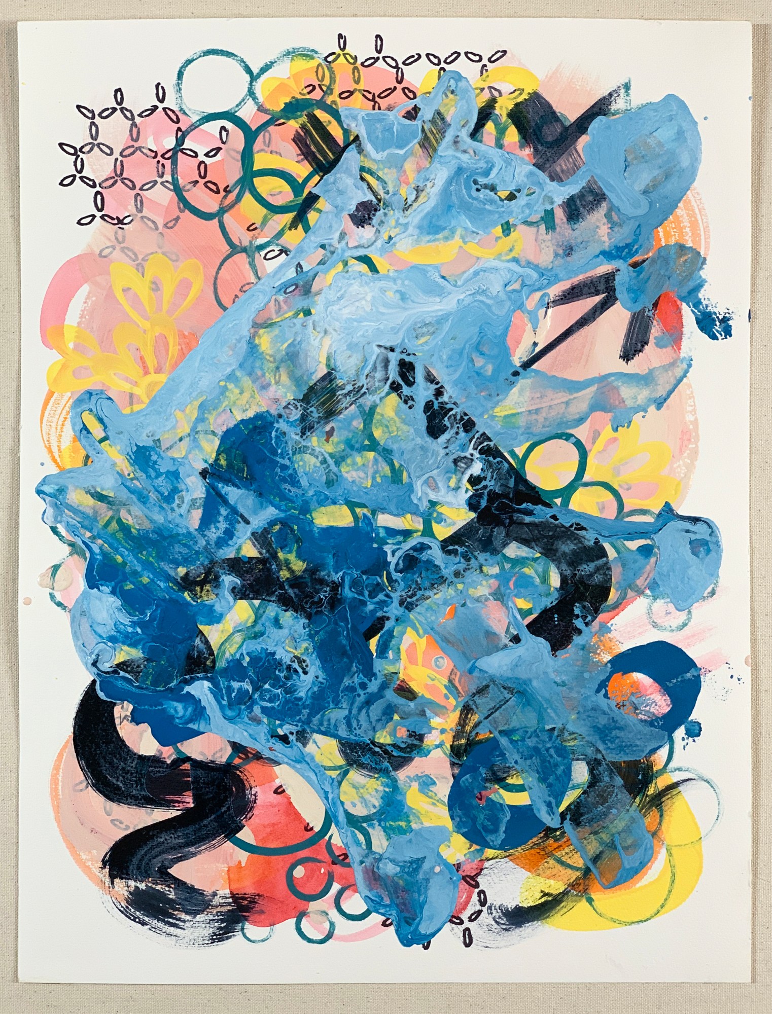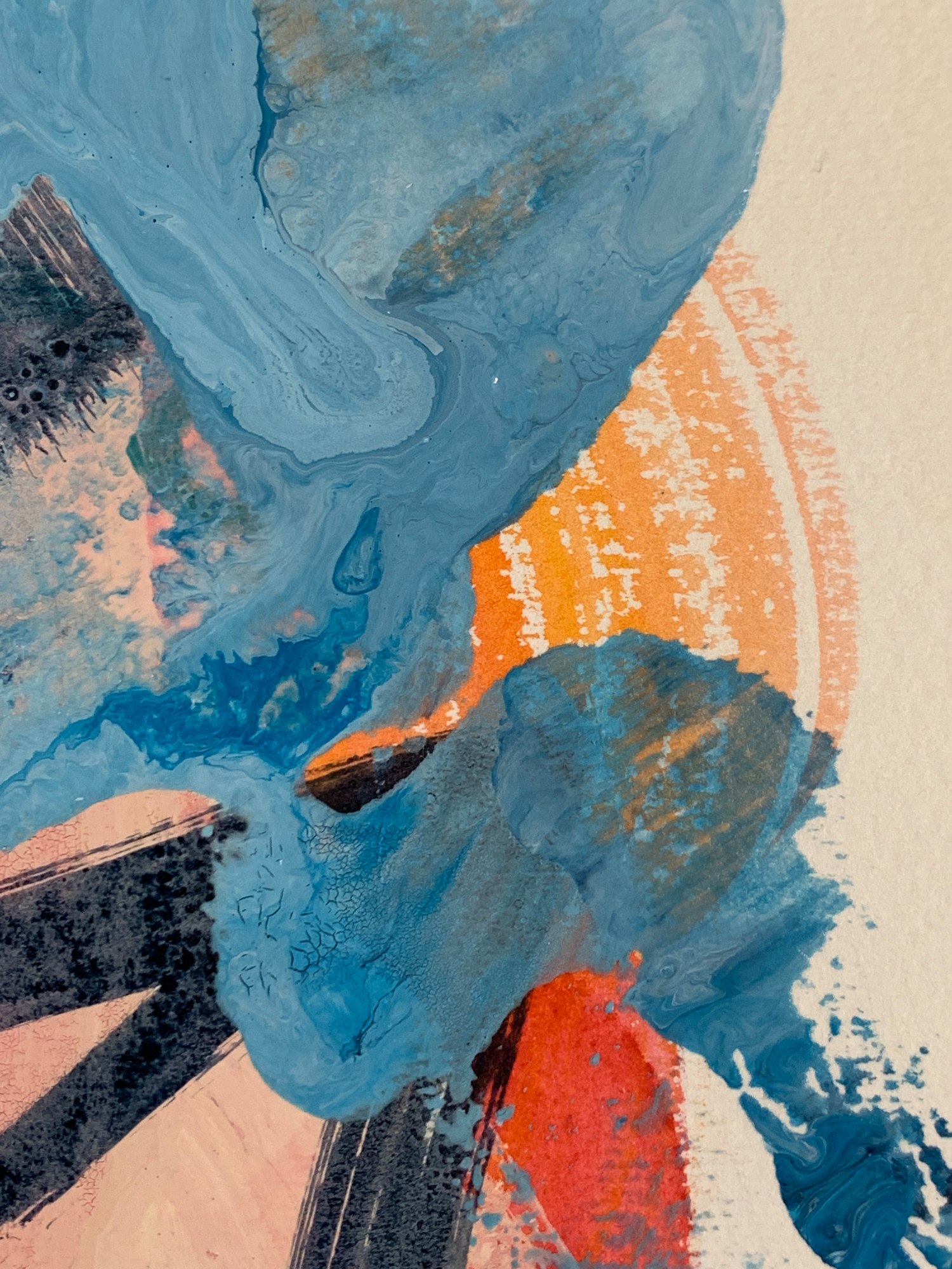 This one has some nice discordant energy to it. The thick dark brushstrokes sit awkwardly between the delicate watercolor washes in the background and ethereal poured paint in shades of sky blue. That watercolor paper background is such a bright bright white. Yet, it all seems to come together. I love the little spots of orange that come through in the arching brushstrokes of watercolor in the background, in the upper right, mid-upper left, and down there in the lower right corner muddled up and surrounded by yellow and punctured by blue.