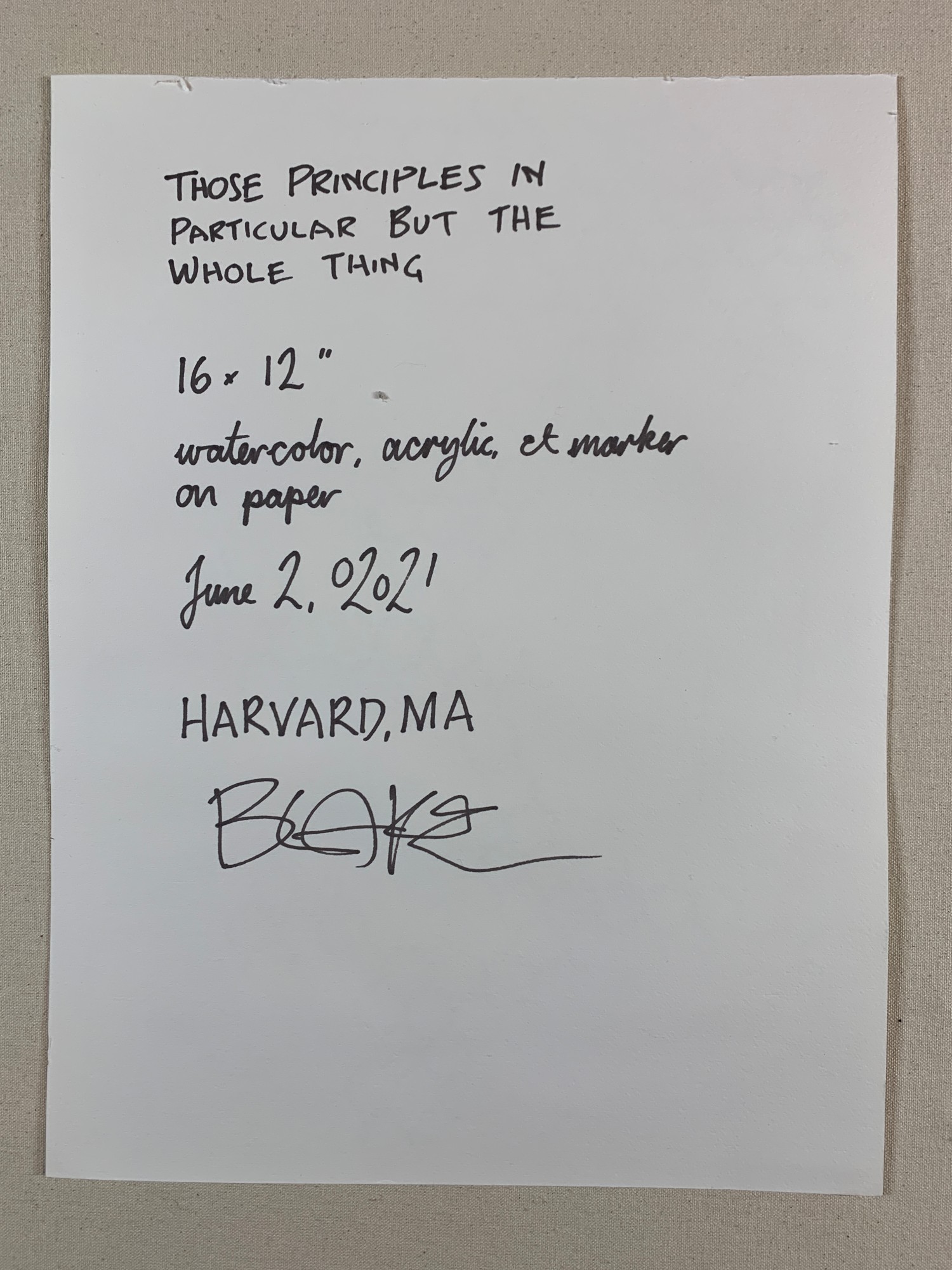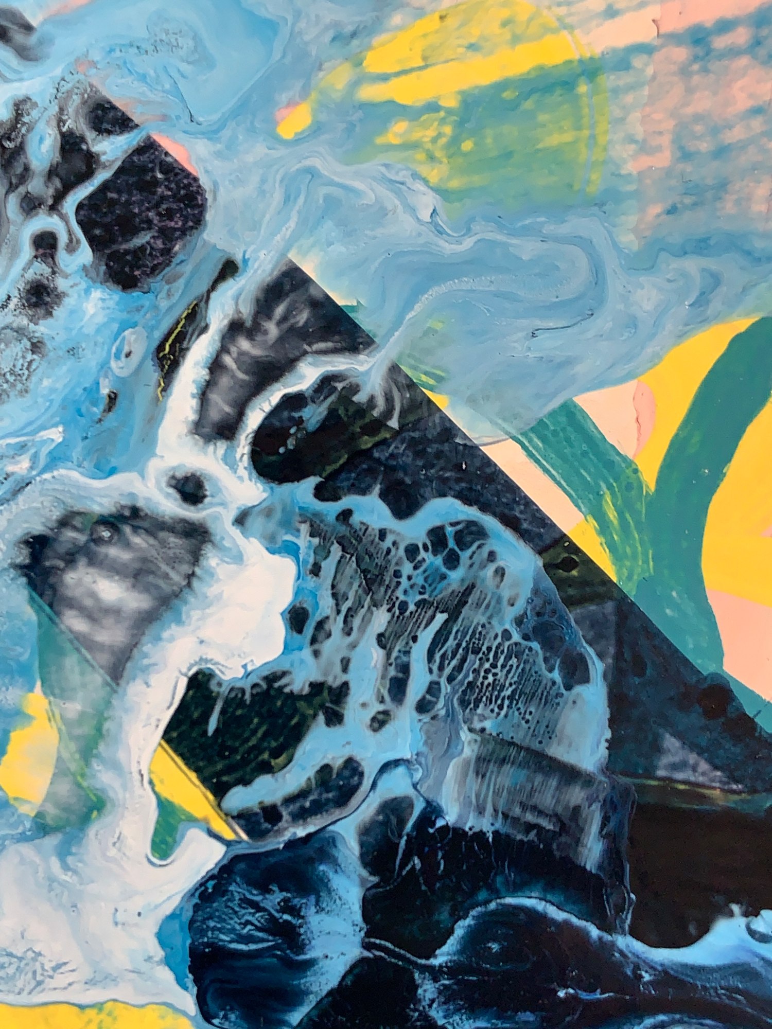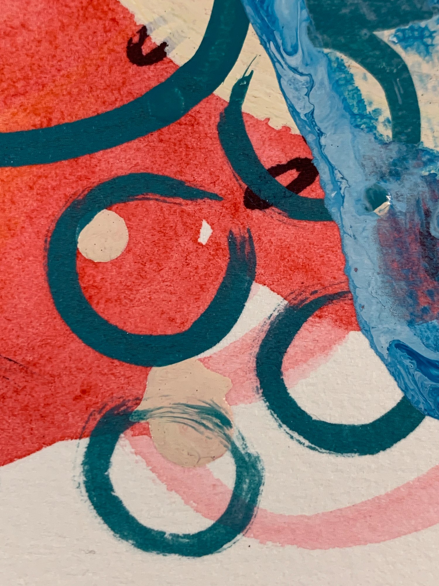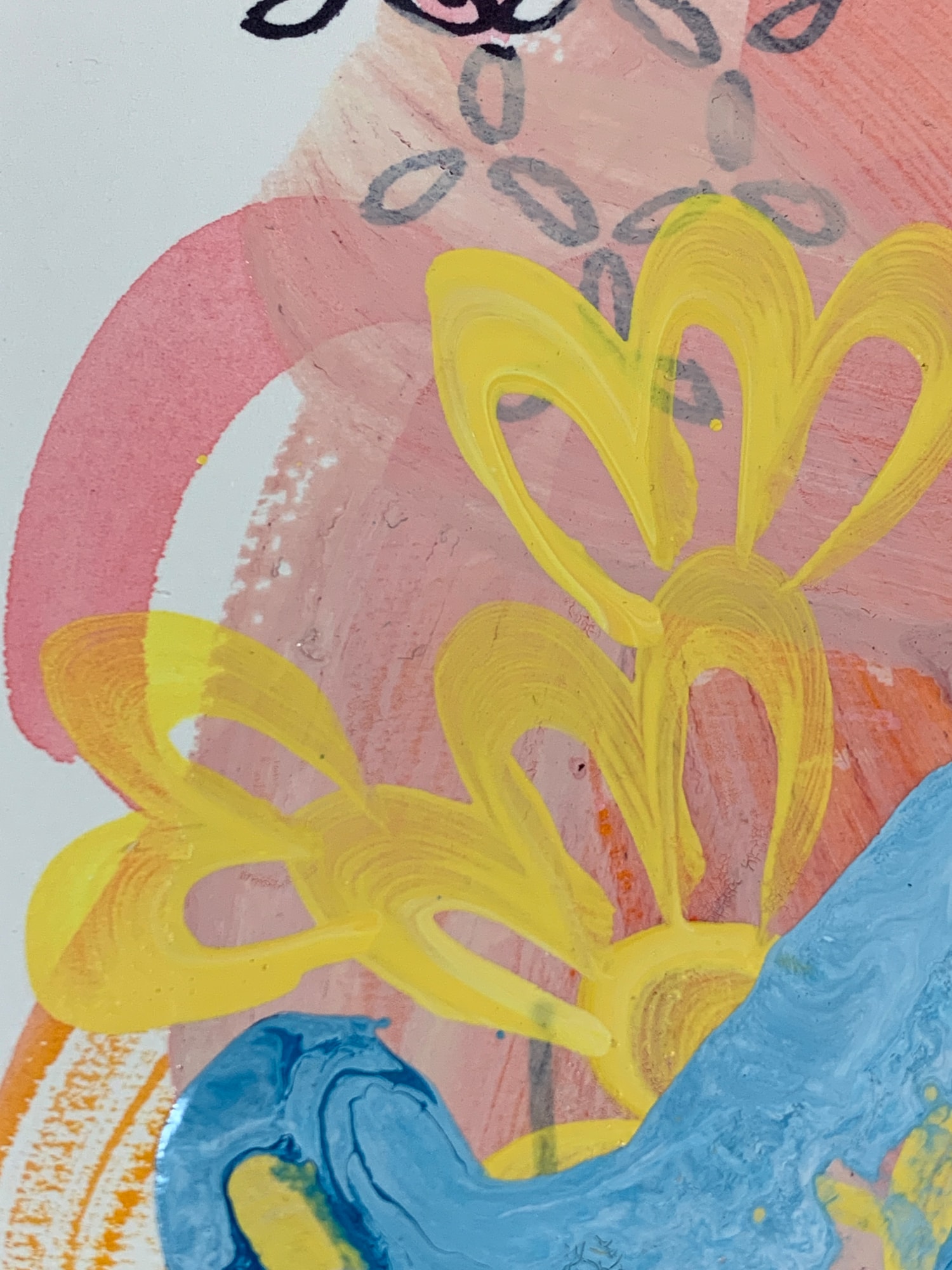 This one has some nice discordant energy to it. The thick dark brushstrokes sit awkwardly between the delicate watercolor washes in the background and ethereal poured paint in shades of sky blue. That watercolor paper background is such a bright bright white. Yet, it all seems to come together. I love the little spots of orange that come through in the arching brushstrokes of watercolor in the background, in the upper right, mid-upper left, and down there in the lower right corner muddled up and surrounded by yellow and punctured by blue.
