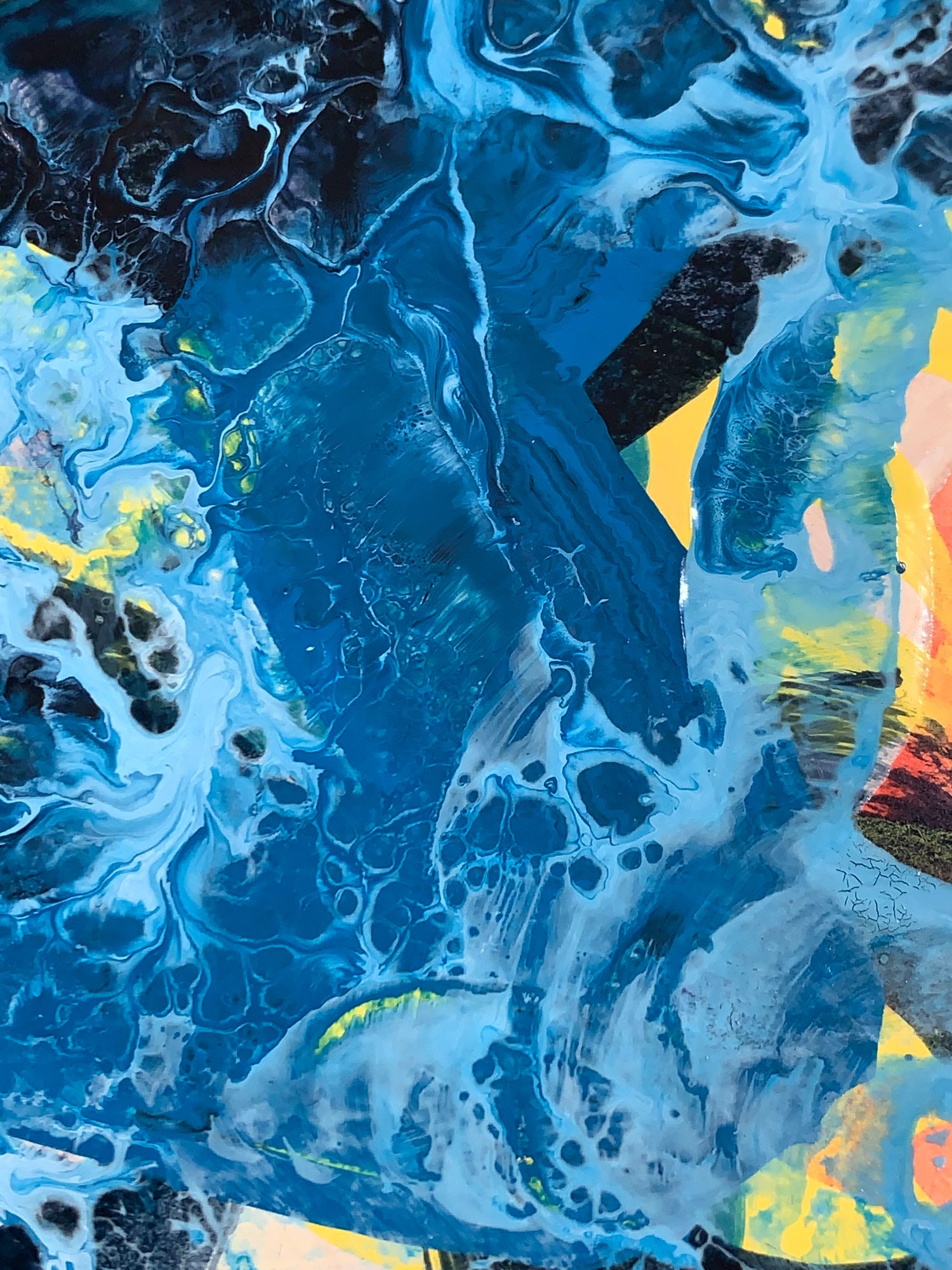 This one has some nice discordant energy to it. The thick dark brushstrokes sit awkwardly between the delicate watercolor washes in the background and ethereal poured paint in shades of sky blue. That watercolor paper background is such a bright bright white. Yet, it all seems to come together. I love the little spots of orange that come through in the arching brushstrokes of watercolor in the background, in the upper right, mid-upper left, and down there in the lower right corner muddled up and surrounded by yellow and punctured by blue.