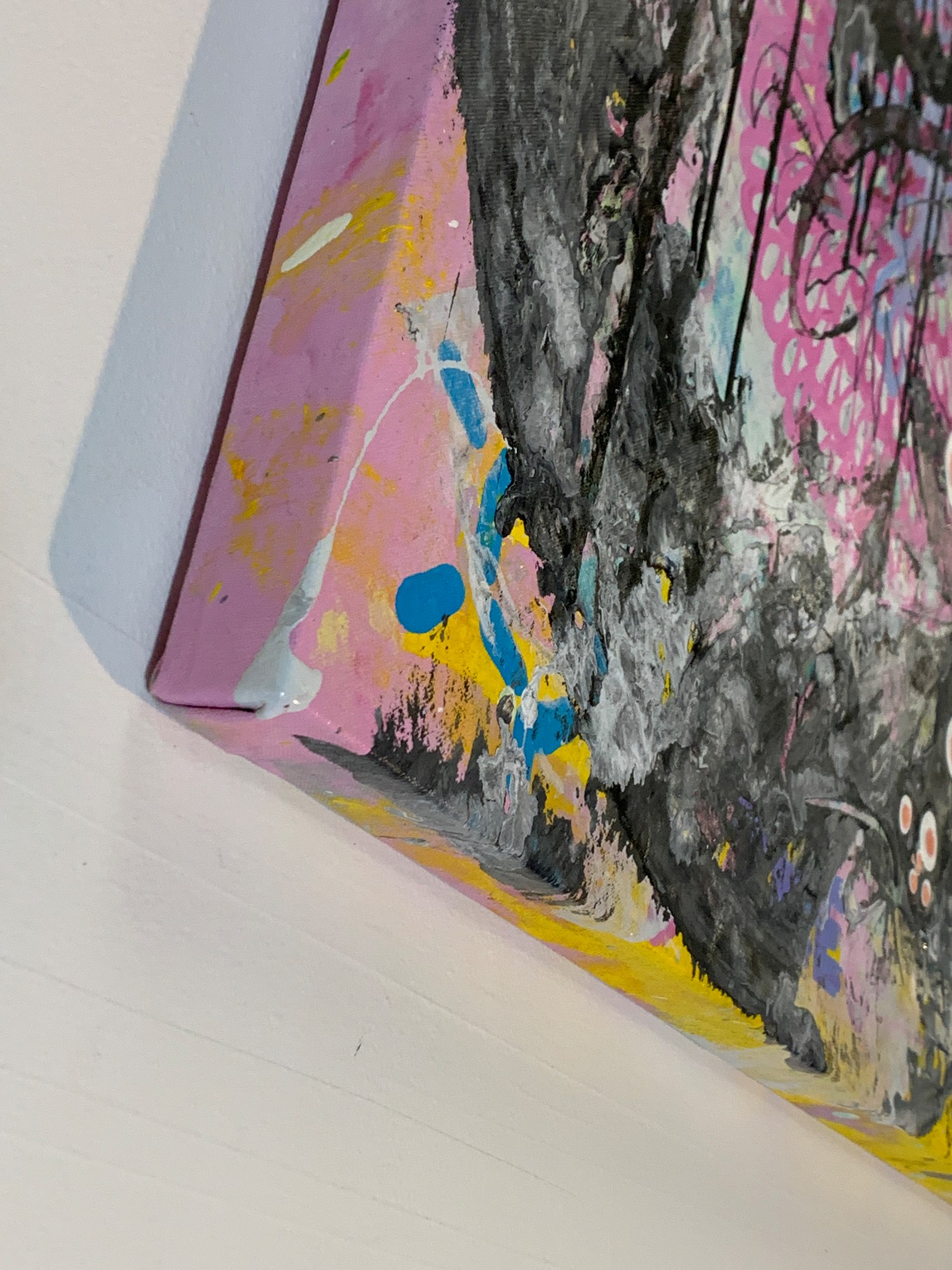 This is a painting I made during my 2019 artists residency at the Studios at MASS MoCA. It was a couple months before the birth of my son and I was immersing myself in natural childbirth technique and philosophy, the content of some books on the matter represented in snippets of text in this painting. This painting represents change, looking back at what has been and looking forward to what will be with excitement and trepidation.