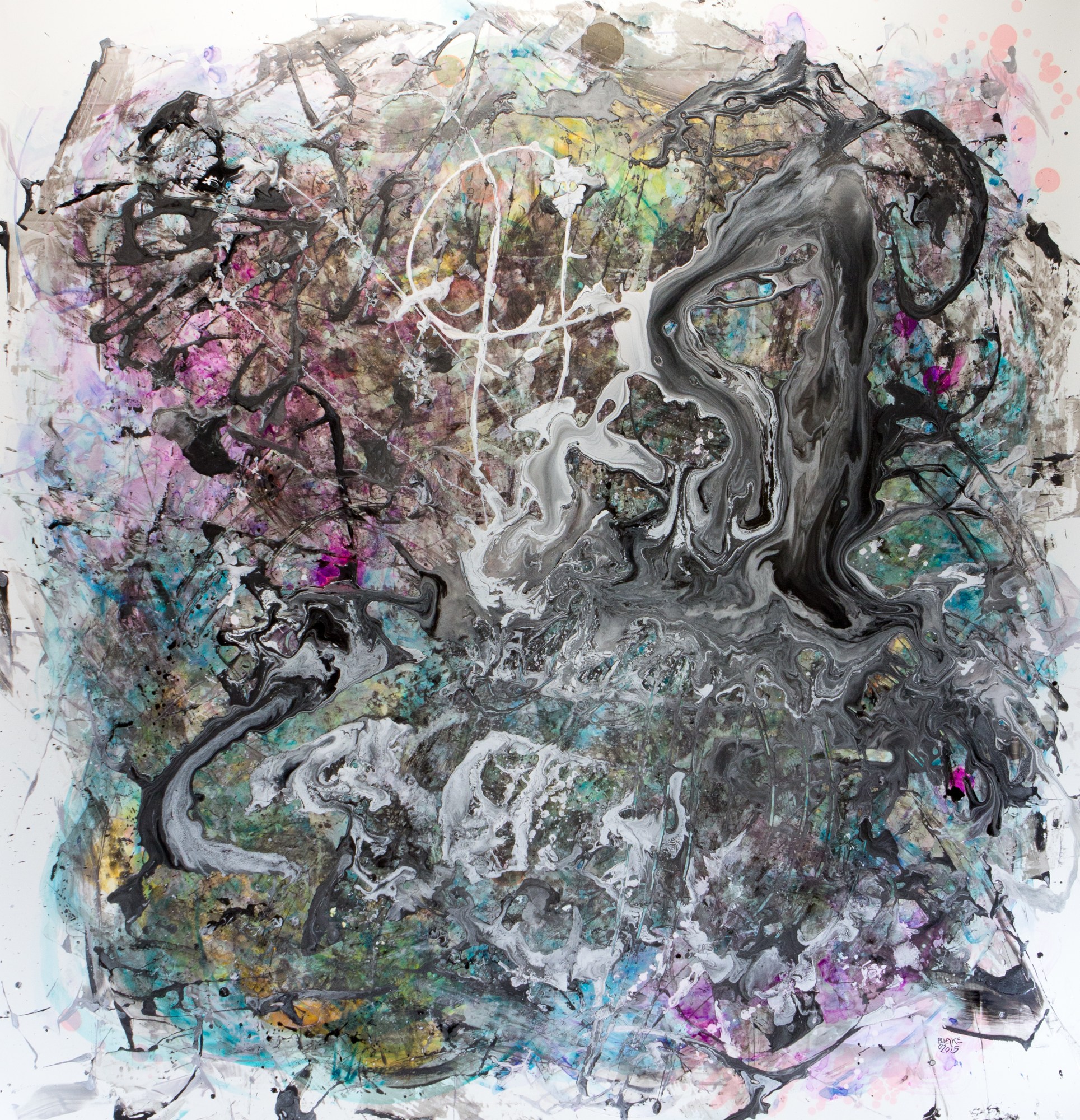 I created this painting on a 60" x 58" sheet of textured polypropylene. It is to be stretched on a gallery depth frame which will trim two inches from each side for final dimensions of 56 x 54". The image shown takes this into account and is representative of what the finished, stretched painting will look like.