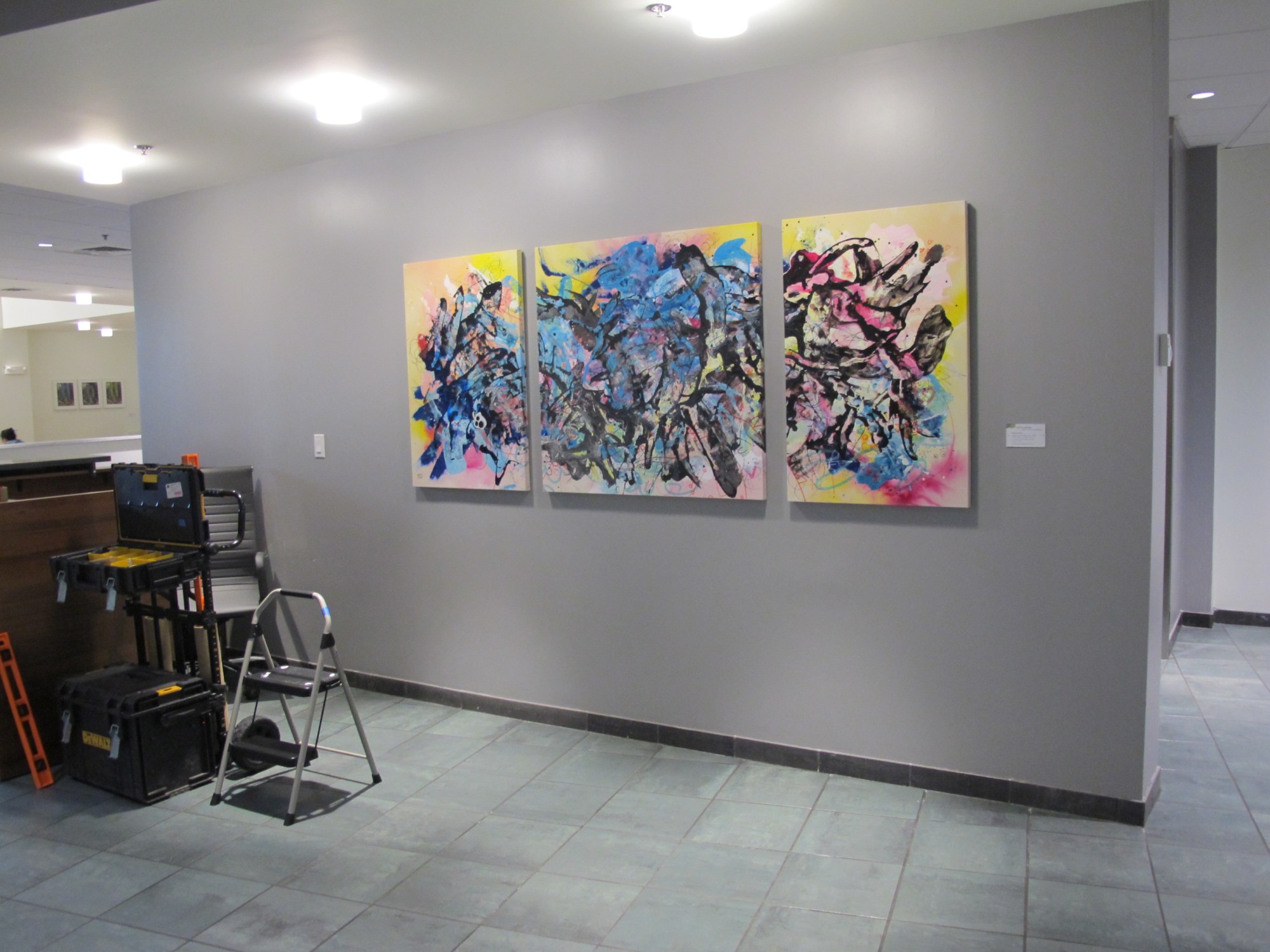 The triptych form warps what is already a three dimensional hyperplane into a set of volumetric objects with a direct relationship to the more banal third dimension of every day life. The painting presents a space within the space.