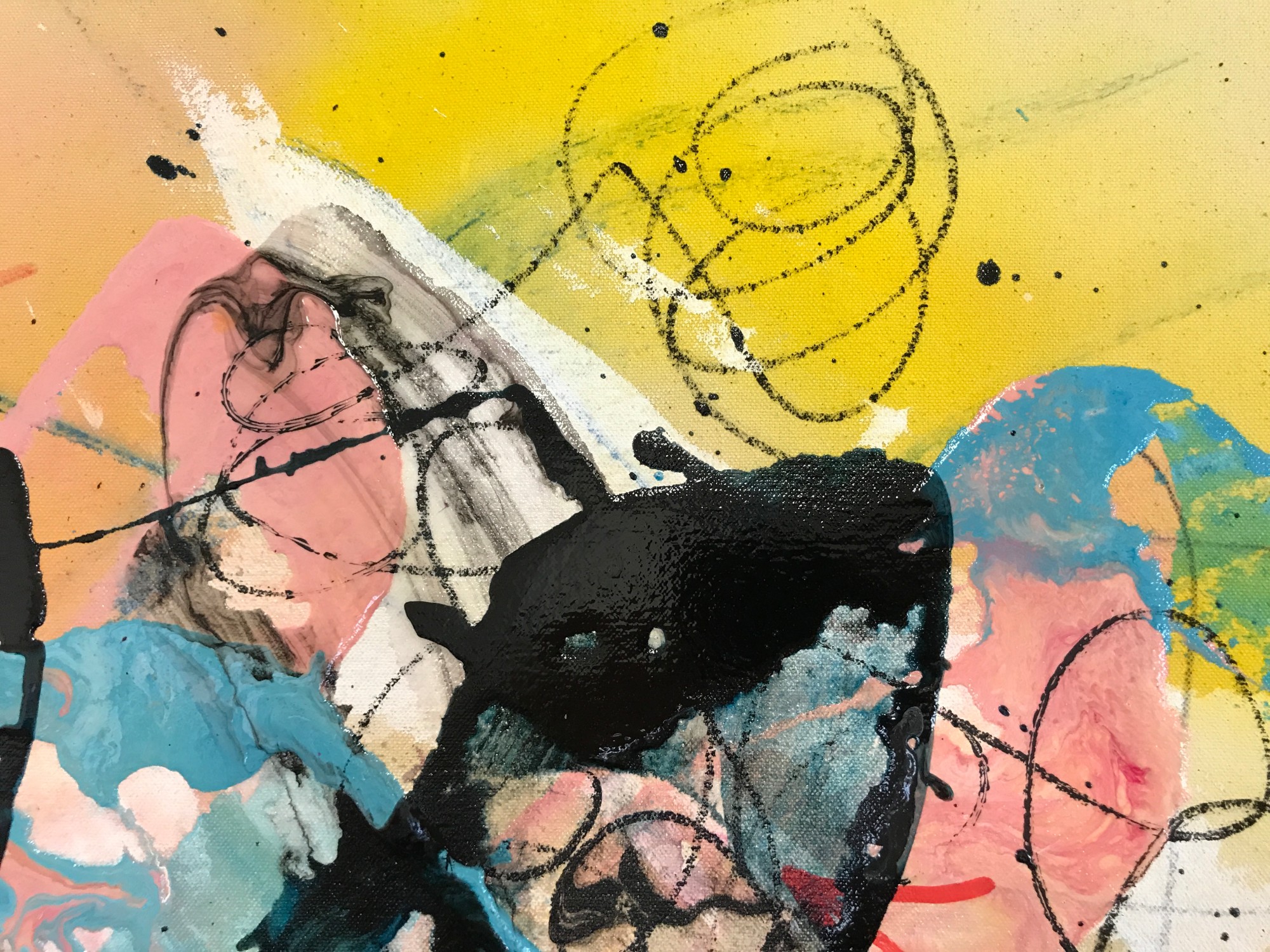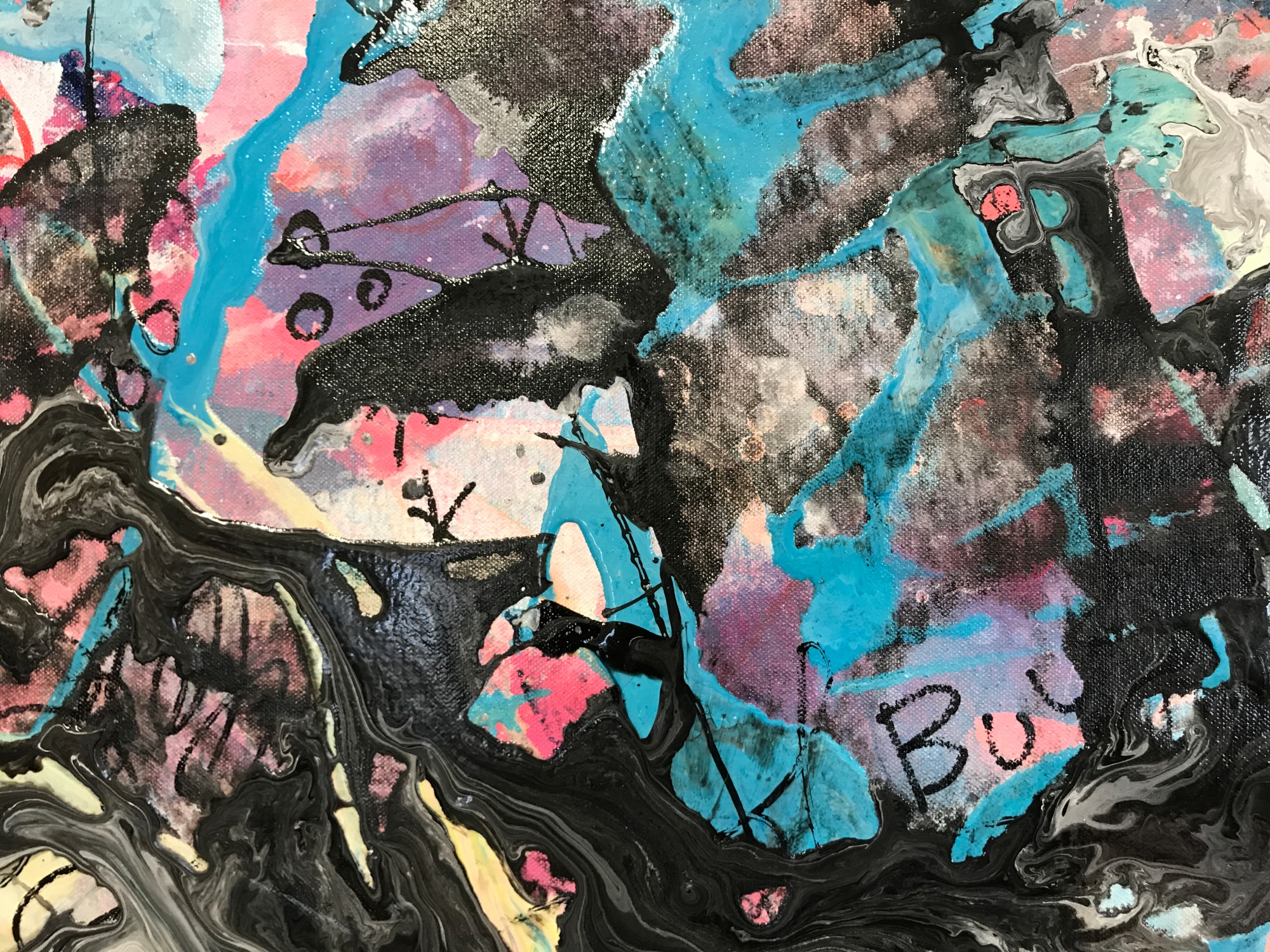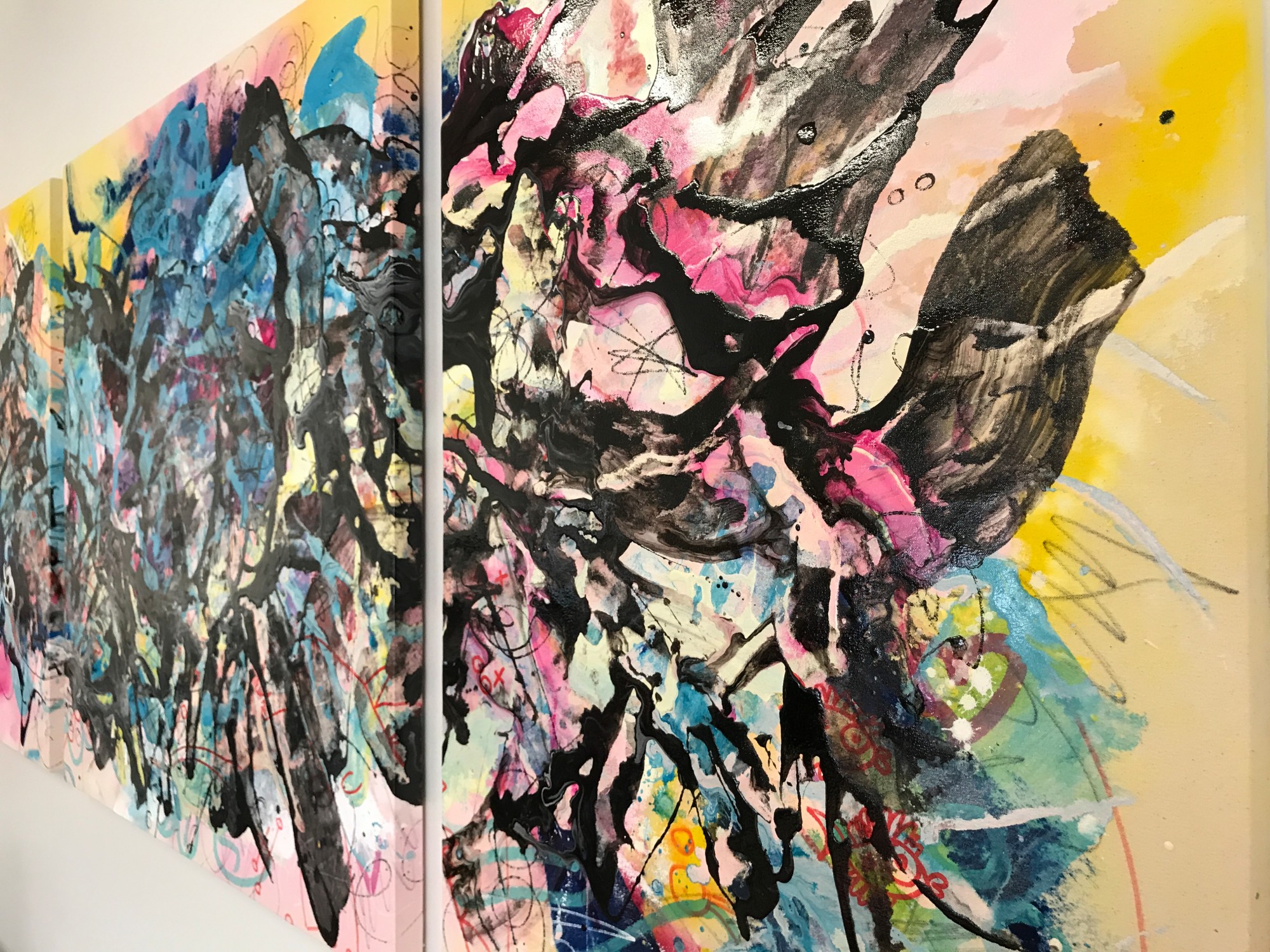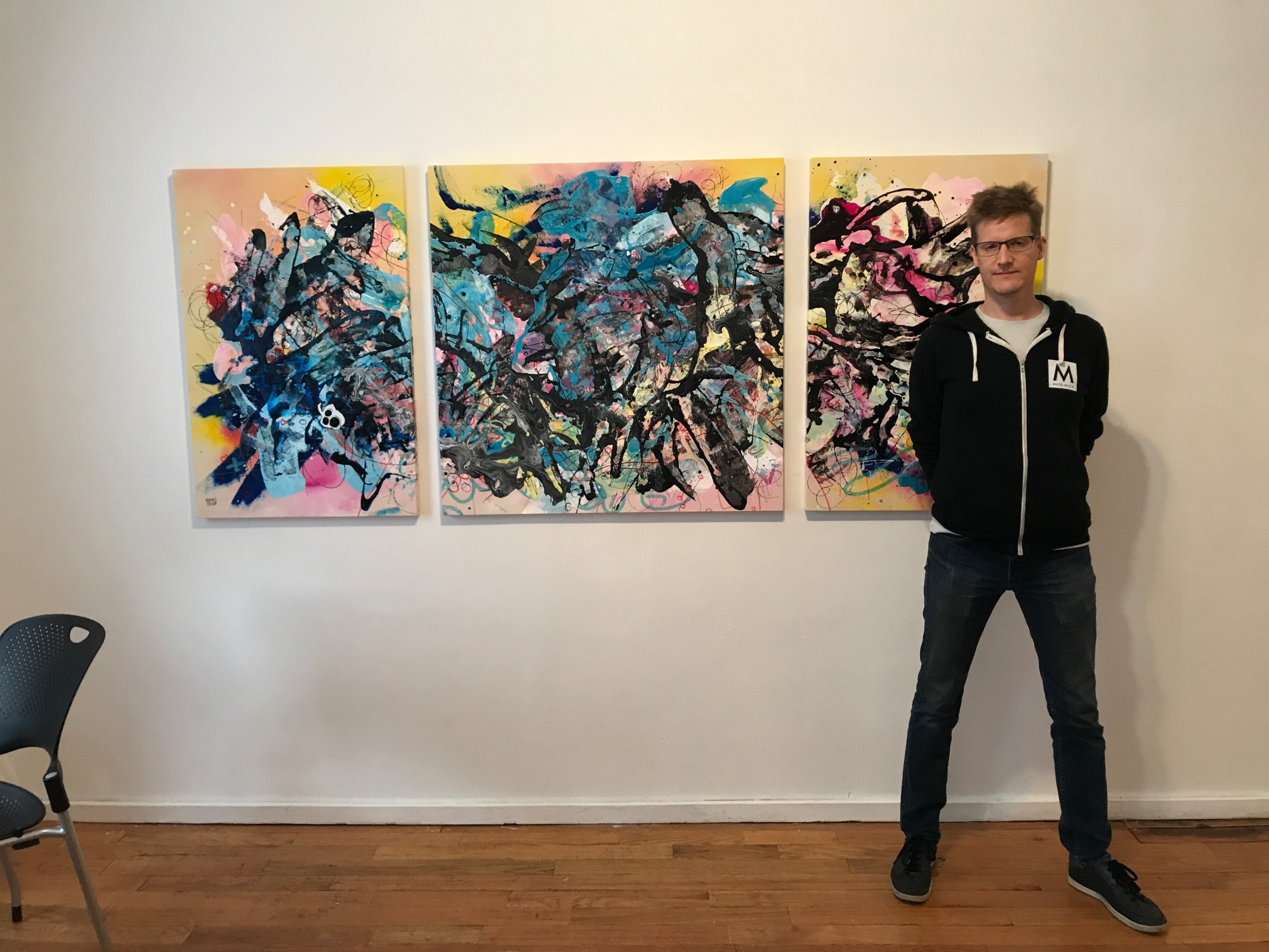 "Turtles All the Way Down" is an abstract triptych exploring ideas about emergence of complex systems from simple frameworks and contained chaos. There is an explosion of material and mark making bursting out of the center of this composition, but mostly not making it all the way to the edges, as if contained by invisible forces like a magnetic field holding in the constituent elements in a fusion reaction.