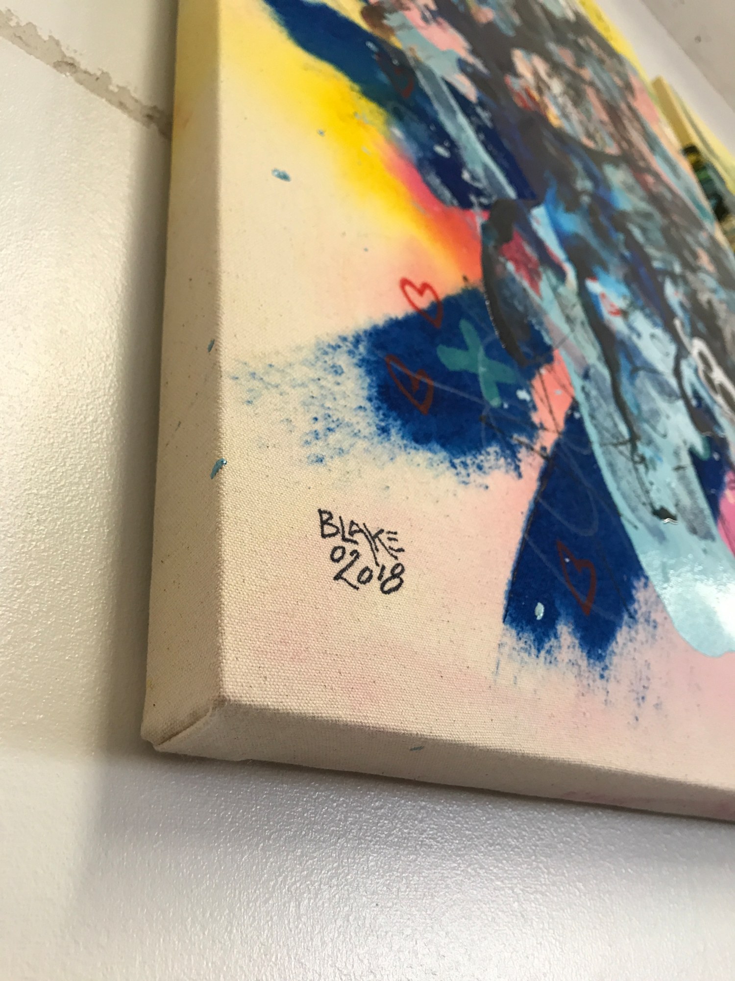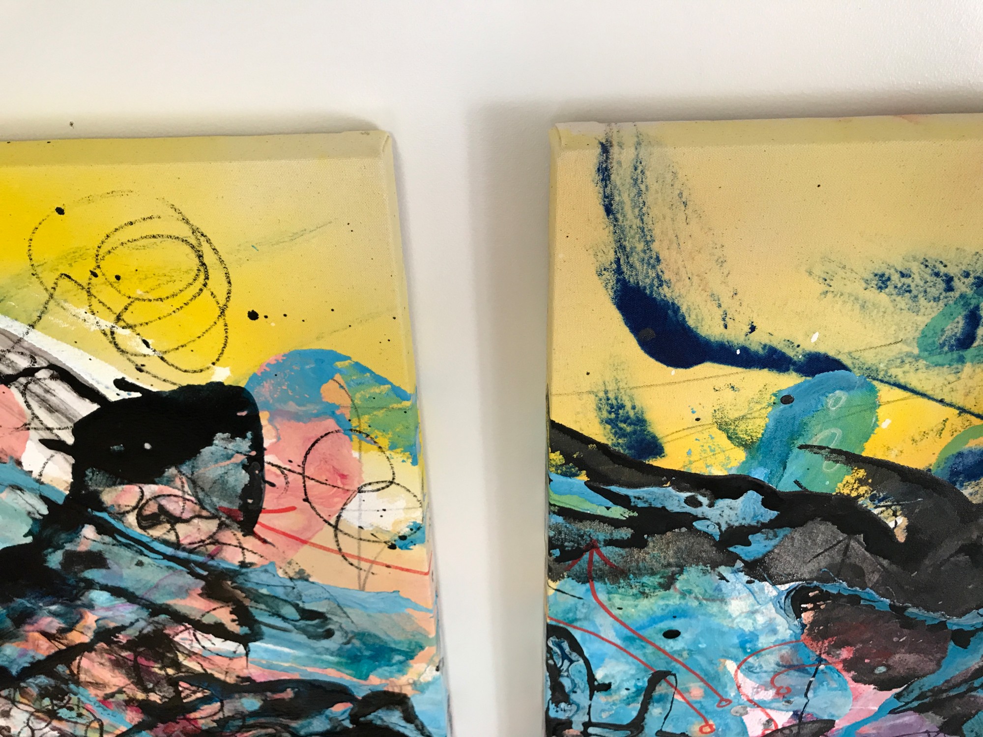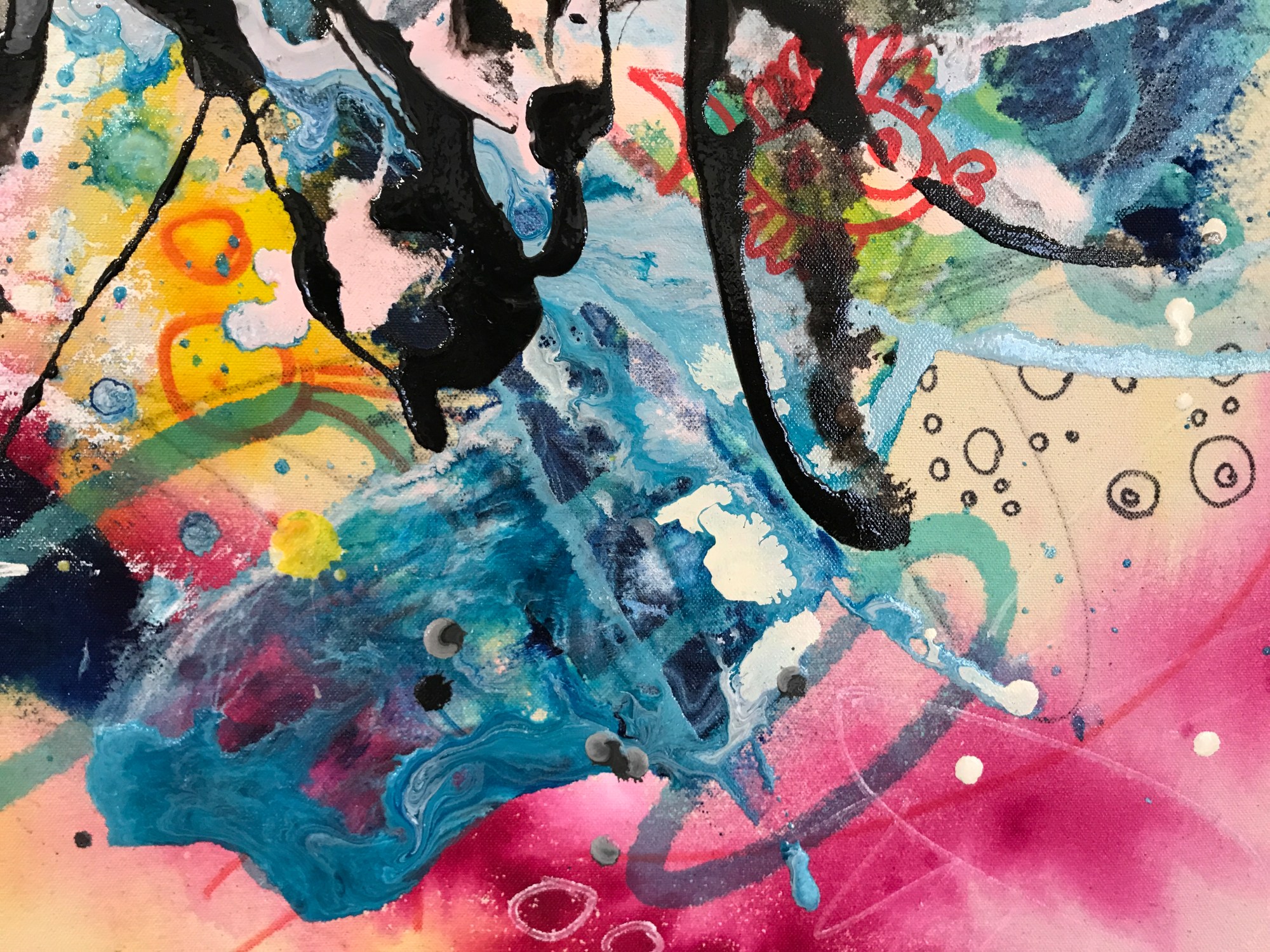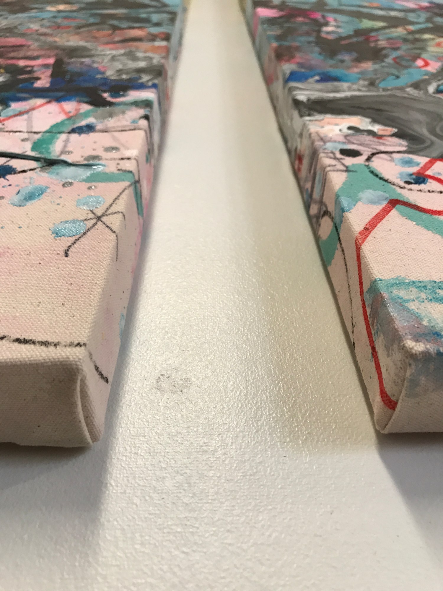 "Turtles All the Way Down" is an abstract triptych exploring ideas about emergence of complex systems from simple frameworks and contained chaos. There is an explosion of material and mark making bursting out of the center of this composition, but mostly not making it all the way to the edges, as if contained by invisible forces like a magnetic field holding in the constituent elements in a fusion reaction.
