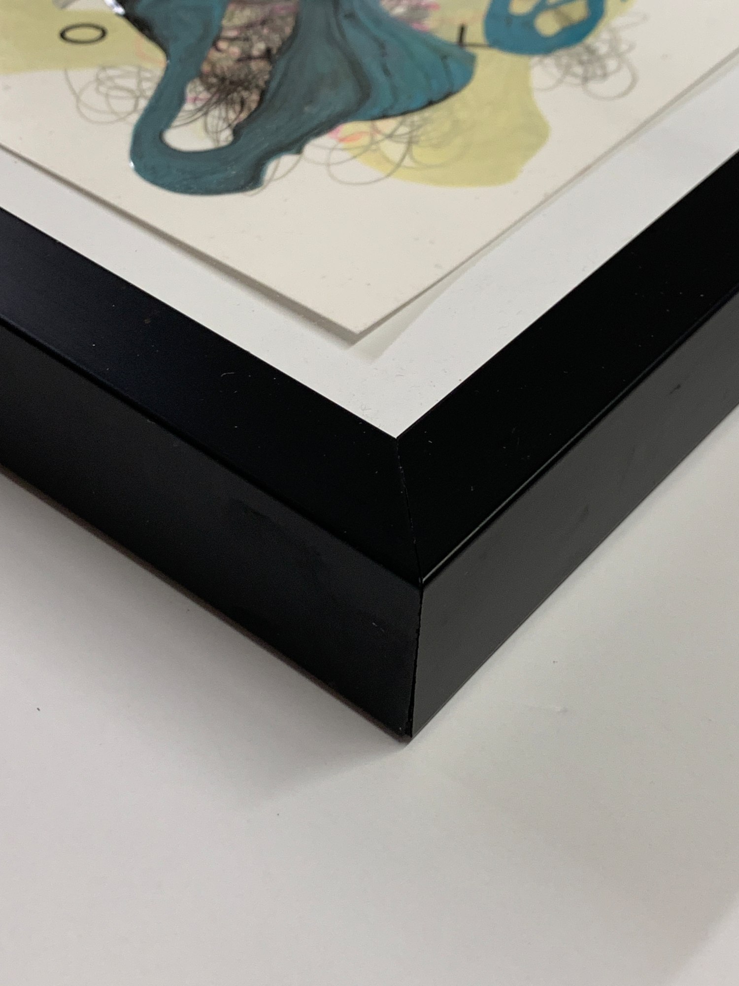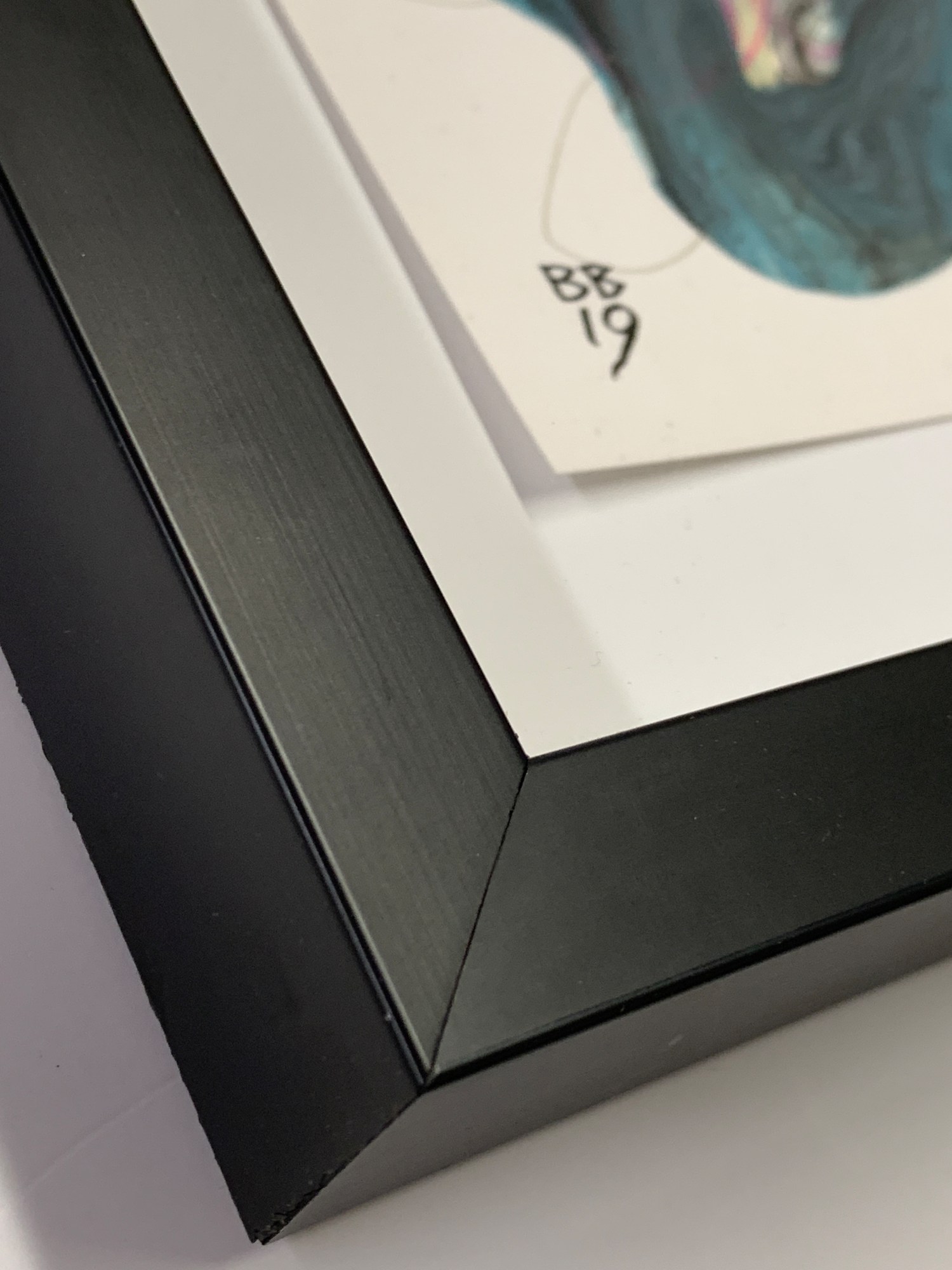 This painting is framed in a gallery deep shadowbox frame with a bit of a lift to the mount (the painting is raised a bit from the back of the frame so it appears to float in the frame).