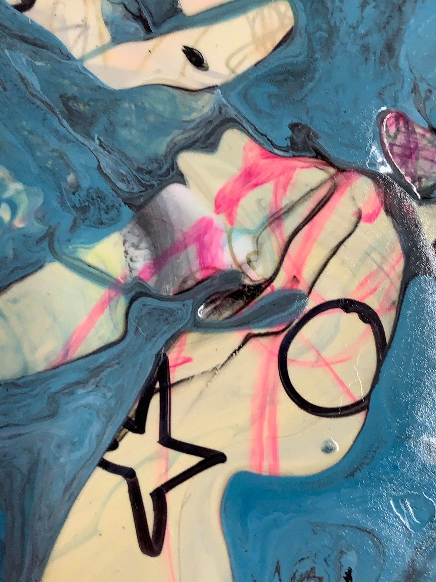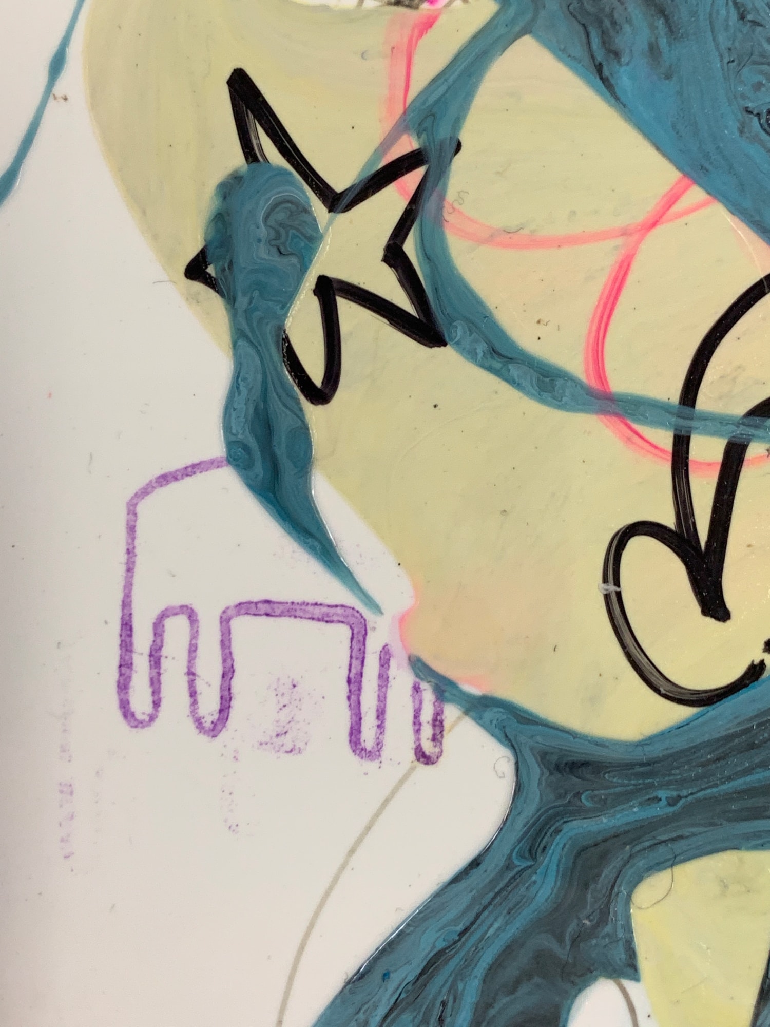This is a fun little abstract painting with some cartoon elements in it. You can see the rear segment of a Marm stamp in the middle left, and doodles of stars, a bunny/dog, and a cloud princess. We've also got scribbles in ballpoint pen, sharpie marker, and poured acrylic paint.