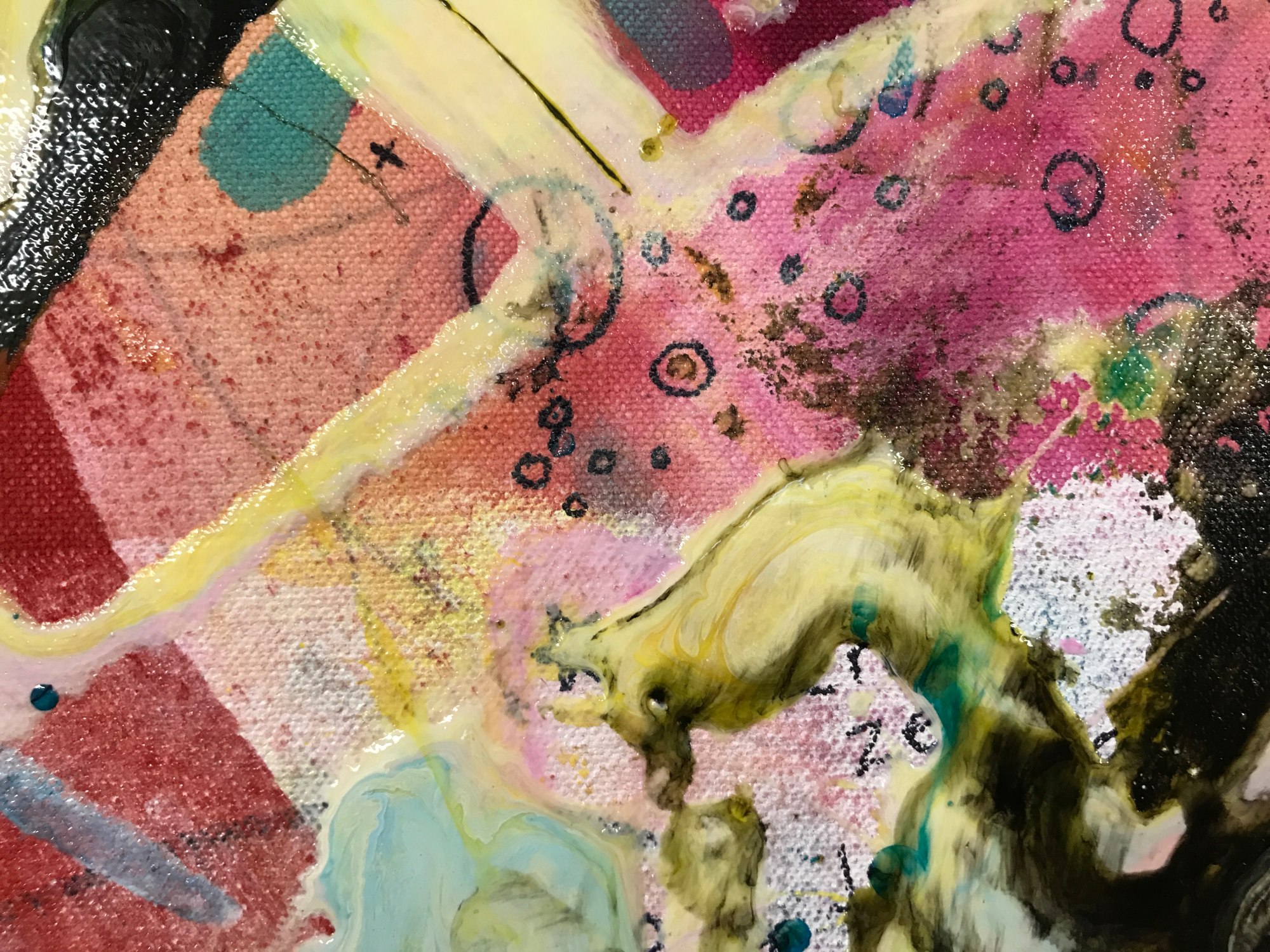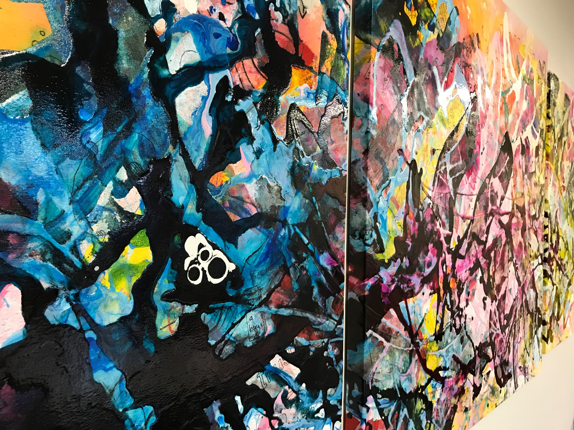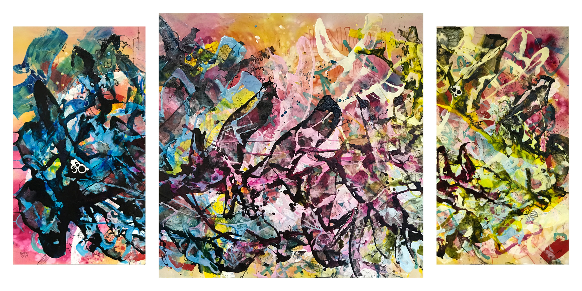 Wow! This painting is peek maximalism and it is just packed full and bursting at the seems. This is part of a series I'm calling "This One Weird Trick" mostly because the paintings in the series all involve using this specific method of smearing dark paint around with a sculpting wedge over bright colored backgrounds. But dang does it create a heck of a space to dive into in this painting. The fact that it is a triptych too; look, I'm writing this in 2023 and I can't believe this painting wasn't in the archive yet and I was on fire when I made this.
