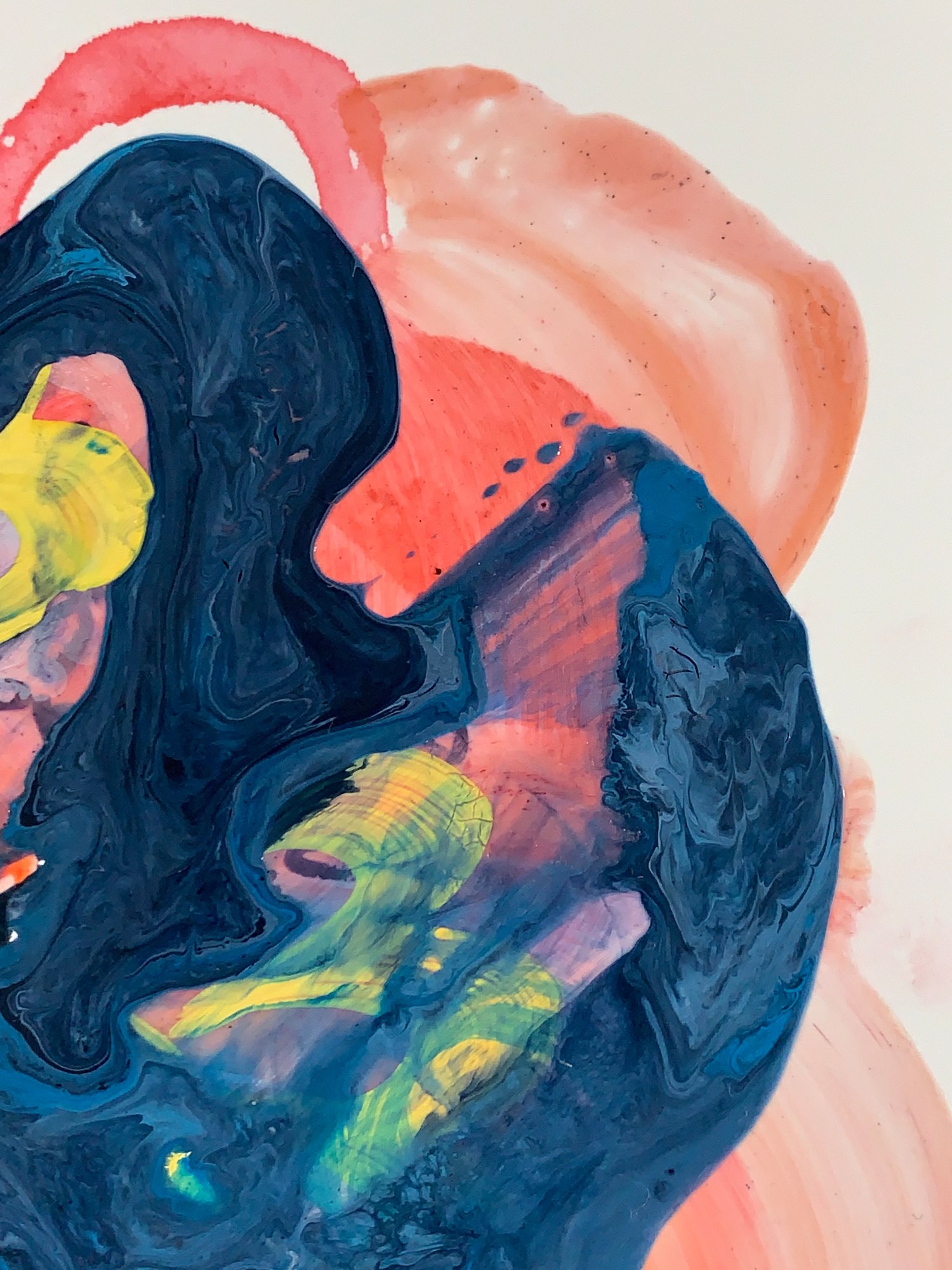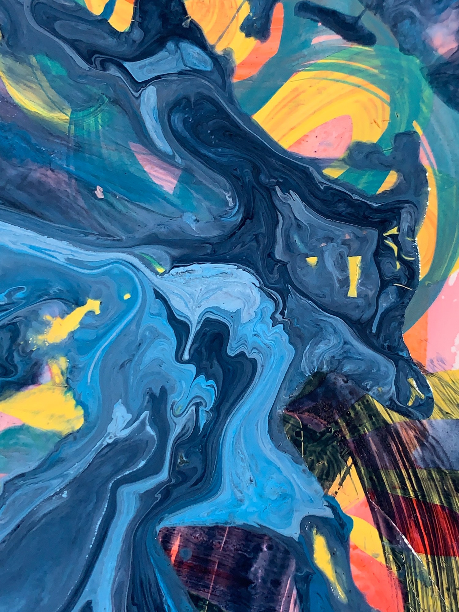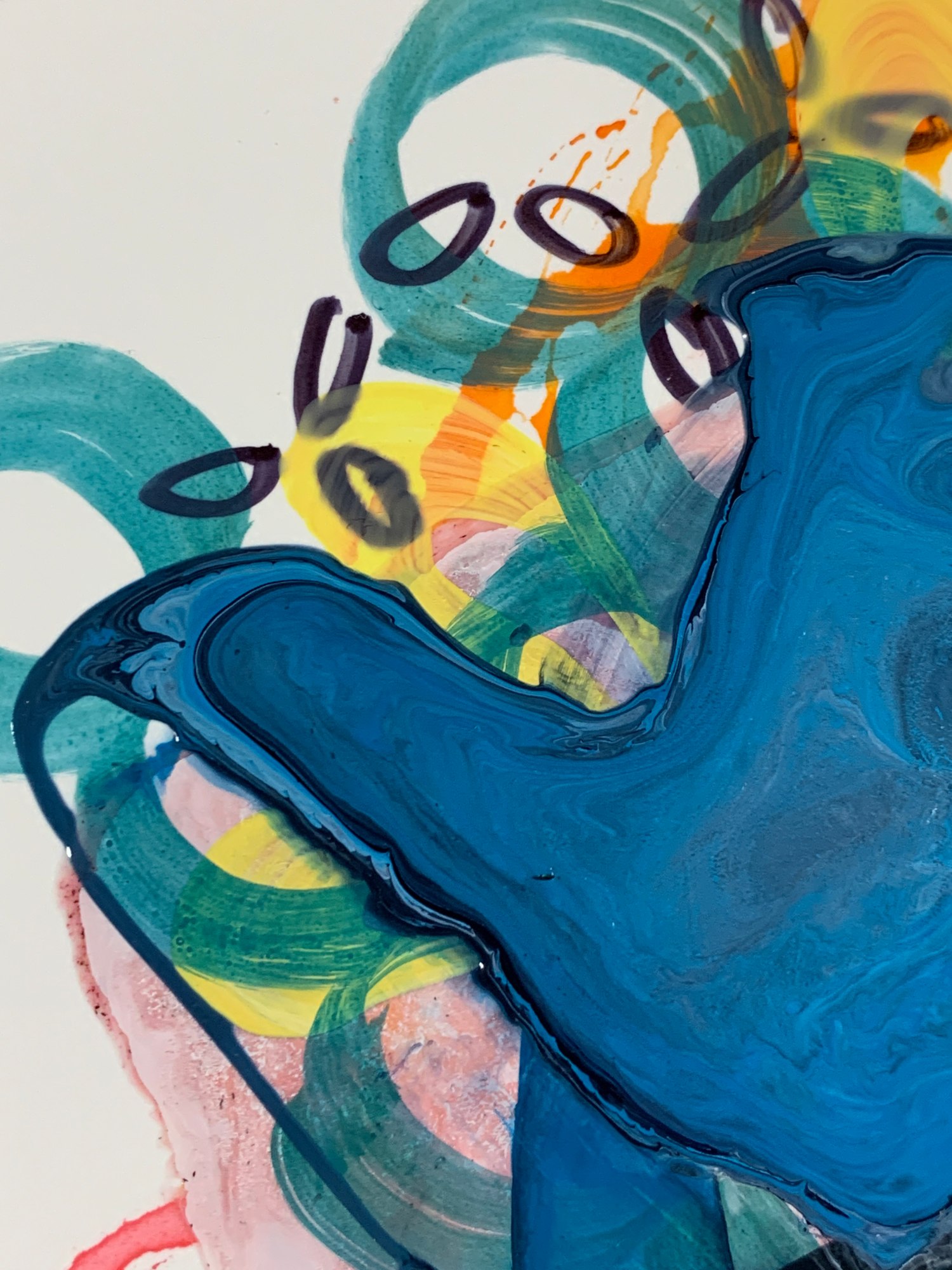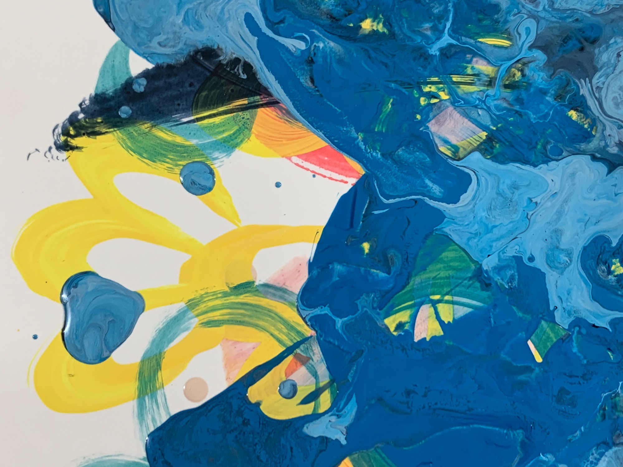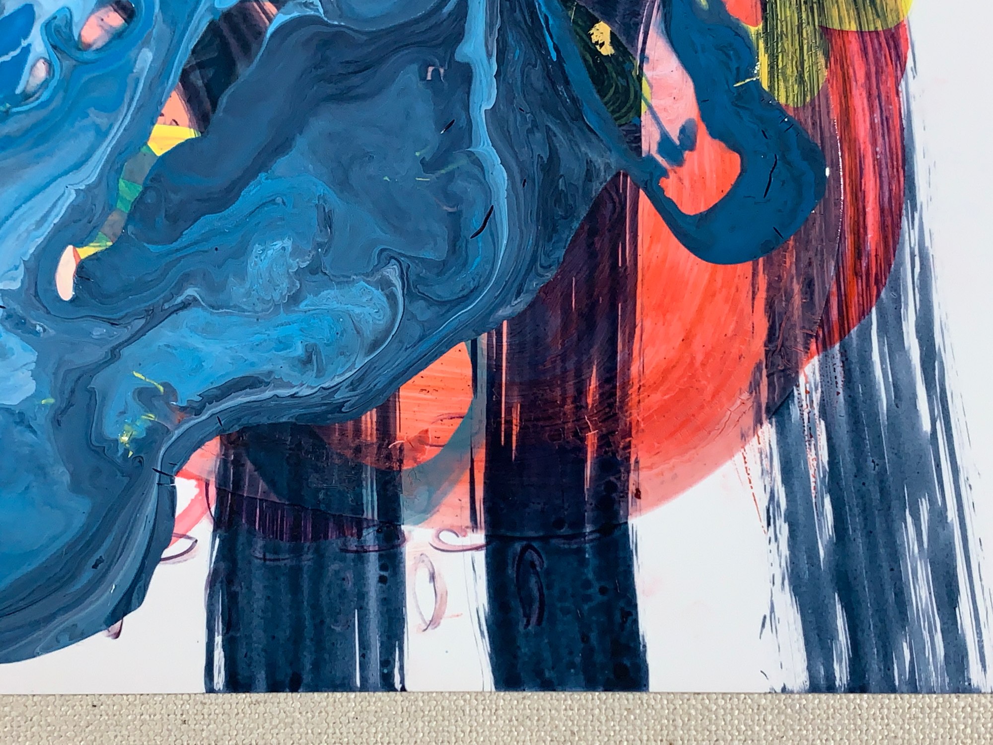 This painting features a watercolor background in reds and oranges, hexagon pattern and some doodles in marker, vine pattern in yellow acrylic, overlapping circles in aqua acrylic, dark thick brushstrokes, and acrylic poured paint in tones of sky blue. There is some crazing in the poured paint.