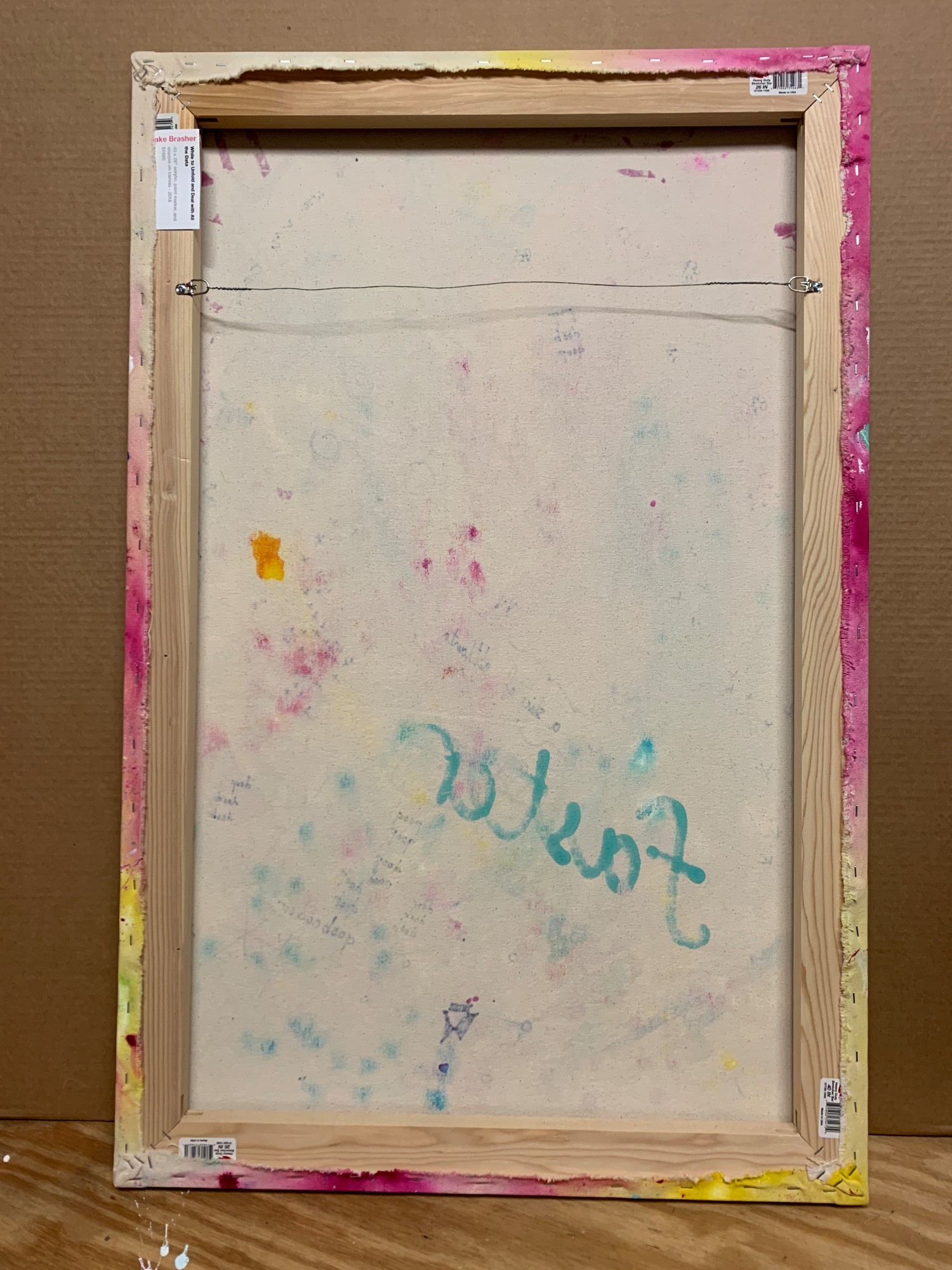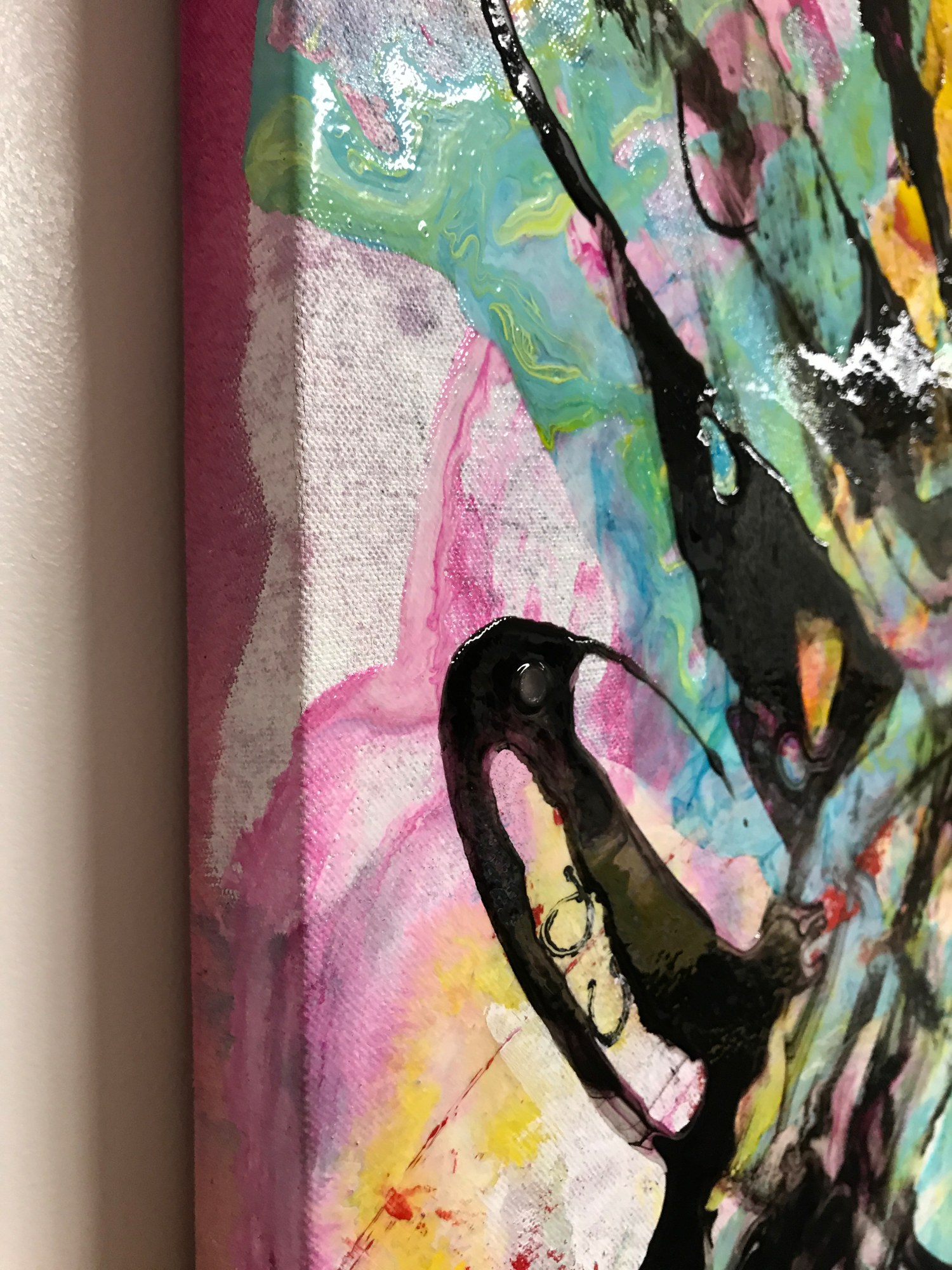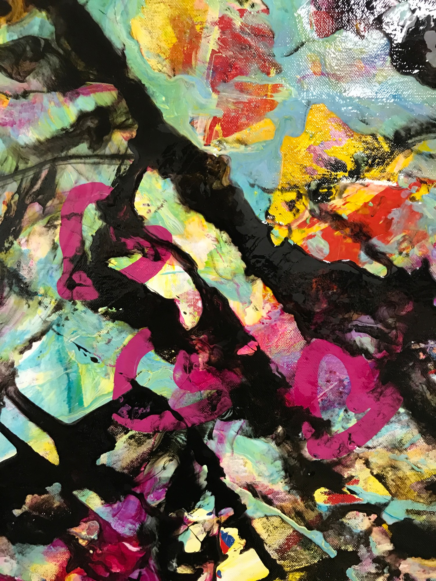 This is a wild, colorful abstract composition with a lot of gestural movement in it. It's composed of layers of poured paint, smeared paint, and some marker doodles over stained raw canvas.