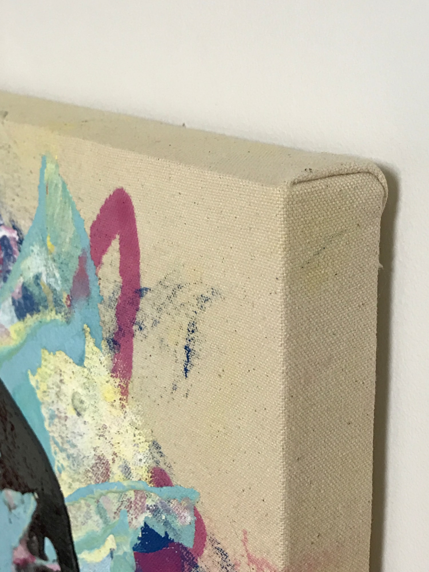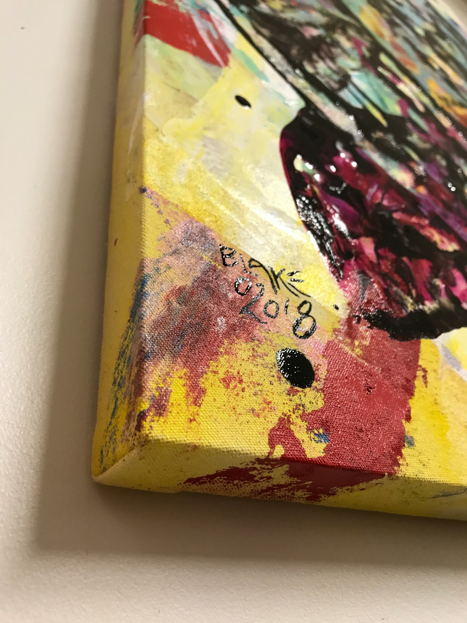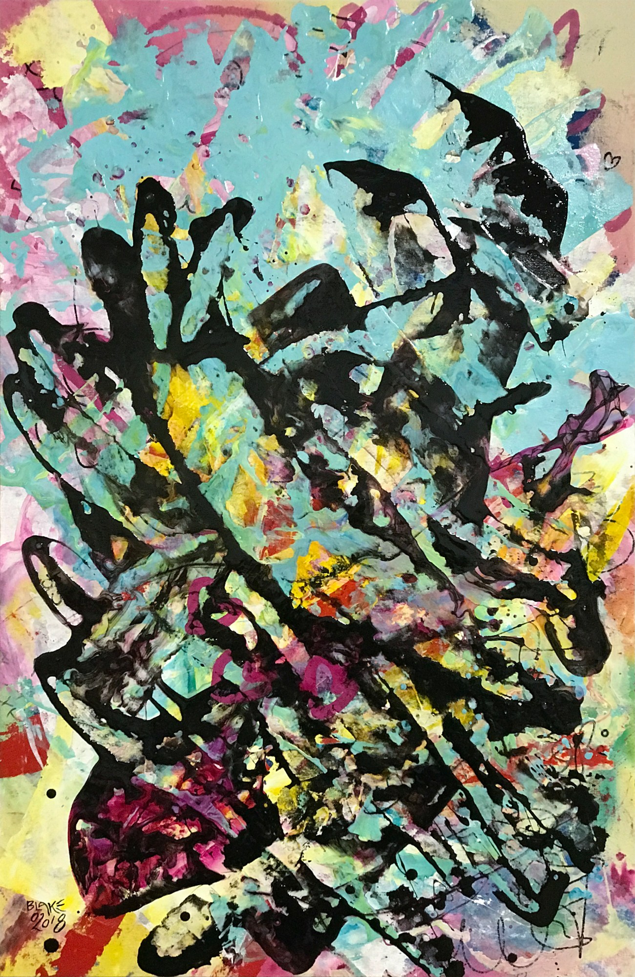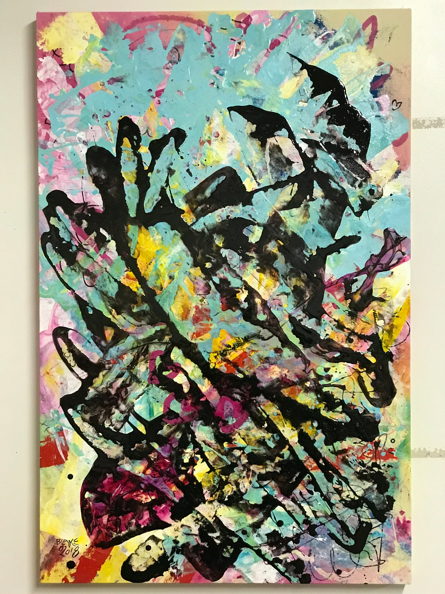 This is a wild, colorful abstract composition with a lot of gestural movement in it. It's composed of layers of poured paint, smeared paint, and some marker doodles over stained raw canvas.