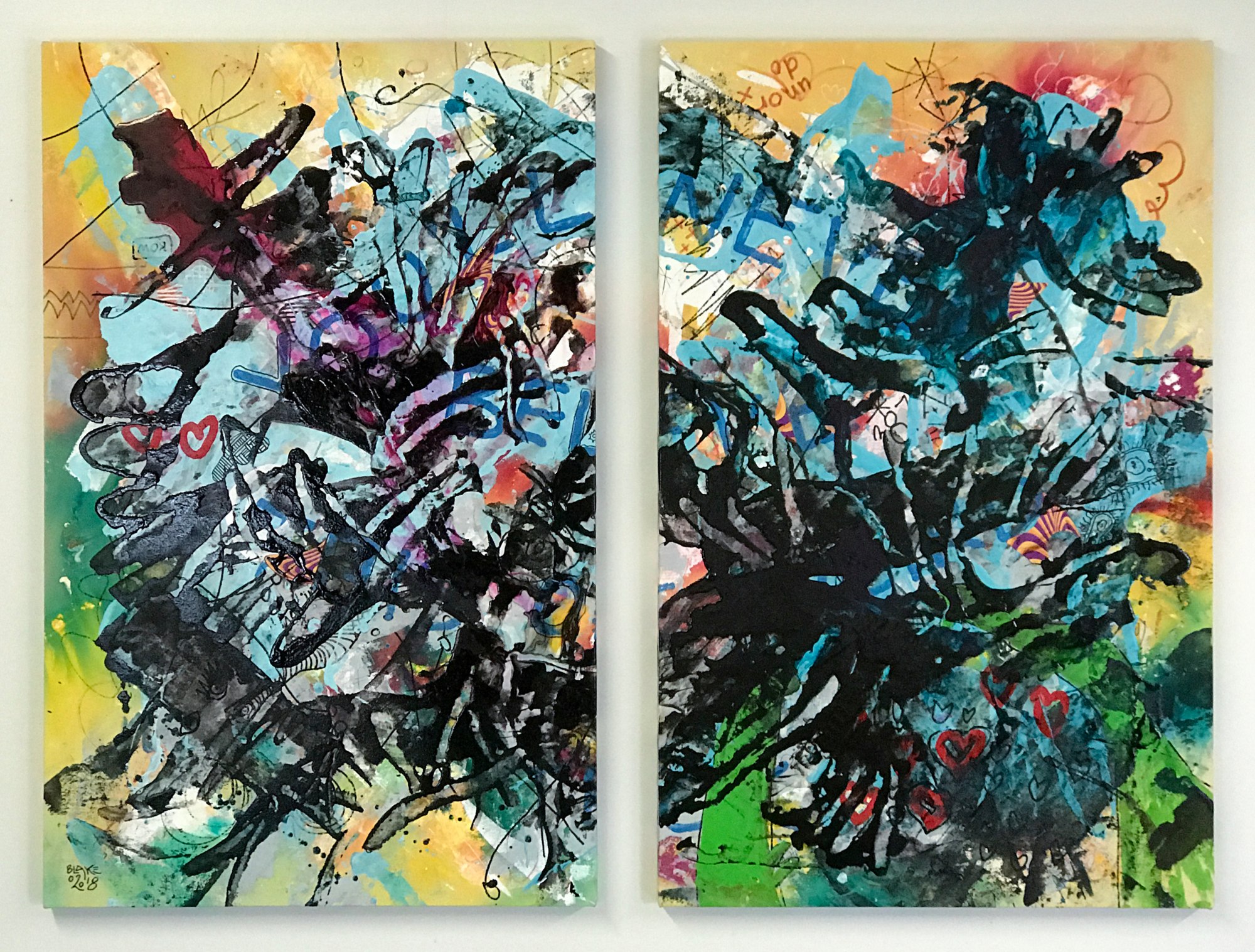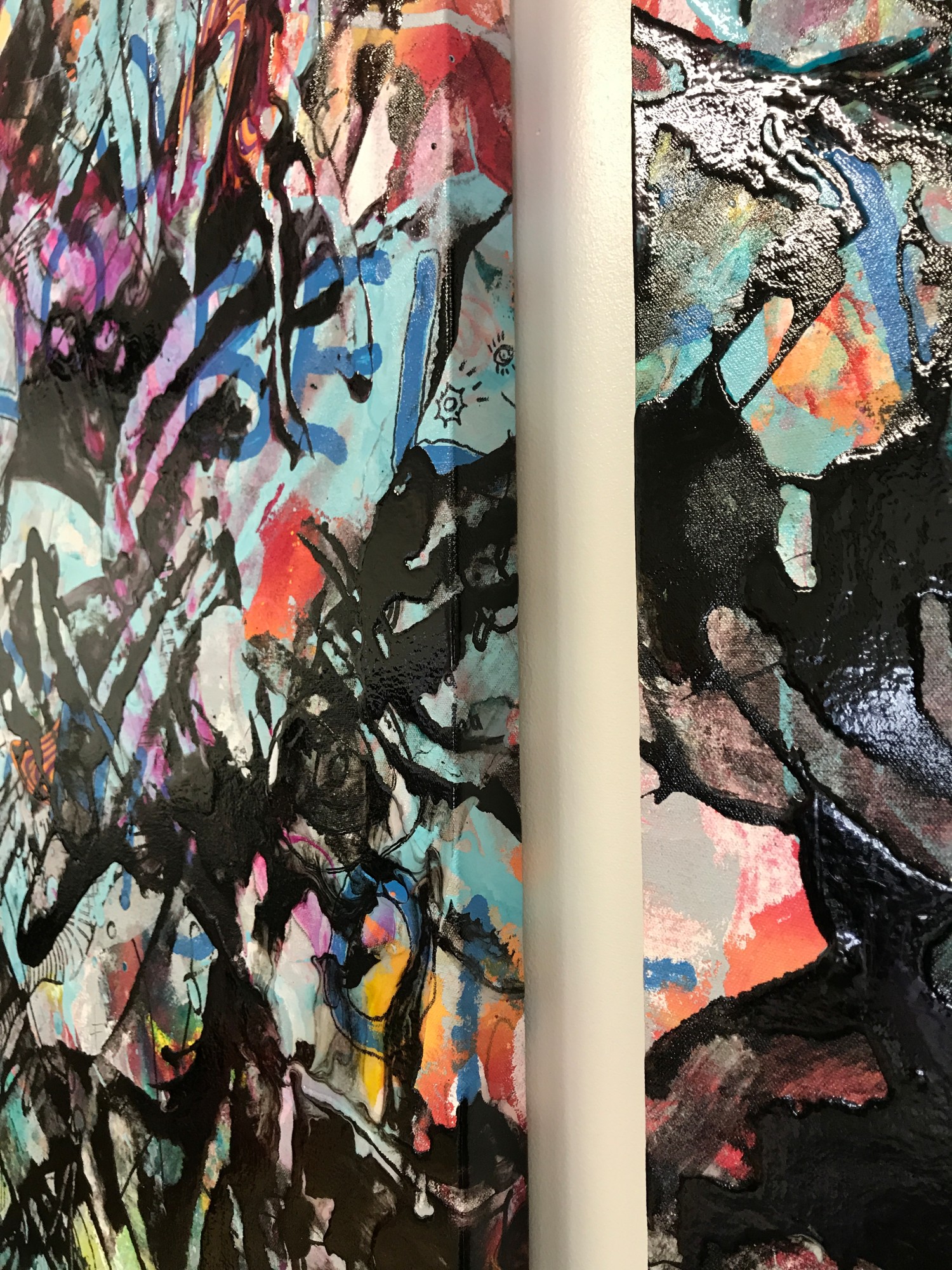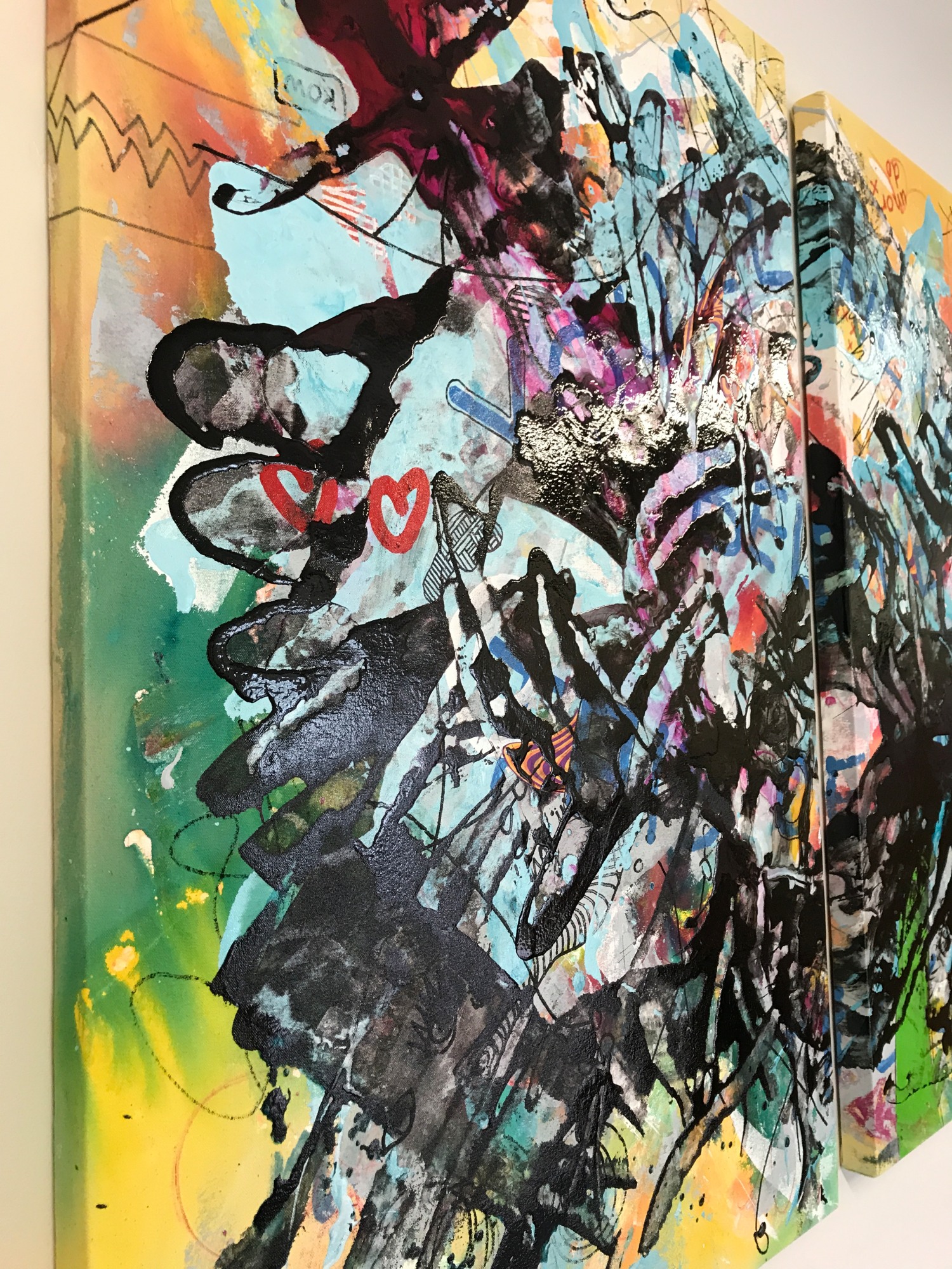 This is a wild, colorful abstract composition with a lot of gestural movement in it. It's composed of layers of poured paint, smeared paint, and some marker doodles over stained raw canvas. It is a diptych (a painting on two panels). Each panel is 40 x 26 inches. I painted it on loose, raw canvas and stretched it after the paint was dry, so the composition wraps around the edge.