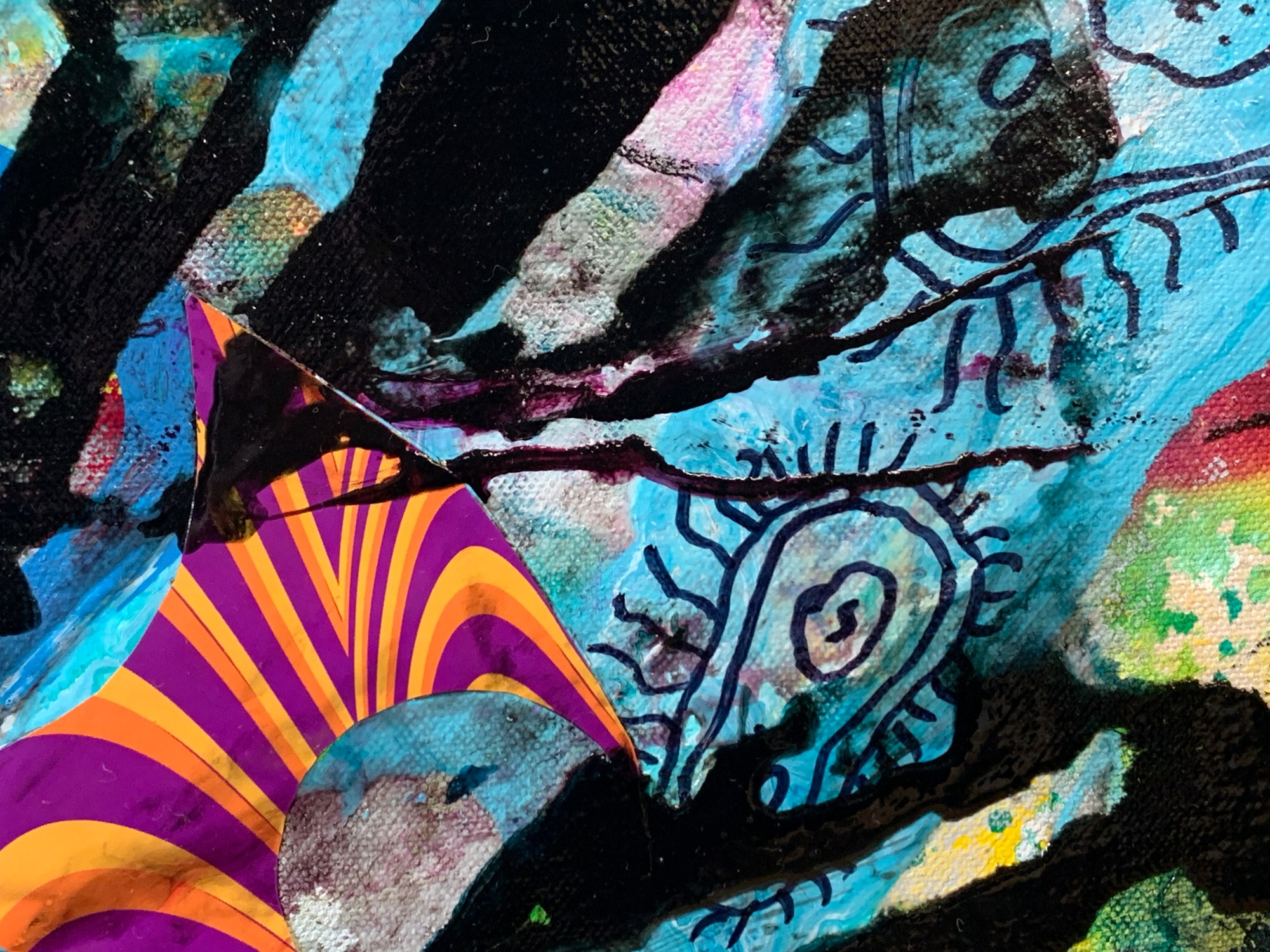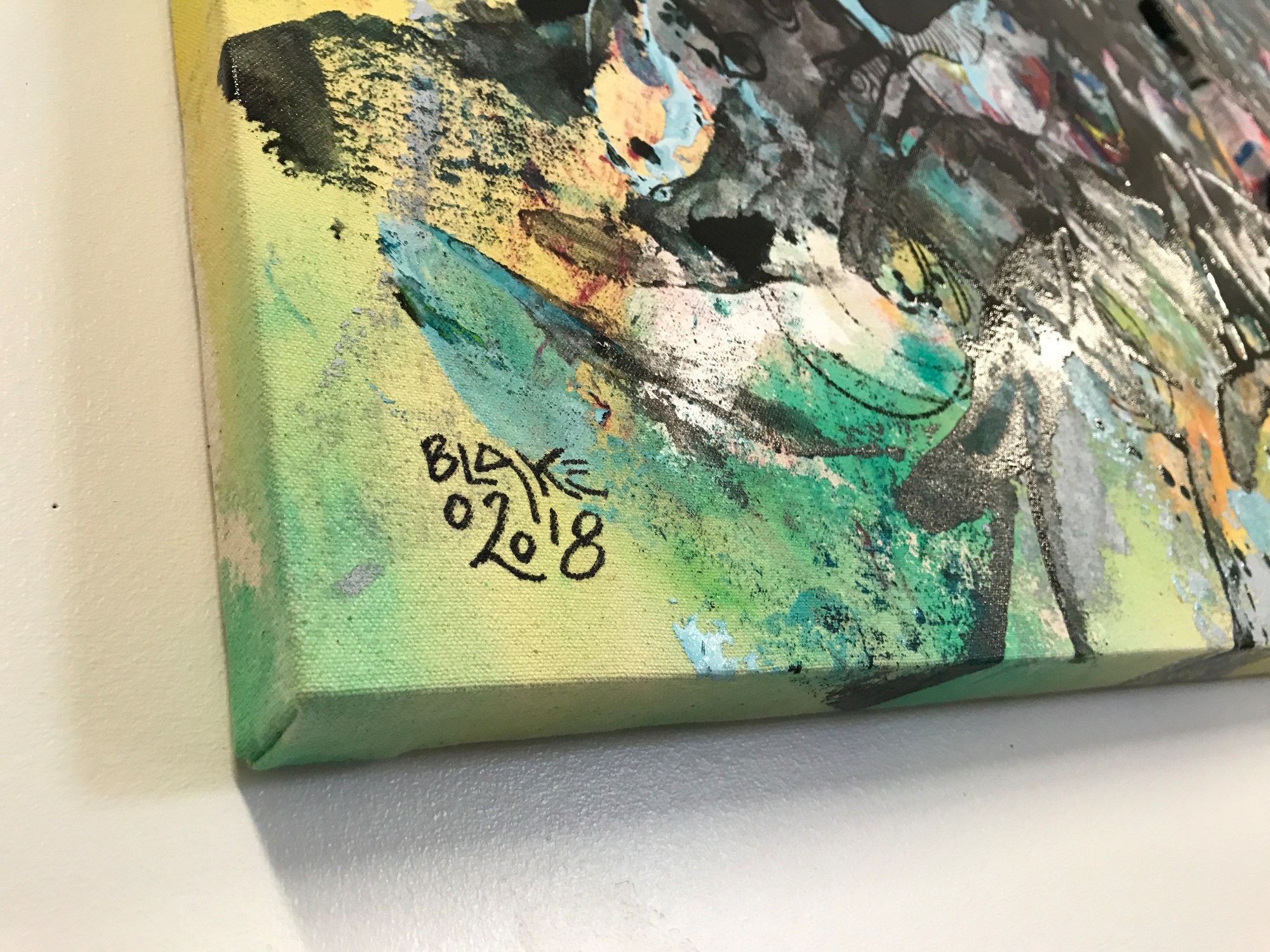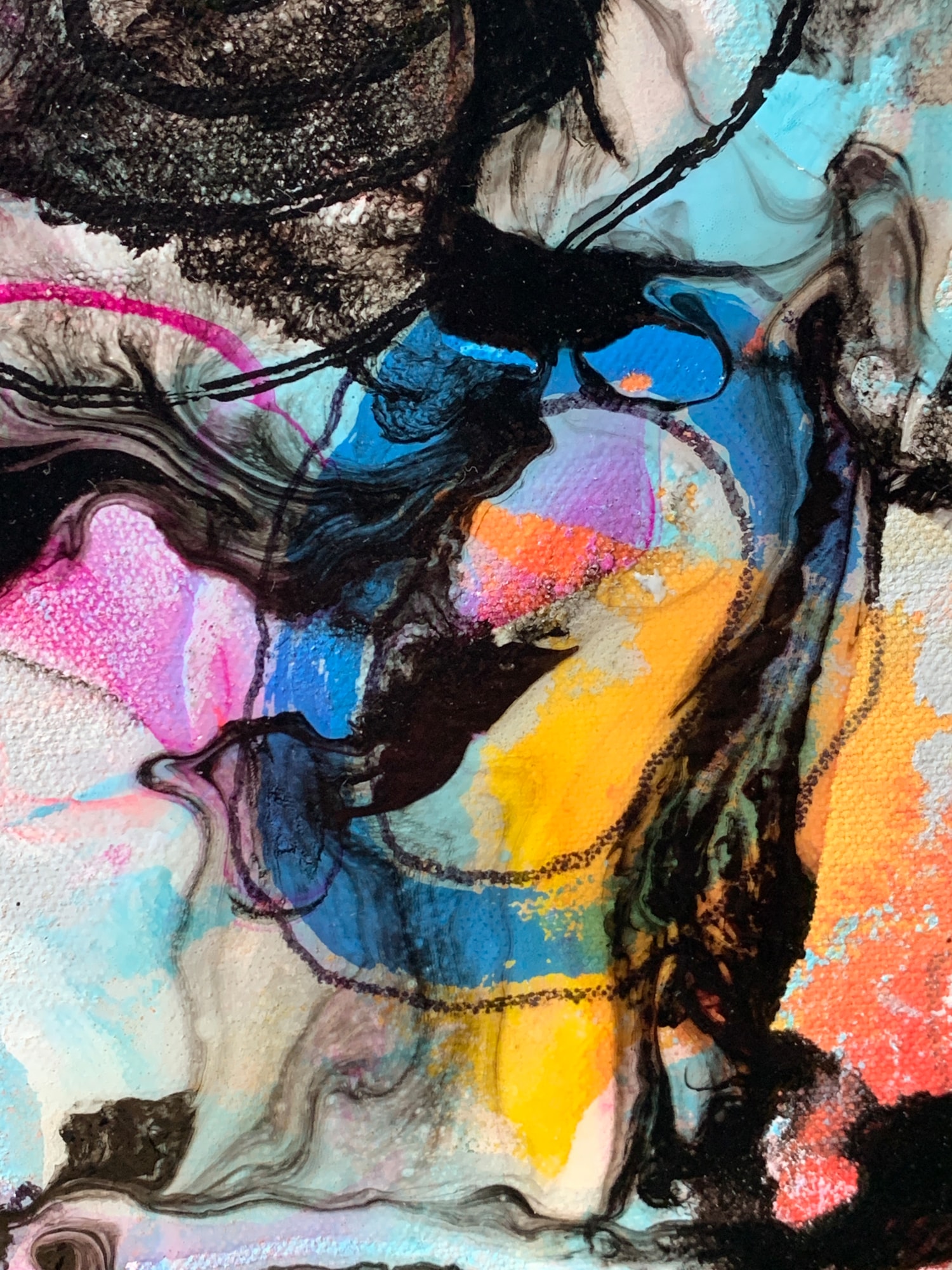 This is a wild, colorful abstract composition with a lot of gestural movement in it. It's composed of layers of poured paint, smeared paint, and some marker doodles over stained raw canvas. It is a diptych (a painting on two panels). Each panel is 40 x 26 inches. I painted it on loose, raw canvas and stretched it after the paint was dry, so the composition wraps around the edge.