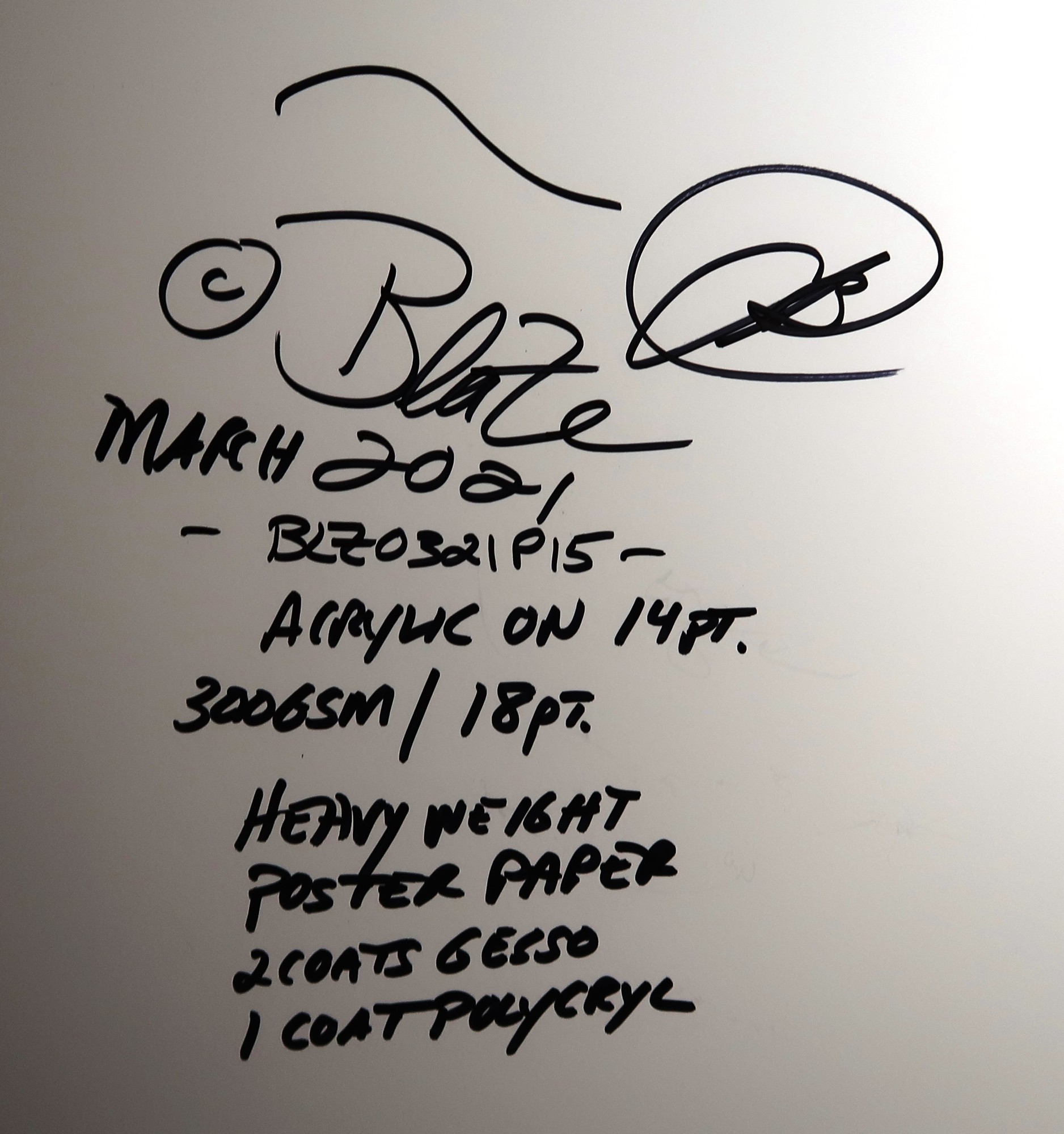 *DETAILS – Acrylic paint and other media on heavy weight (140lb. / 300gsm / 18pt.) acid-free poster board / paper prepped with two coats of gesso.
