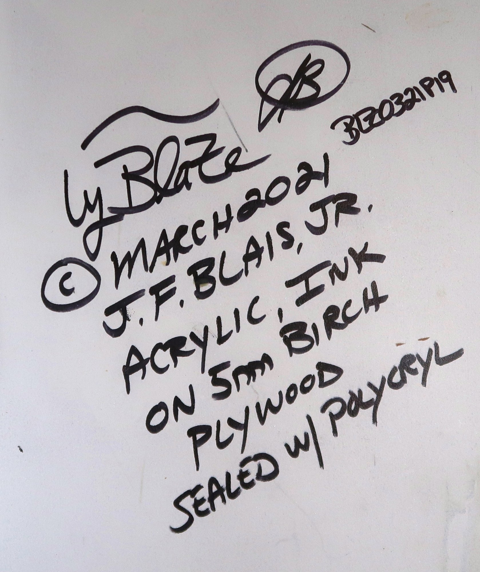 DETAILS – Acrylic paint and other media on birch plywood panel prepped with three coats of gesso.