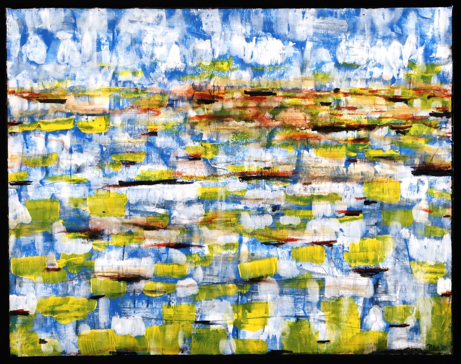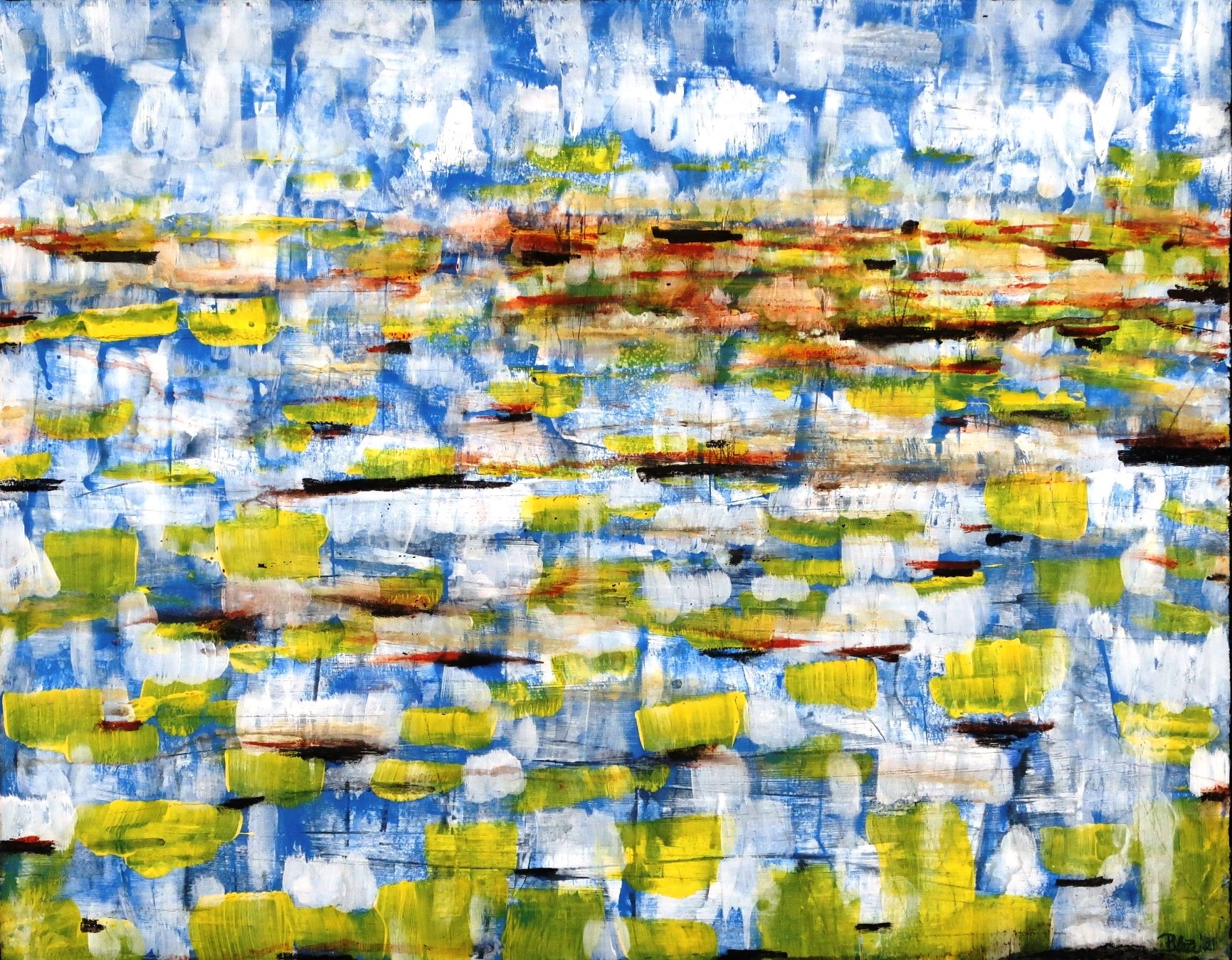 ARTIST'S NOTE: "Lily Pond (Summer)" is one in a series of four impressionistic, abstract artworks on hardboard imagining Monet's Water Lily Pond (1899) lush with lilies in summer. Summertime, when the pond is cover with lilies is the season when Monet's obsessive angst about painting water lilies caused him much angst because of some personal loss and self doubts from old age.