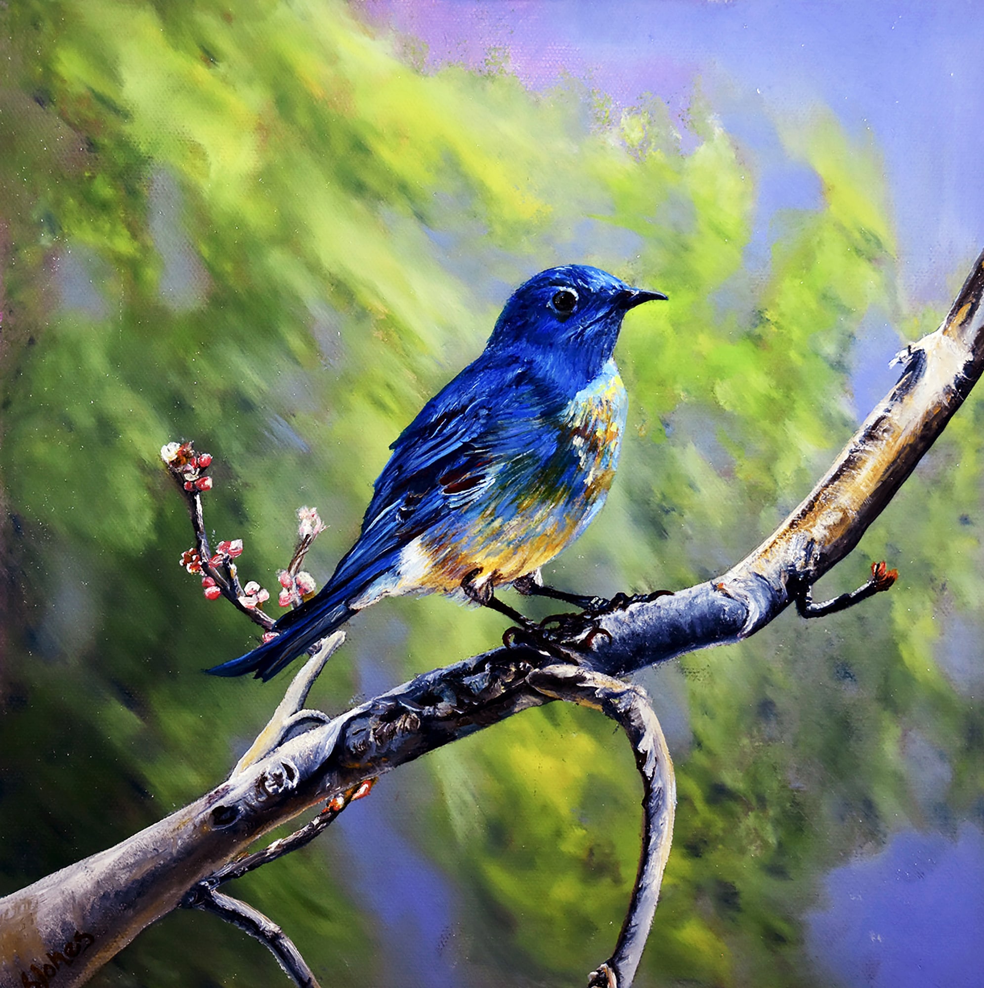 "Step into the beauty of nature with our vibrant painting, "Bluebird." This stunning artwork captures the striking mix of deep blues, yellows, and whites of the bluebird's plumage as it perches on a delicate branch adorned with pink blossoms. The soft-focus spring or summer landscape background adds a peaceful, naturalistic feel, making it the perfect addition to any art collection. Bring the beauty of the outdoors into your home with "Bluebird.".