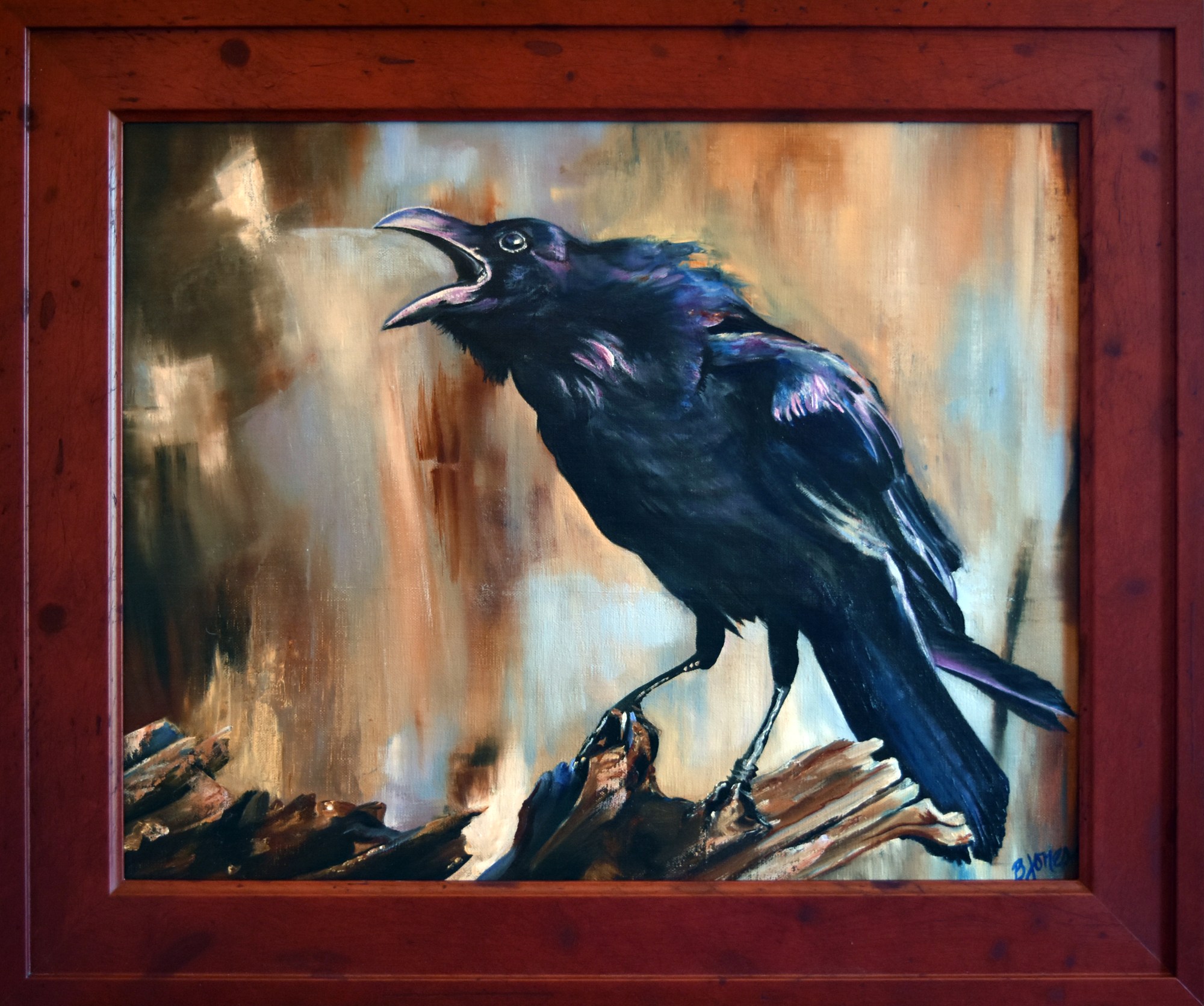 I used a more expressionistic style when painting this very confident Raven! He was talking loudly on one of our fence posts and I wanted emphasize his brazen behavior as he tended to ignore me and my camera. It was a great catch!