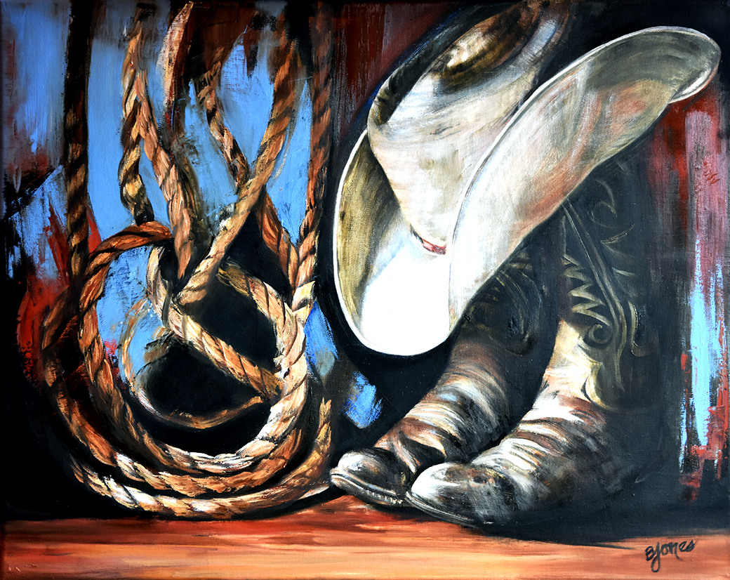 "Living the Dream" is a still-life of a few tools that make ranching a reality; a worn cowboy hat, scuffed boots and a well-used rope. So many things make ranching worthwhile, but living the dream is when you wake up and get to work. A quote from Will Rogers is on point, and states, "What this country needs is dirtier fingernails and cleaner minds."