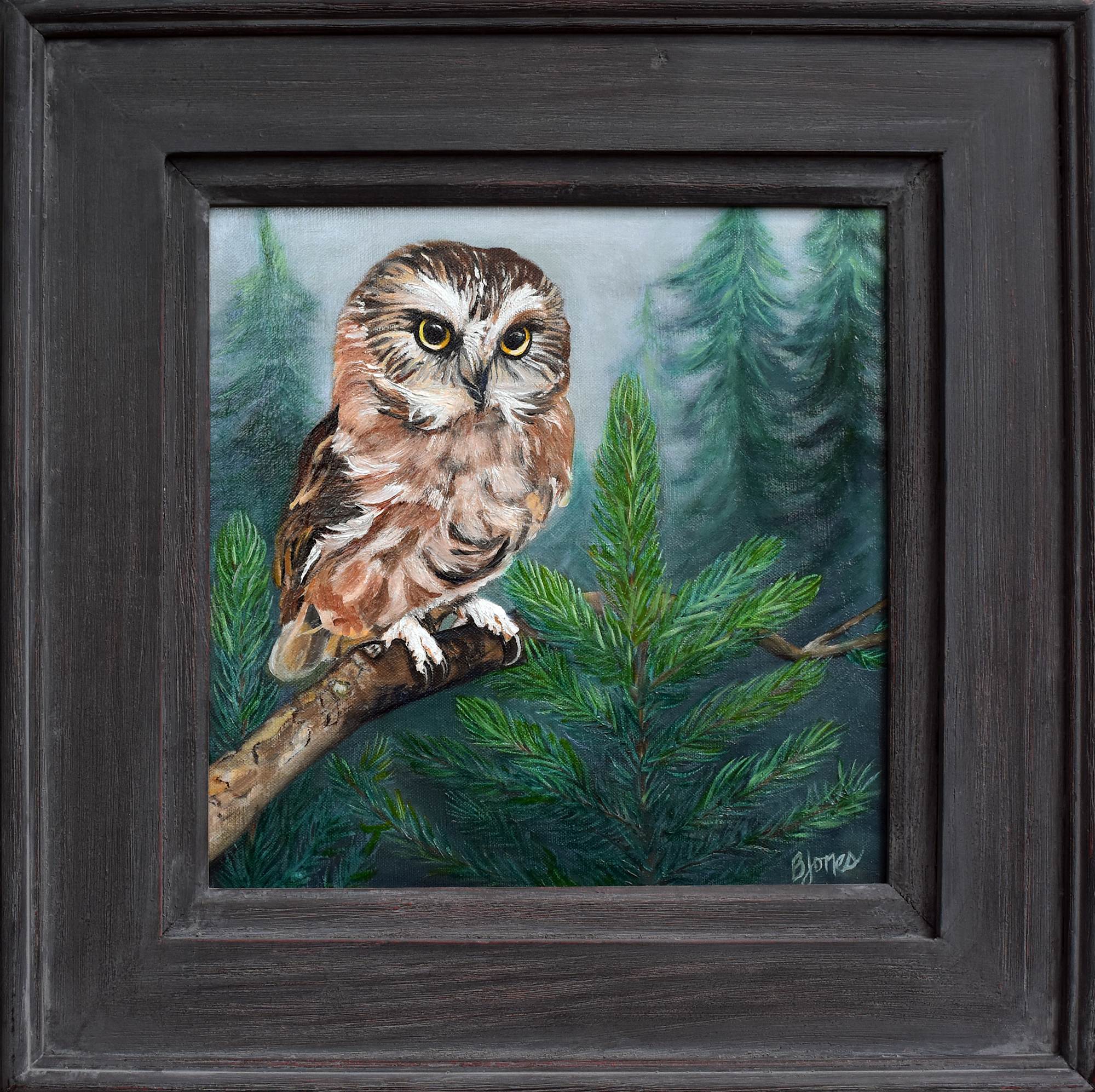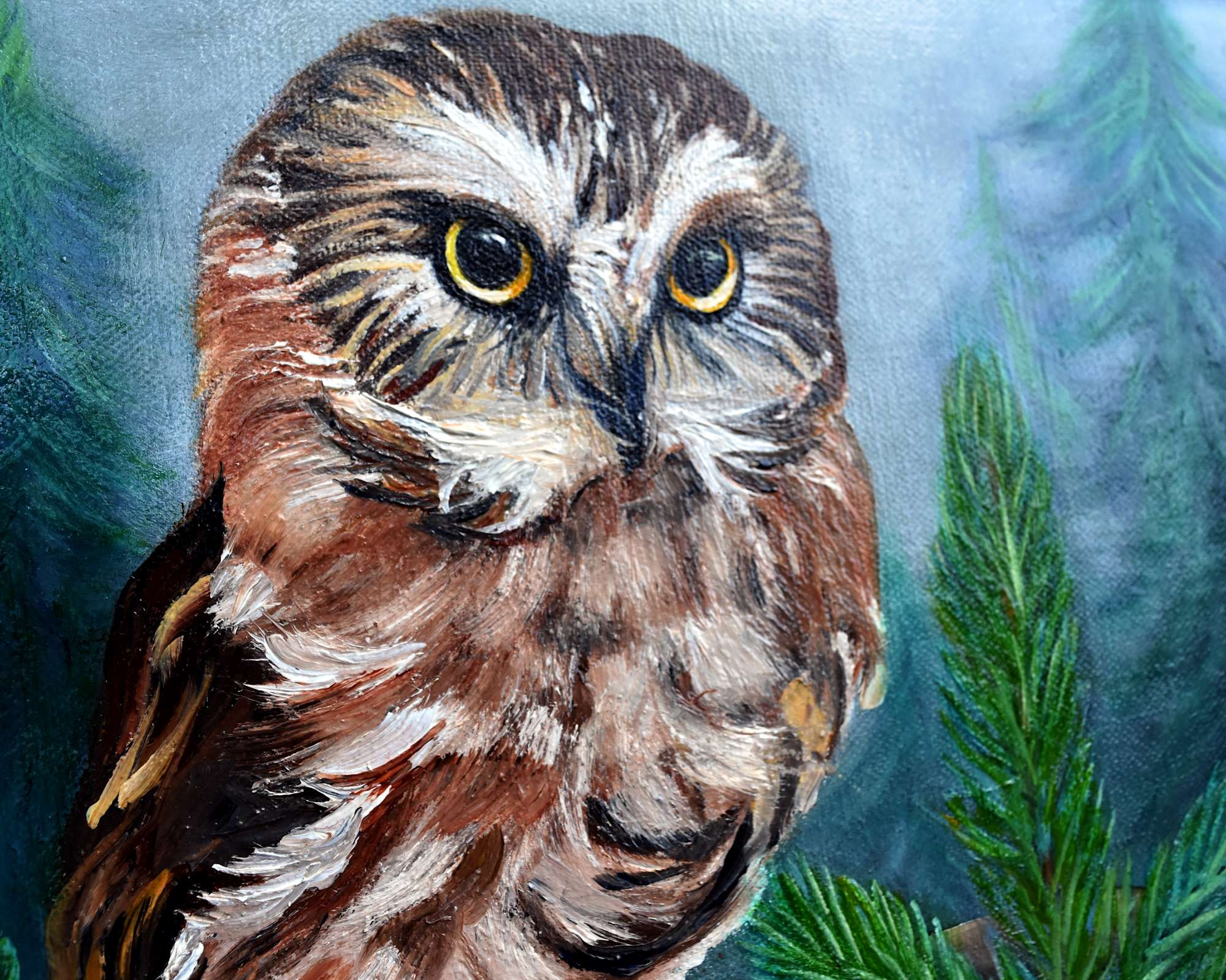 "Whimsical Watcher, a Northern Saw-Whet Owl" features a beautifully detailed owl perched among forest greenery. With its striking eyes and lifelike feathers, this artwork invites viewers into the serene world of wildlife, making it a perfect addition to any nature lover's collection.