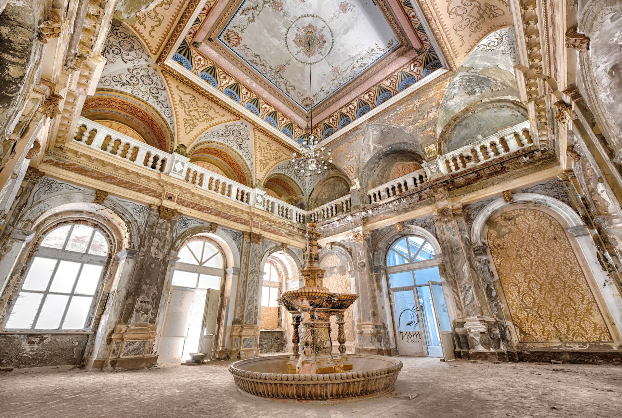 Reception is part of the Inheritance Series. The image portrays the decayed interior of the reception area of Villa Neptune, an abandoned thermal spa in Herculane, Romania. The photograph was taken in 2019 and printed in 2019 on Epson's Hot Press Bright (Smooth Matte) paper 330 g/m, 100% cotton. It is a dry mounted, Archival Pigment Print.