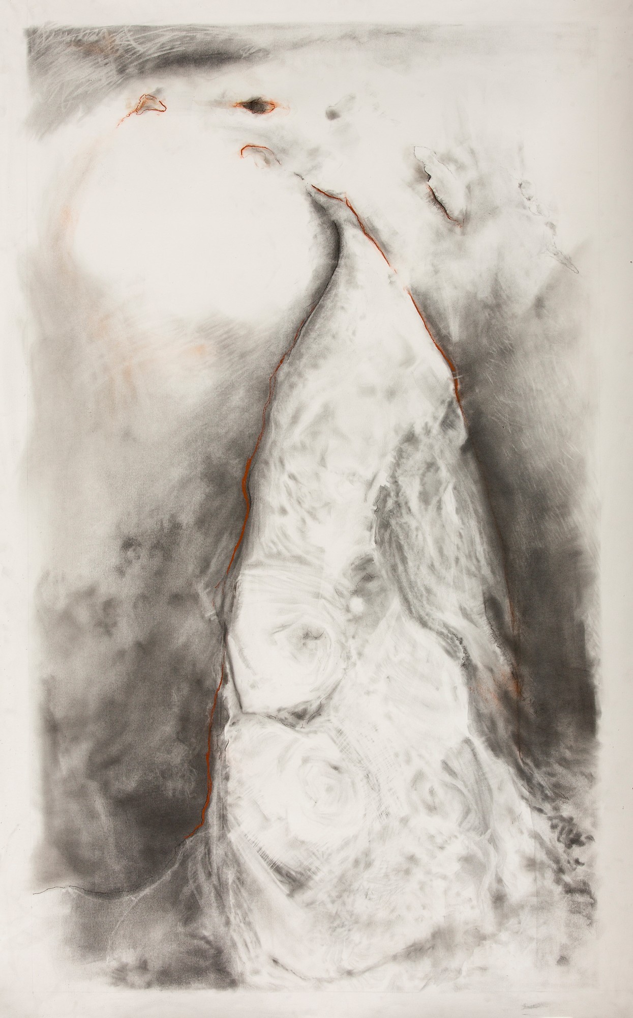 Graphite Drawing on Stonehenge paper from Landforms series. Crossing Canada from one coast to the other by air involves multiple flights in a meandering flight path over ocean, inland waterways, various mountain ranges, wide swaths of prairies and long stretches of boreal forests with the occasional city interspersed throughout. Land Ends is inspired by the point where the North Mountain and Digby Gut in Nova Scotia, a leftover geographic upheaval of the last Ice Age, begins its descent into the Bay of Fundy.