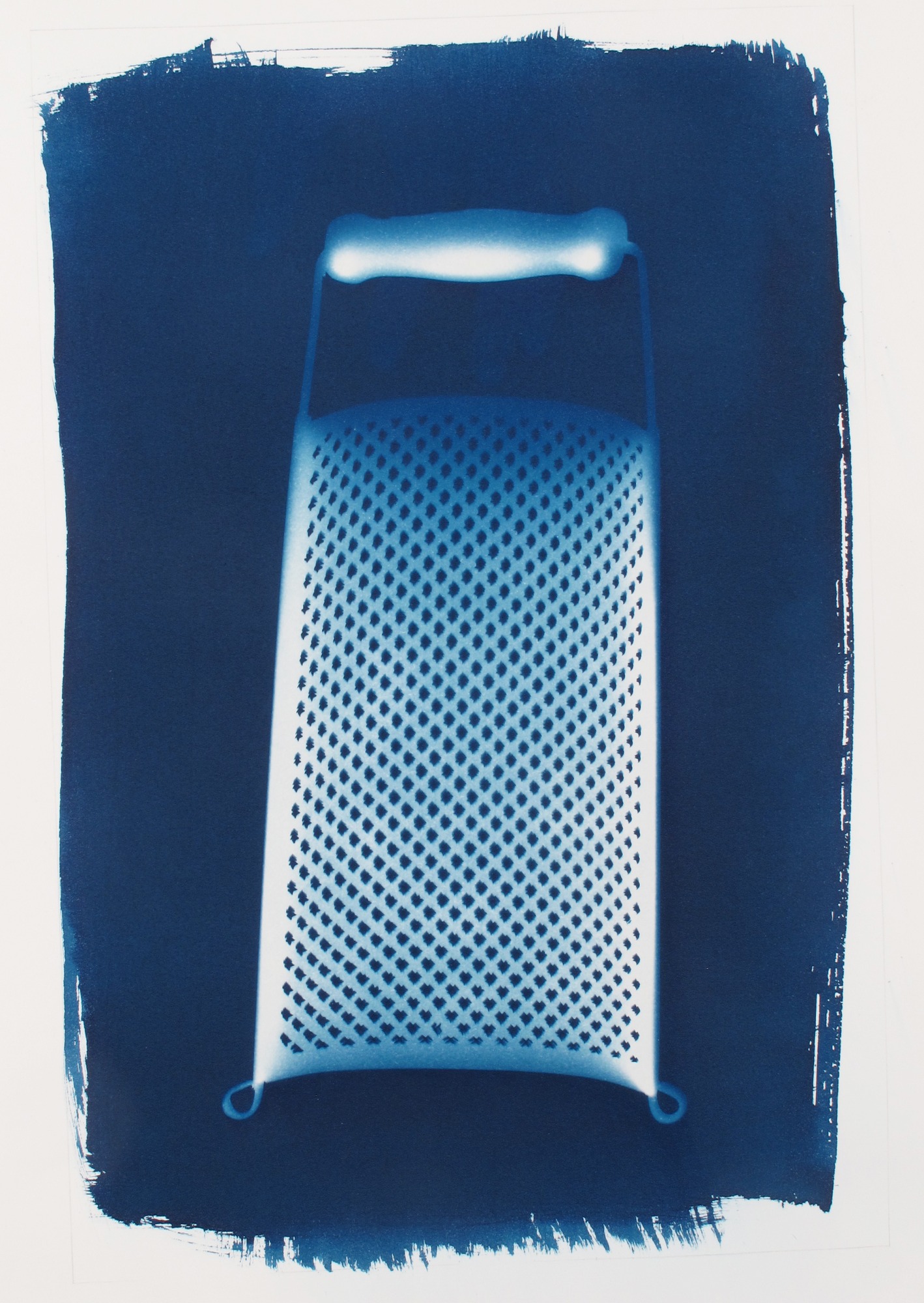 Unique Cyanotype on Stonehenge paper made with vintage potato grater. Custom framed in hand stained white birch and floated on archival board.
