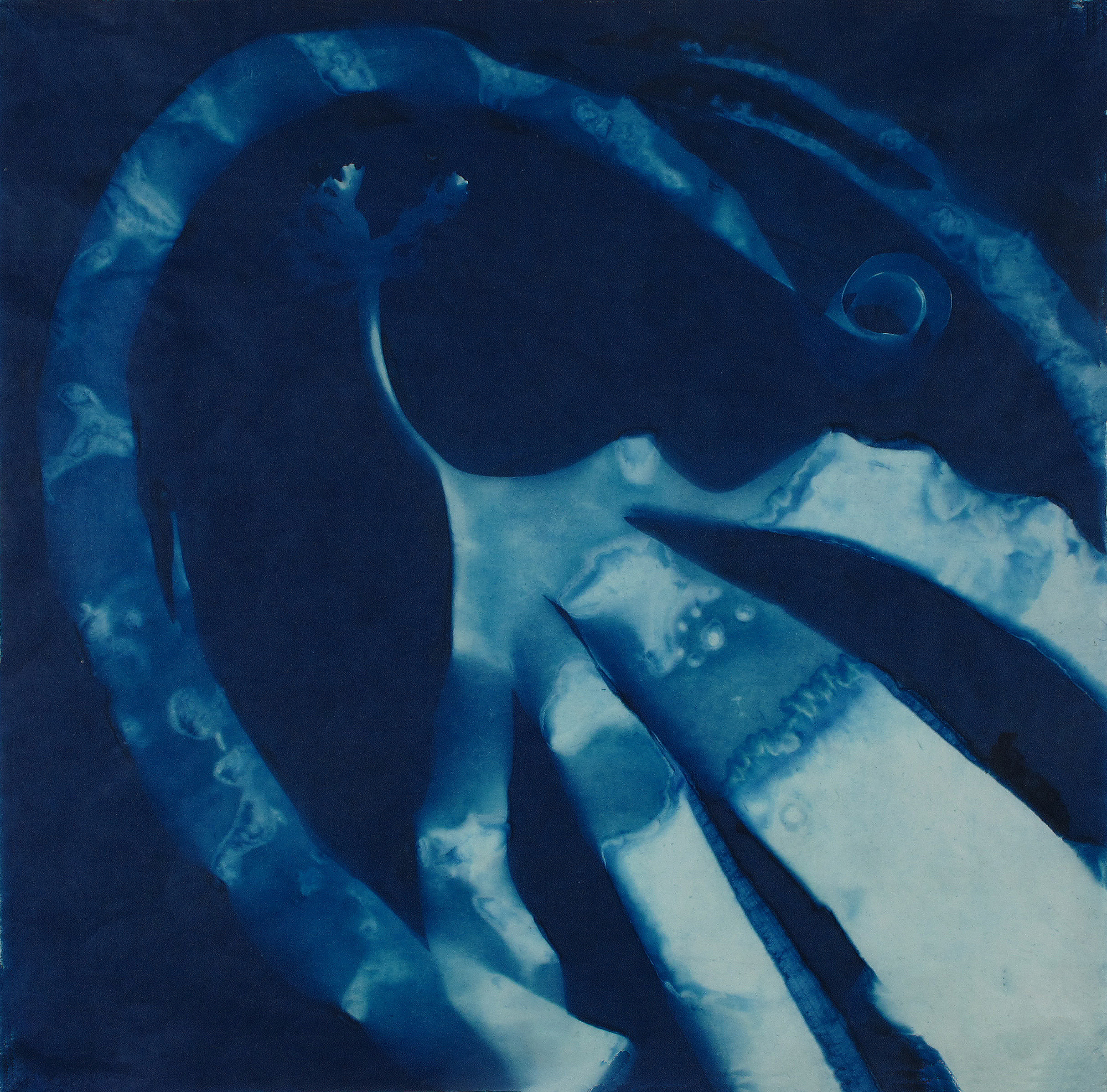 Unique cyanotype on Japanese paper made with kelp frond. Custom framed in hand stained white birch, floated on archival board.