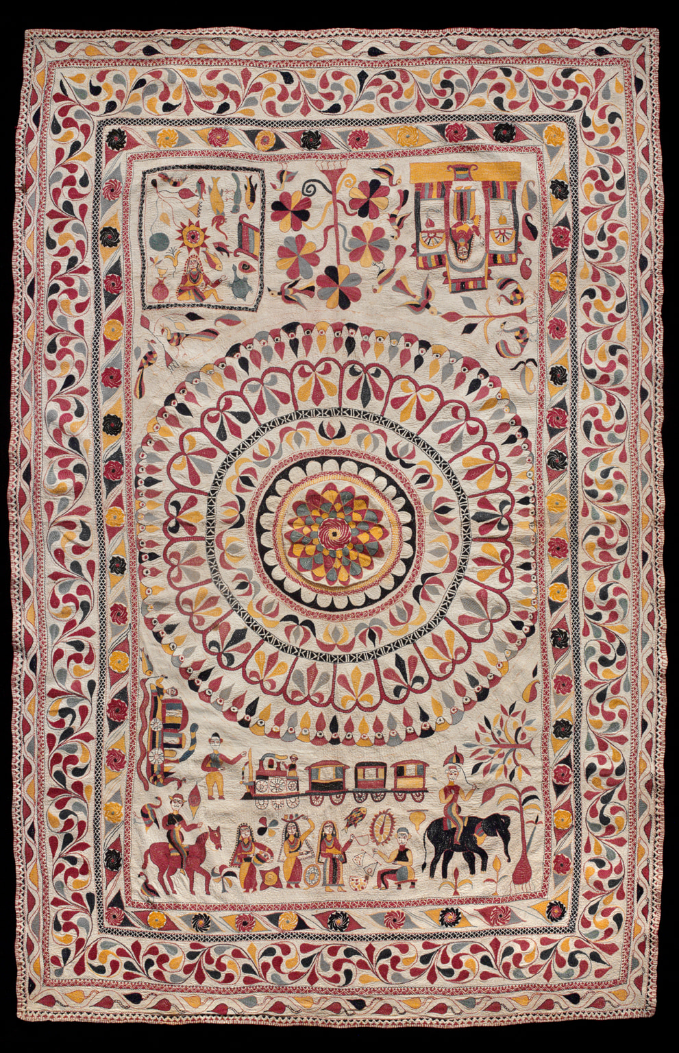 cotton embroidery in back, buttonhole, chain, darning, outline, split, running, staggered running, stem stitch shading, eye, and dot stitches